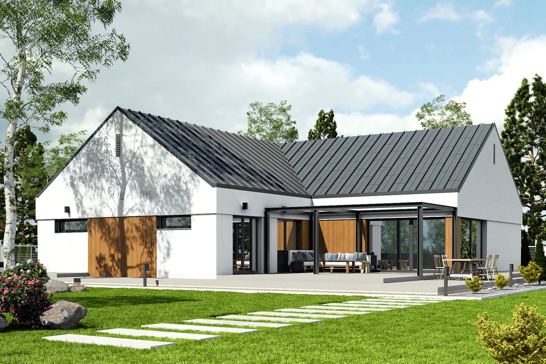 Проект современного одноэтажного дома с гаражом на две машины и террасой.