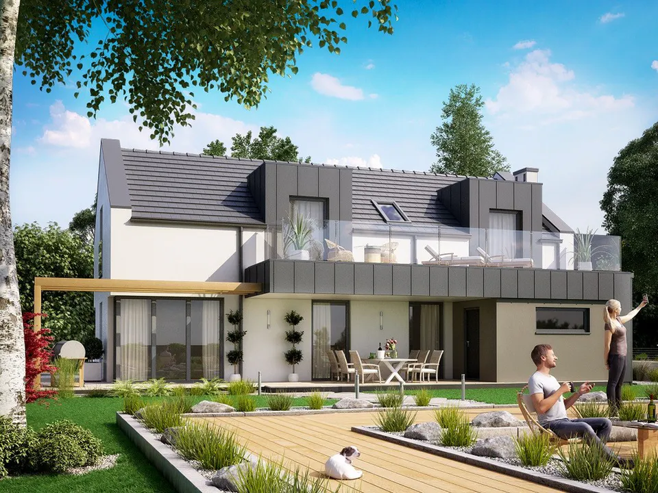 Проект современного дома с мансардой, гаражом и террасой.