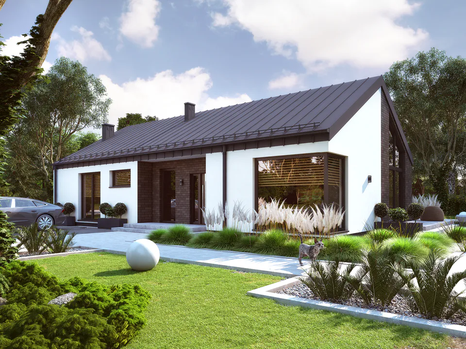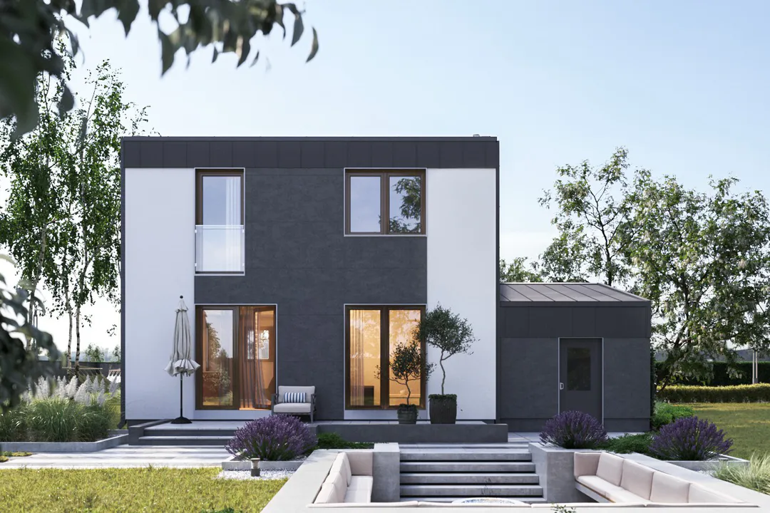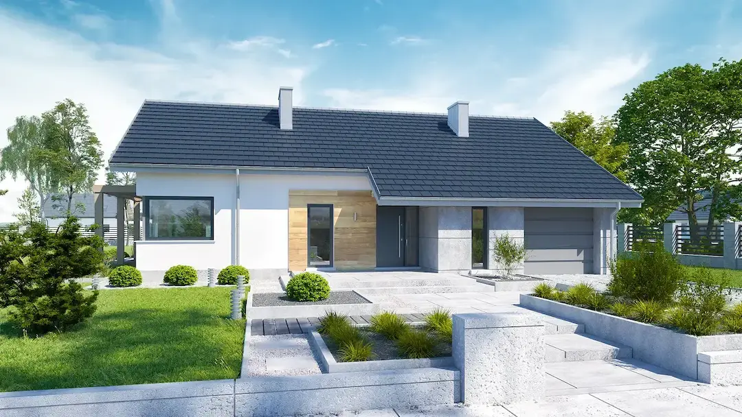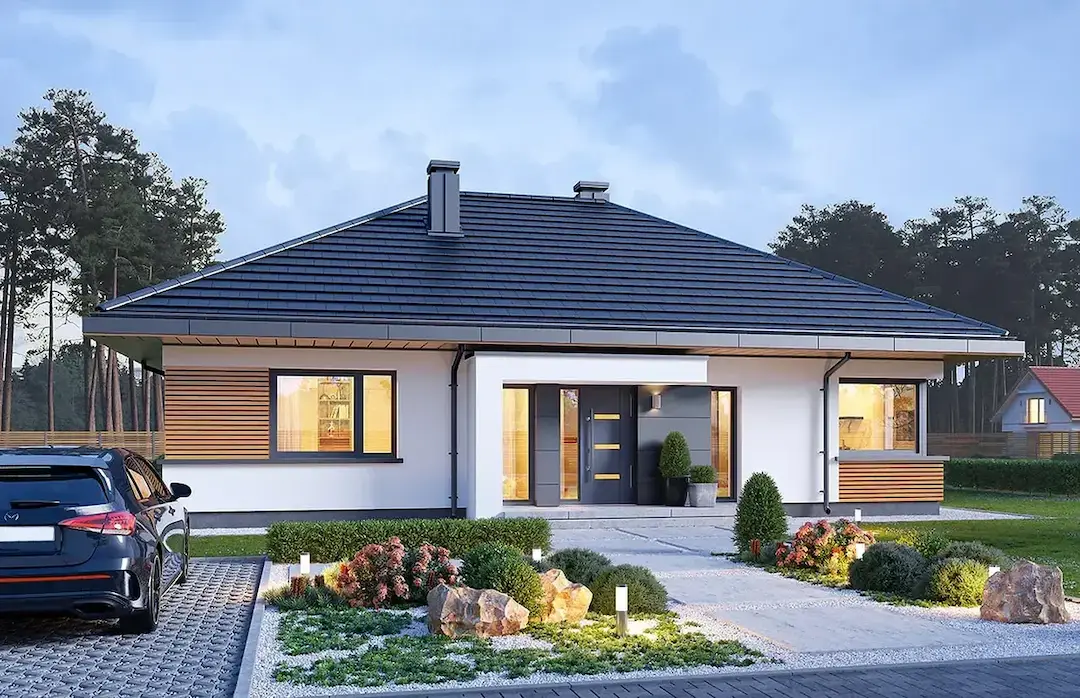 Фасад отделан белой штукатуркой с темно-серой, согреваясь отдельными элементами в оттенке теплого дерева.