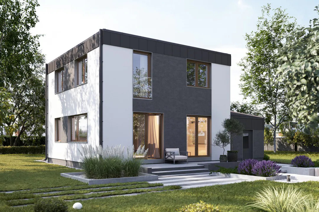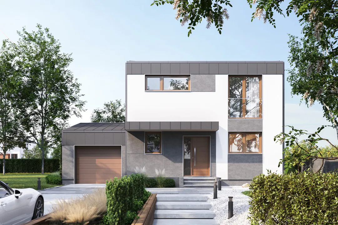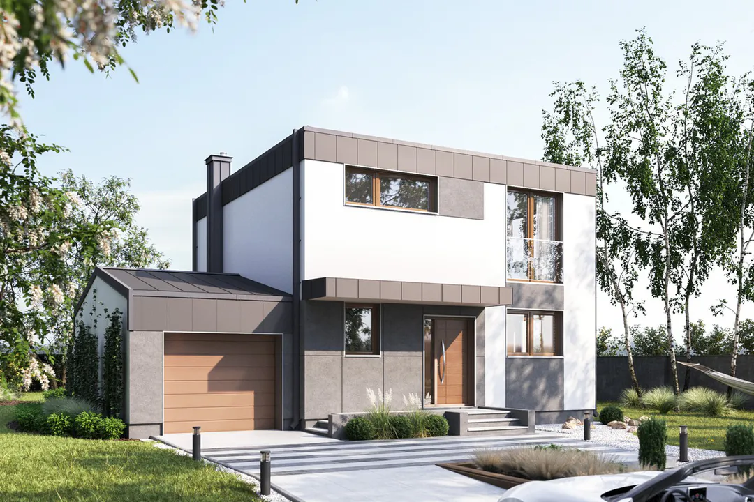 Двухэтажный дом с гаражом привлекает внимание своей компактной формой, увенчанной плоской крышей, а гармонию не нарушают никакие лишние детали.