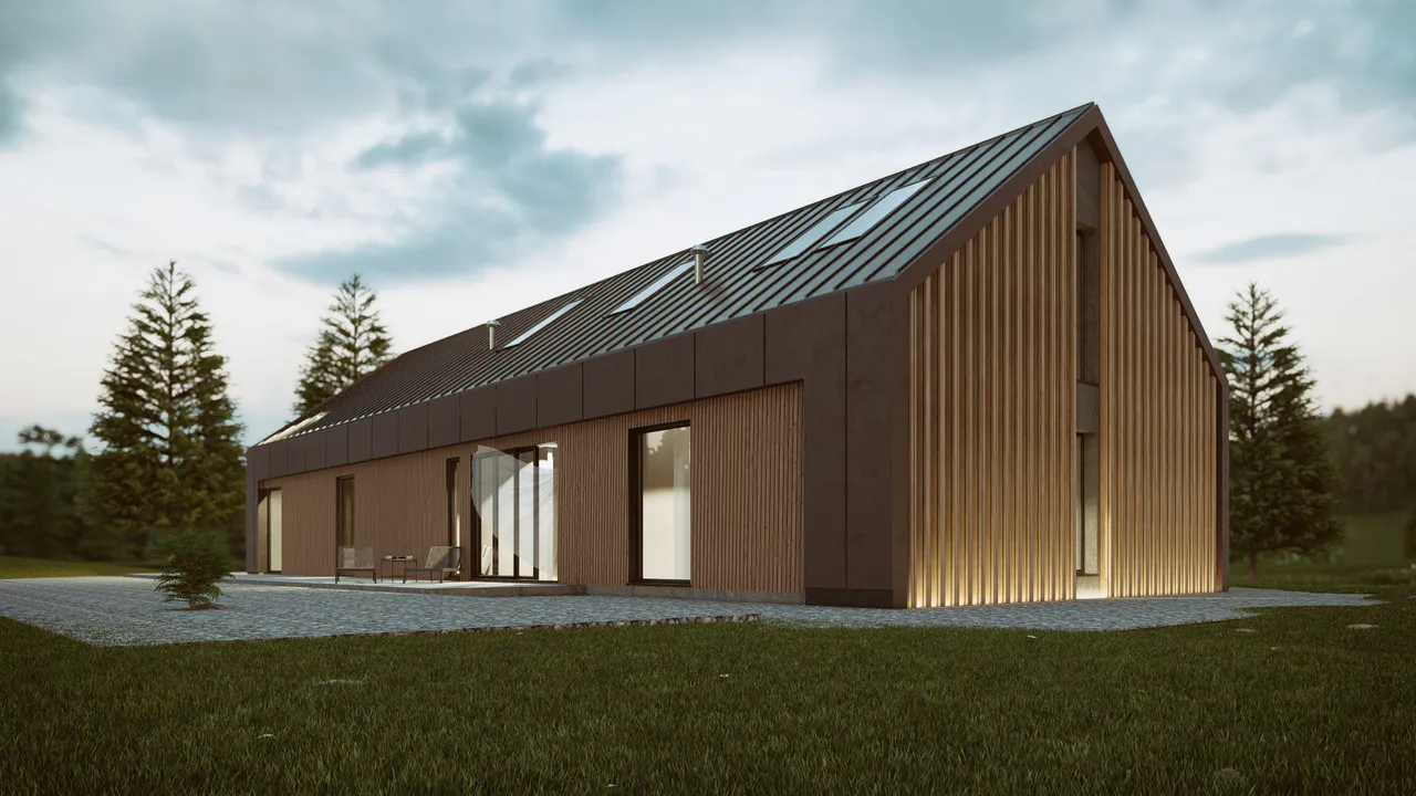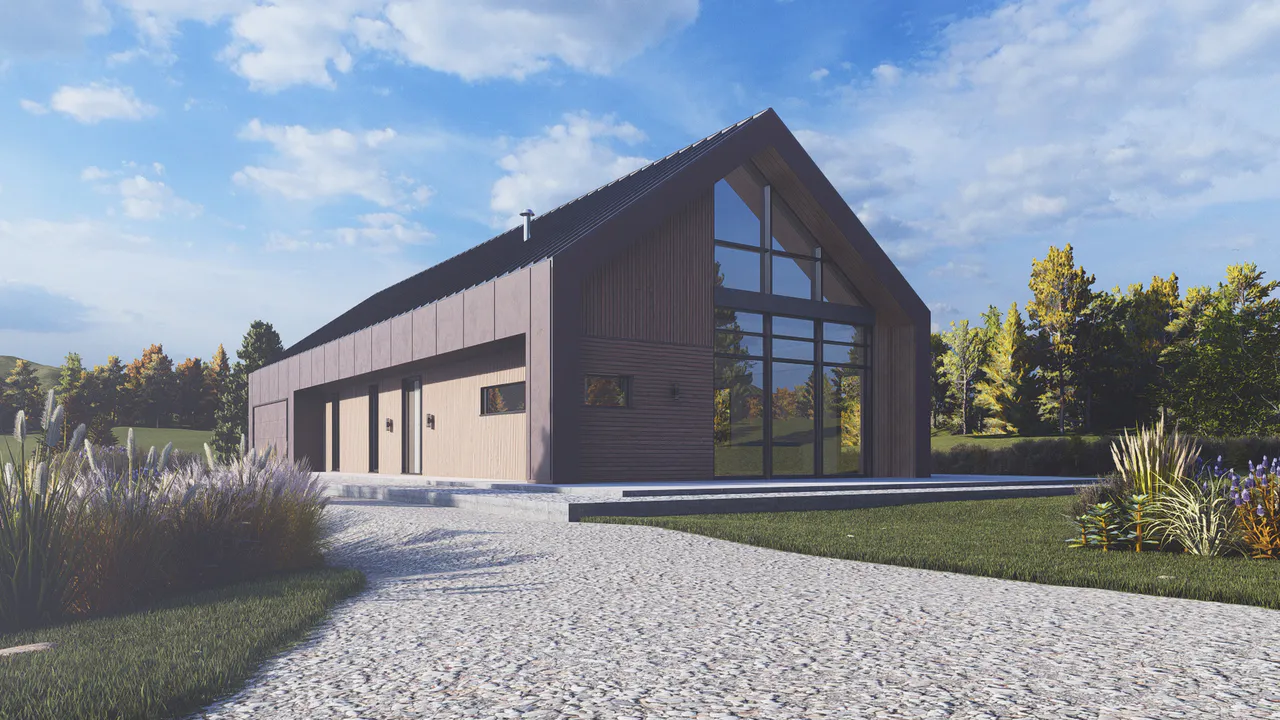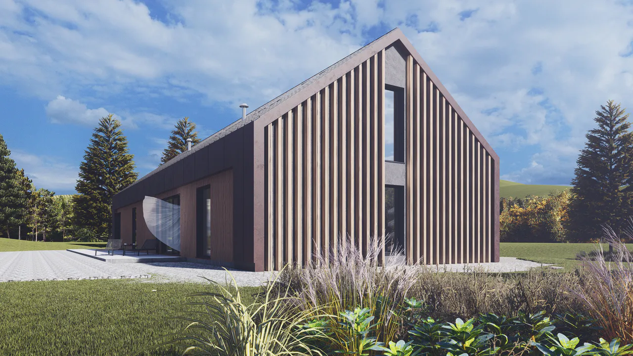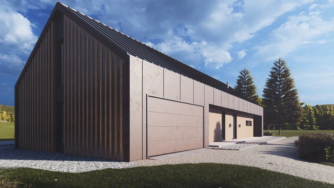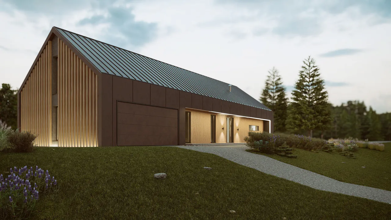 Фасад комбинированный — включены деревянные панели тёплых оттенков и темные элементы фасадной плитки. Крыша двускатная, покрыта темной фальцевой кровлей.