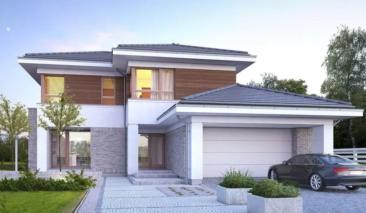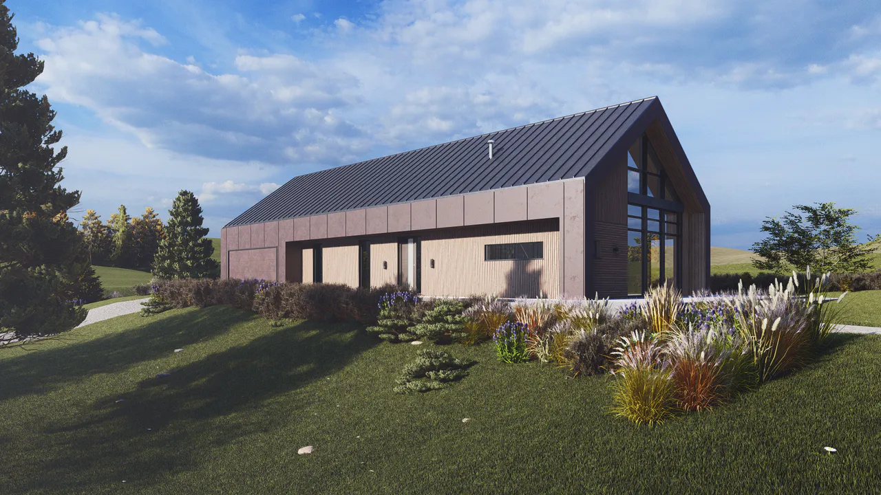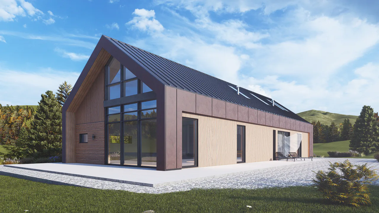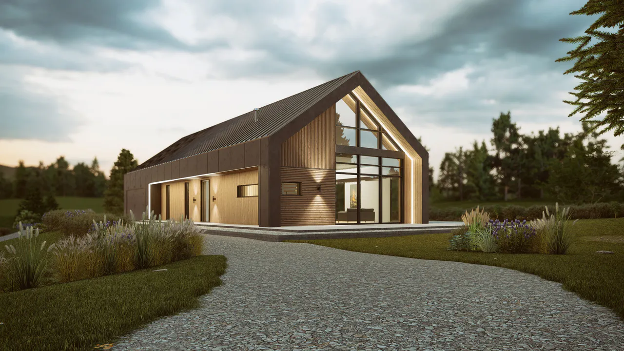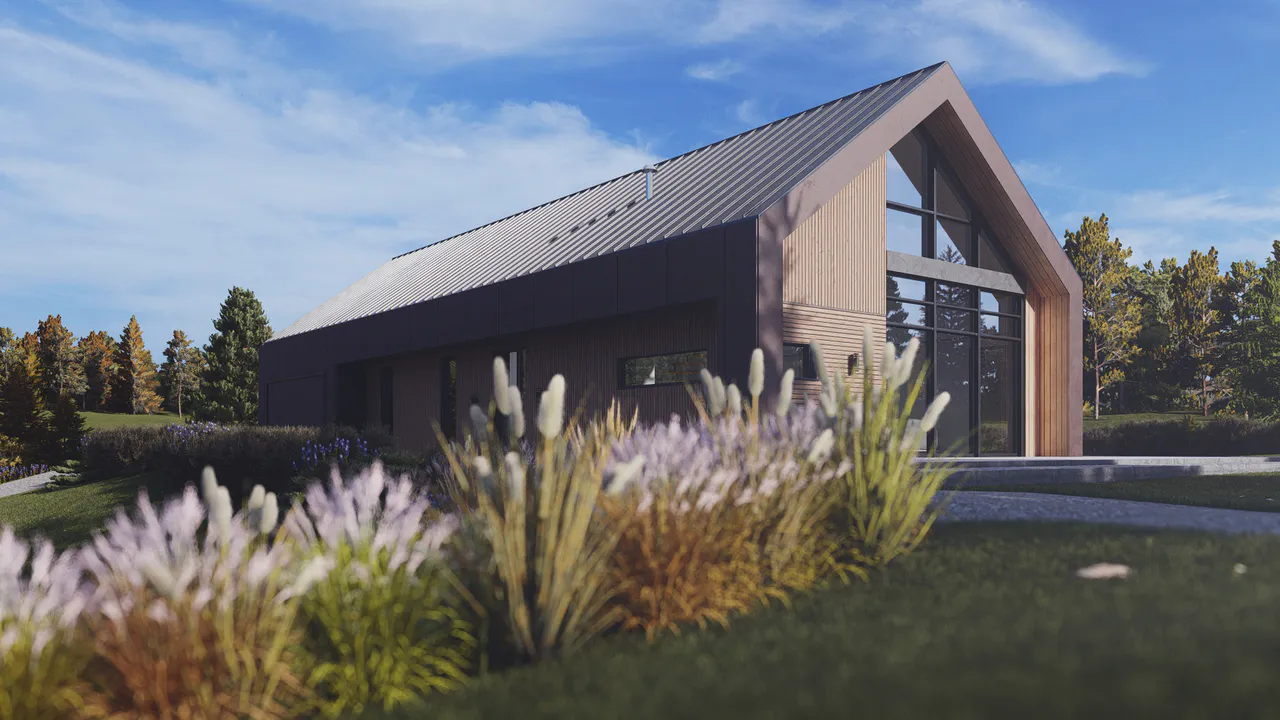 Фасад комбинированный — включены деревянные панели тёплых оттенков и темные элементы фасадной плитки. Крыша двускатная, покрыта темной фальцевой кровлей.