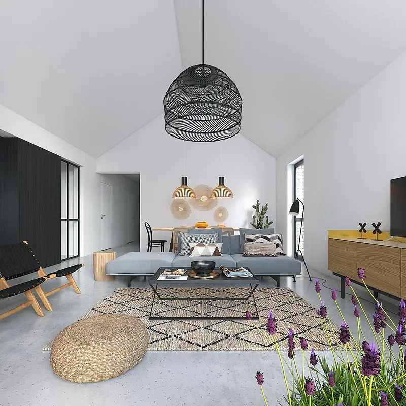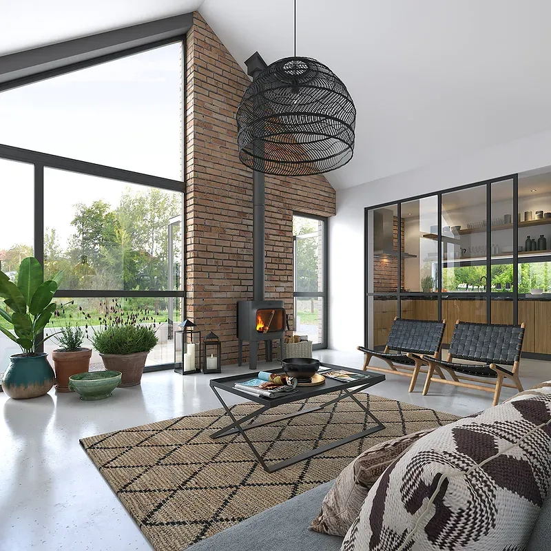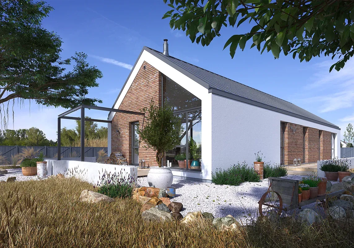 Проект дома с комбинированным фасадом, часть которого выполнена из кирпича, а другая часть окрашена в светлый цвет. Крыша дома двухскатная. Перед домом расположена просторная терраса с деревянным настилом. Над террасой виден каркас, создающий своеобразный козырек и место для отдыха на свежем воздухе.
