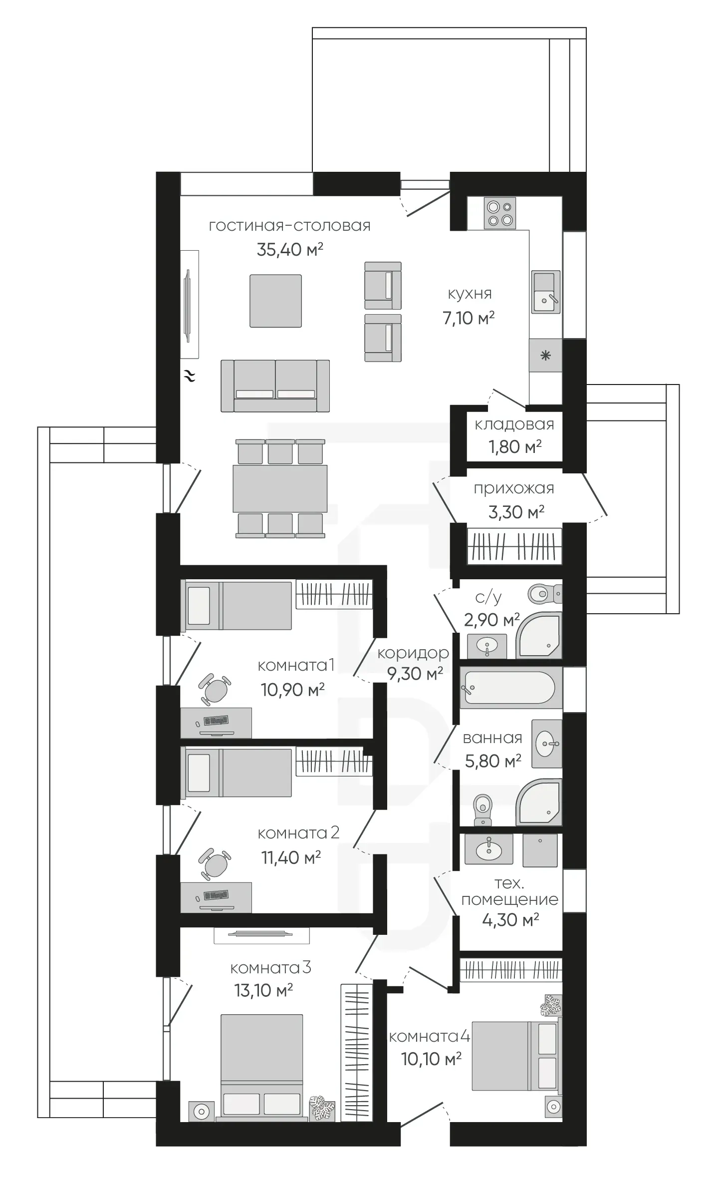 Одноэтажный дом с четырьмя комнатами рассчитан на 4-5 человек.