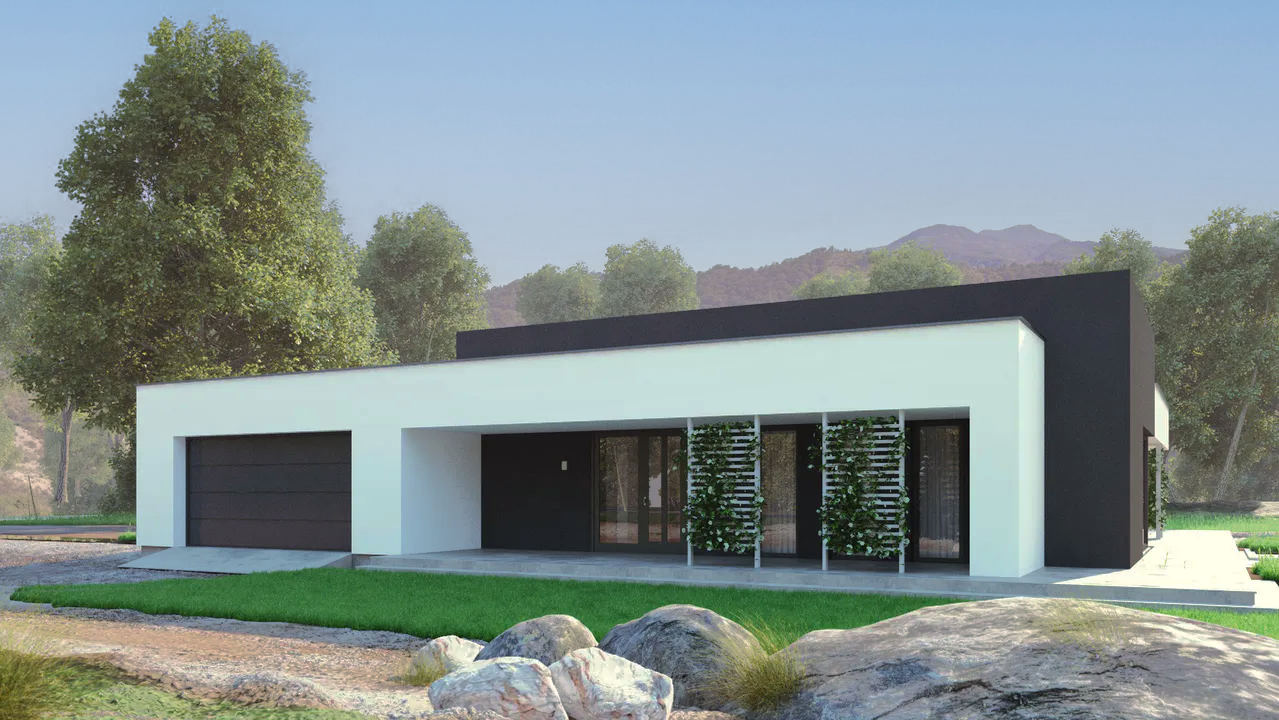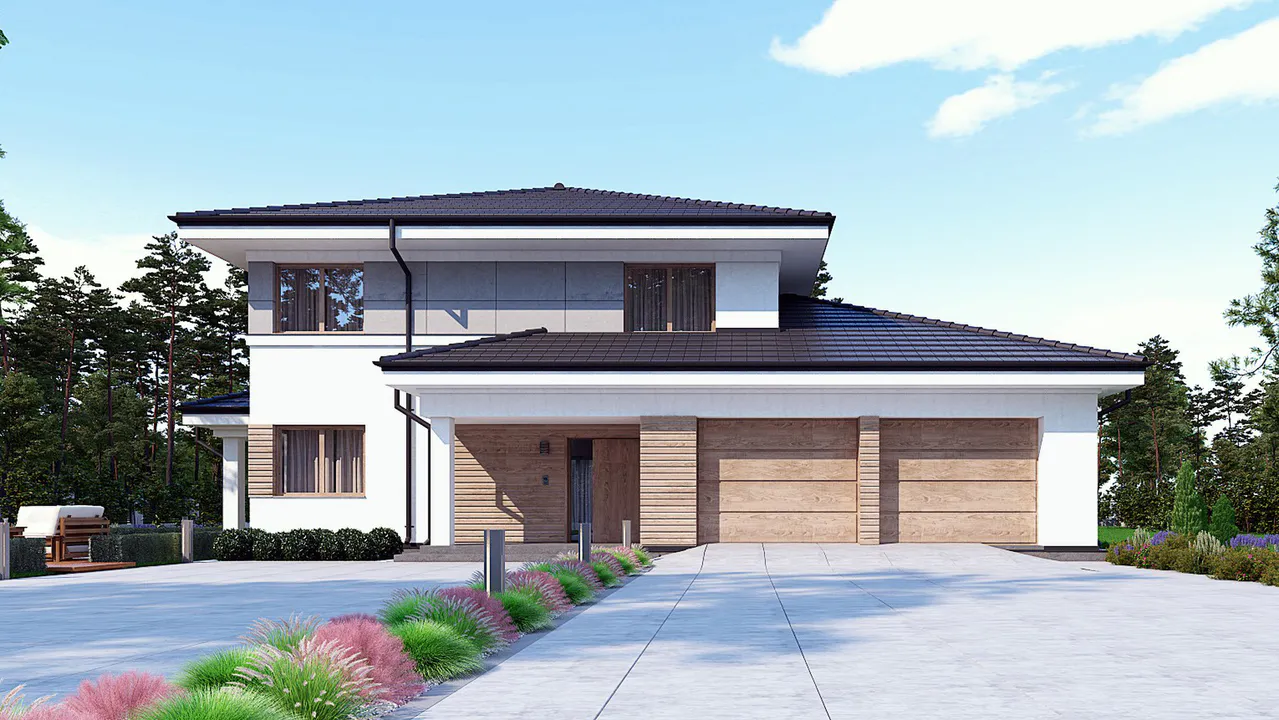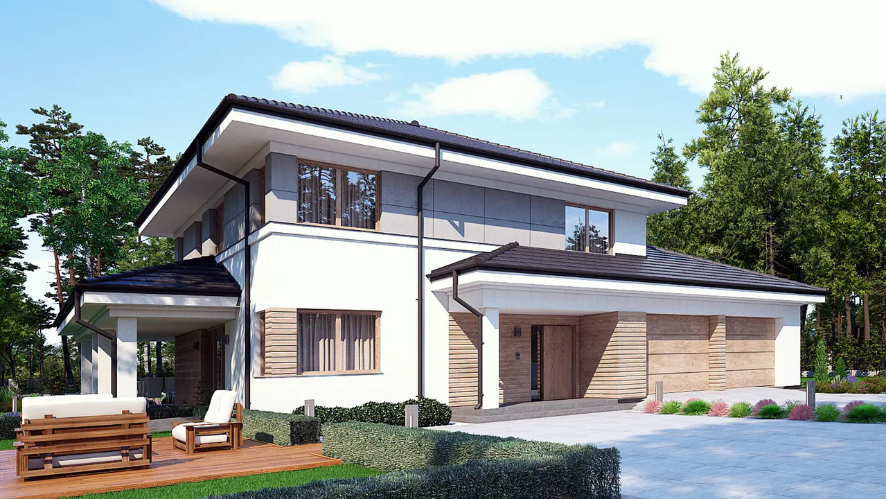 Проект двухэтажного дома в стиле Райт с гаражом и террасой.