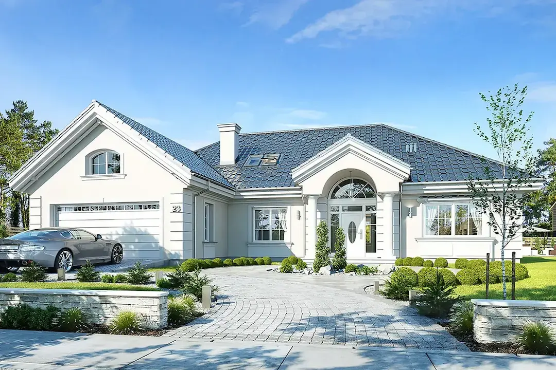 Внешний фасад выполнен в светлых тонах с облицовкой из натурального дерева. Стиль подчеркнут четырехскатной крышей и навесами, заметно выходящими за пределы фундамента и природными материалами.
