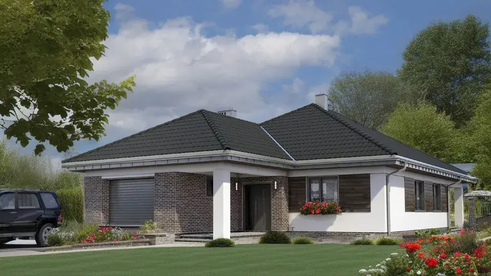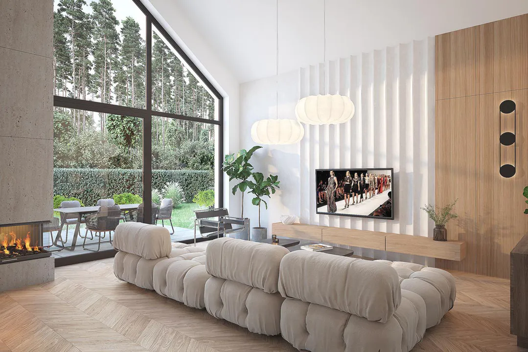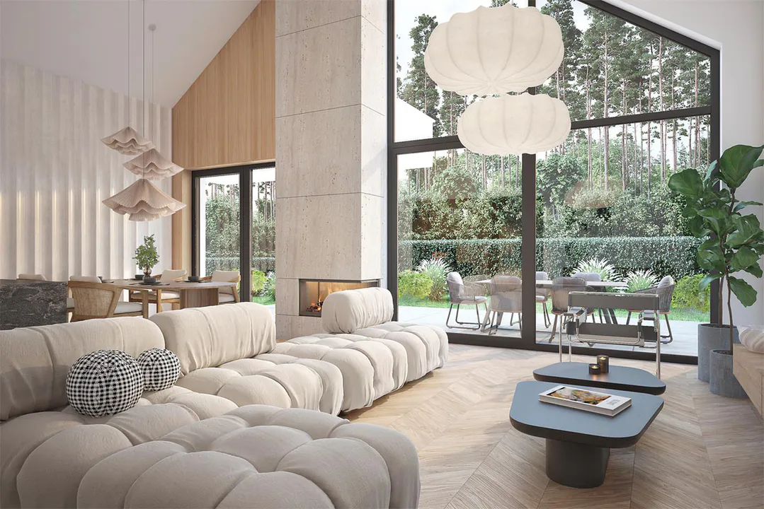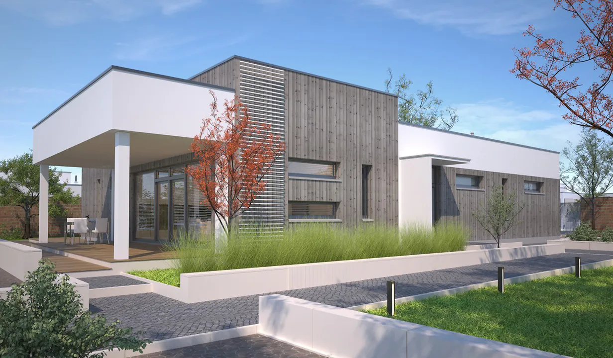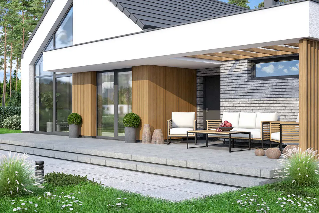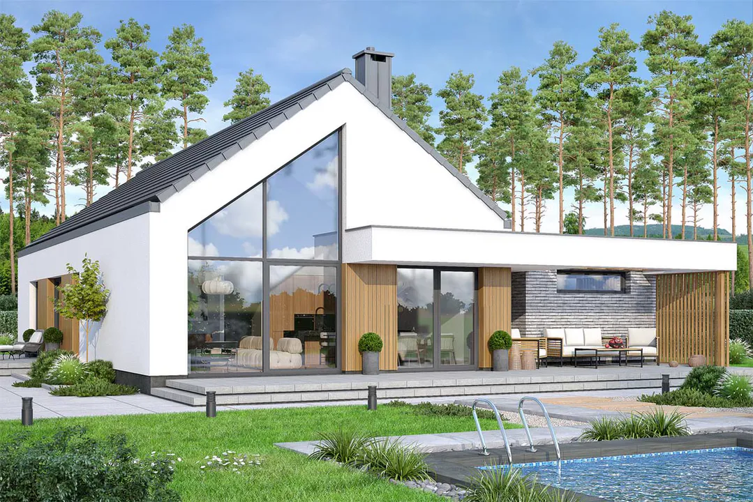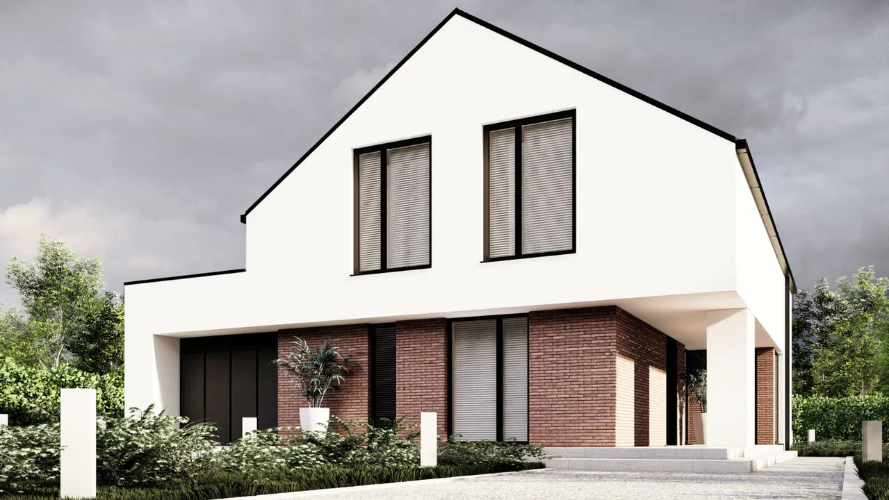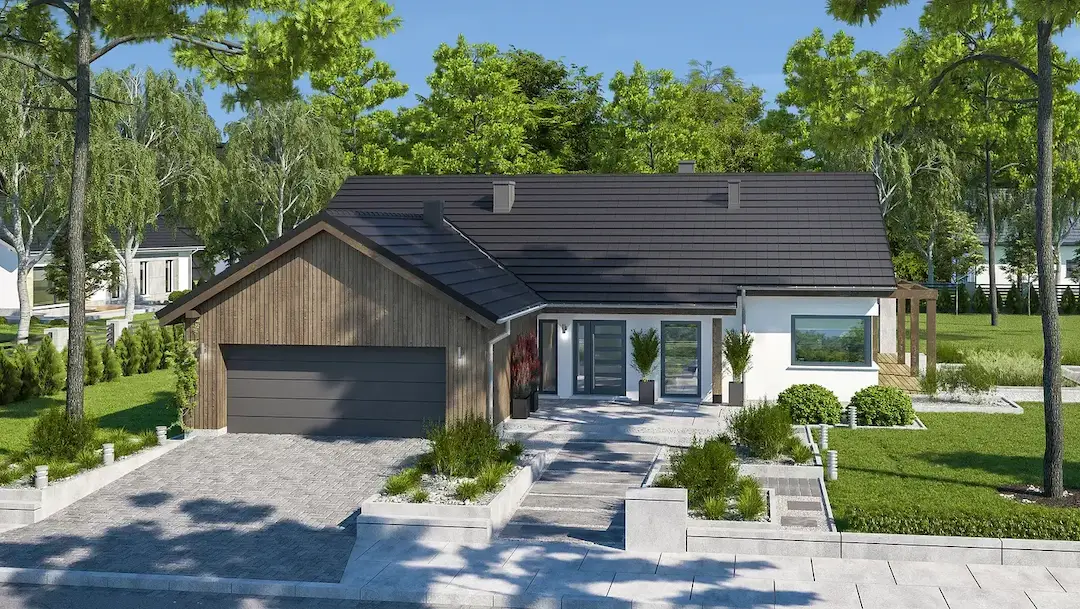 Сочетание классической модели дома в современном исполнении с минималистичным гаражом символизирует инновации, гармонию и неподвластный времени характер.