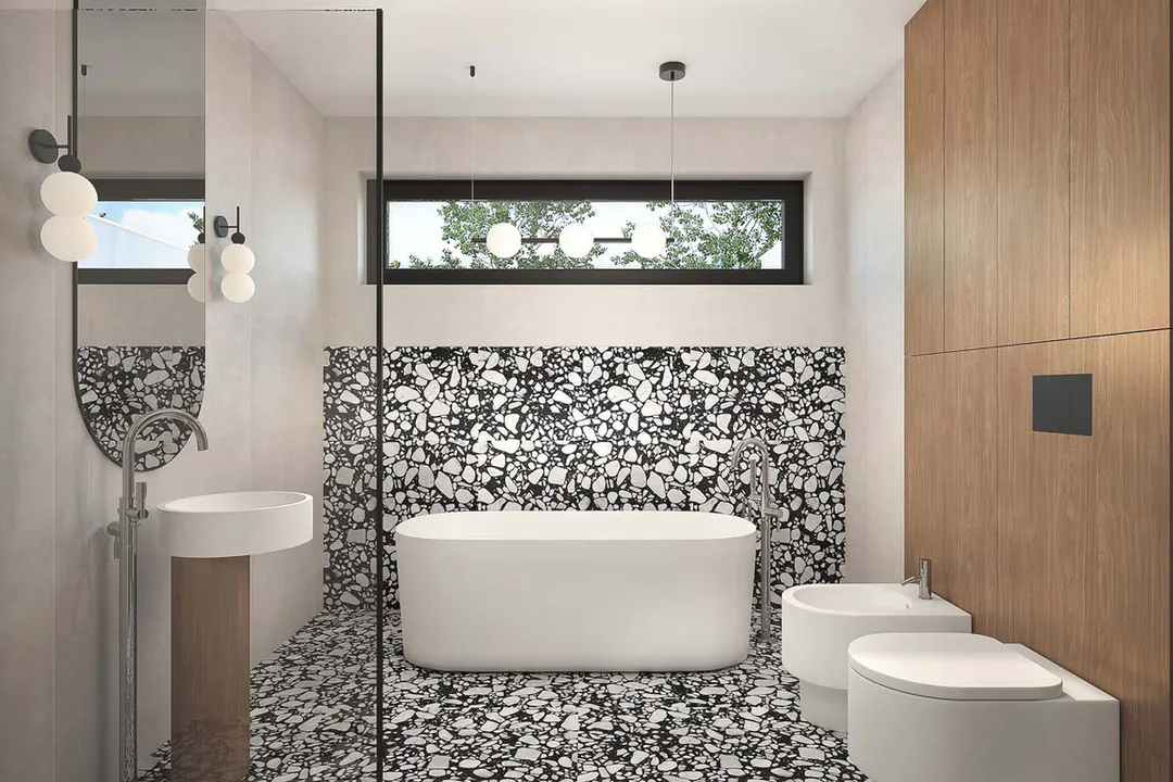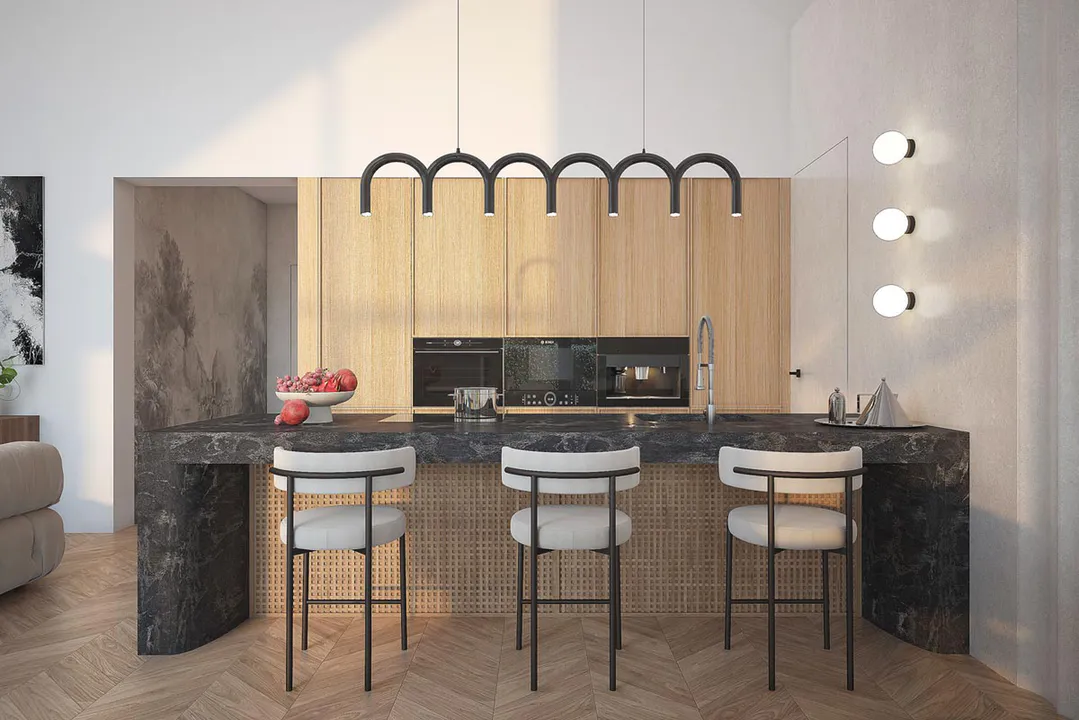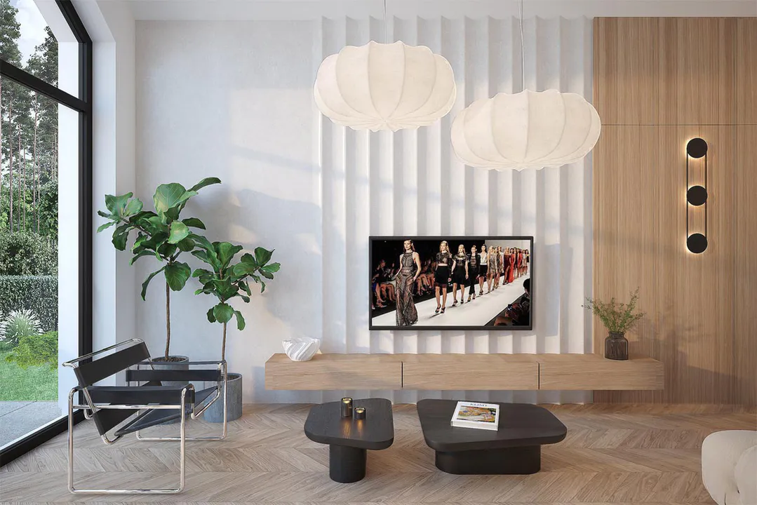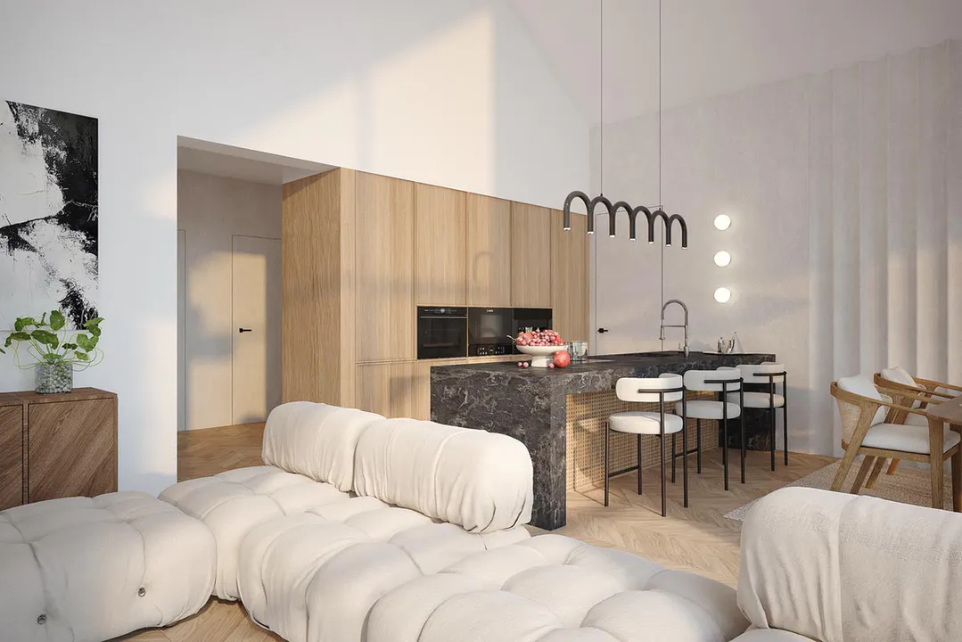 Сочетание белой штукатурки с деревянной облицовкой и серой клинкерной плиткой придает дому уникальный стиль. Впечатляющее высокое остекление со стороны сада пропускает много естественного света, создавая чрезвычайно открытое пространство.