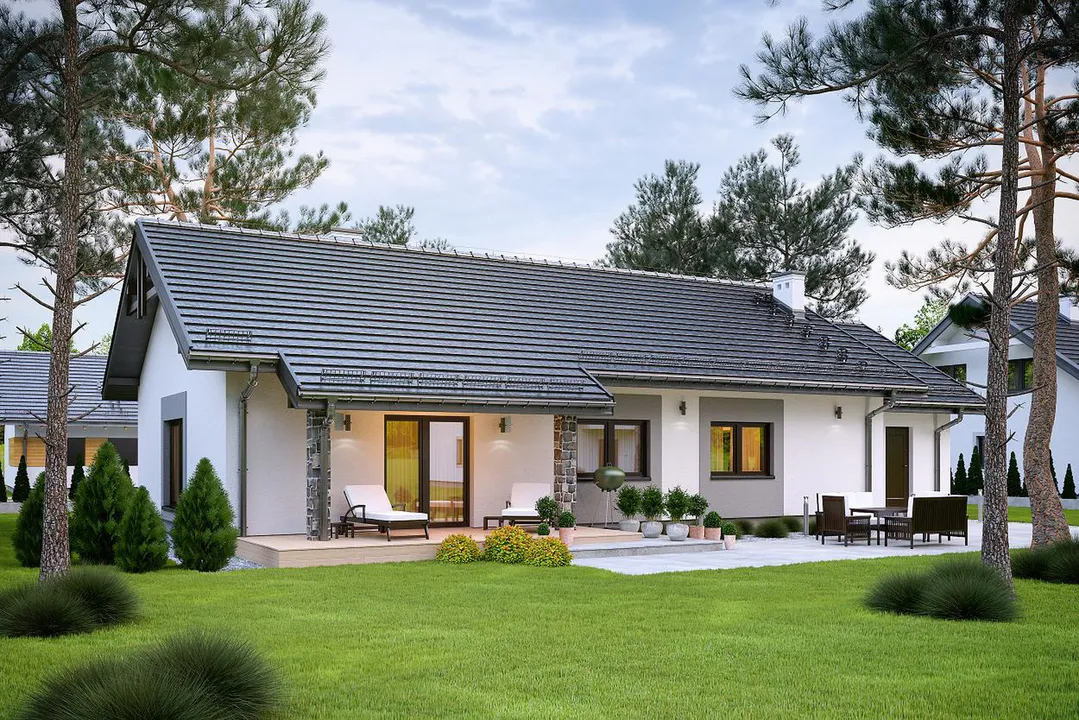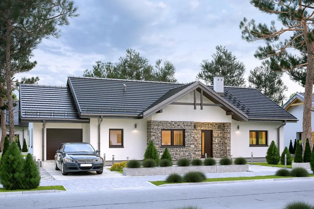 Проект современного одноэтажного дома с гаражом, террасой и двускатной крышей.