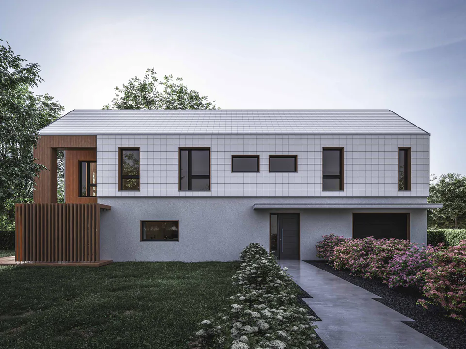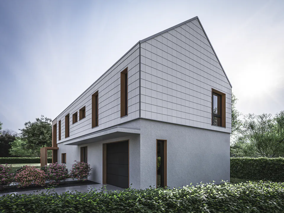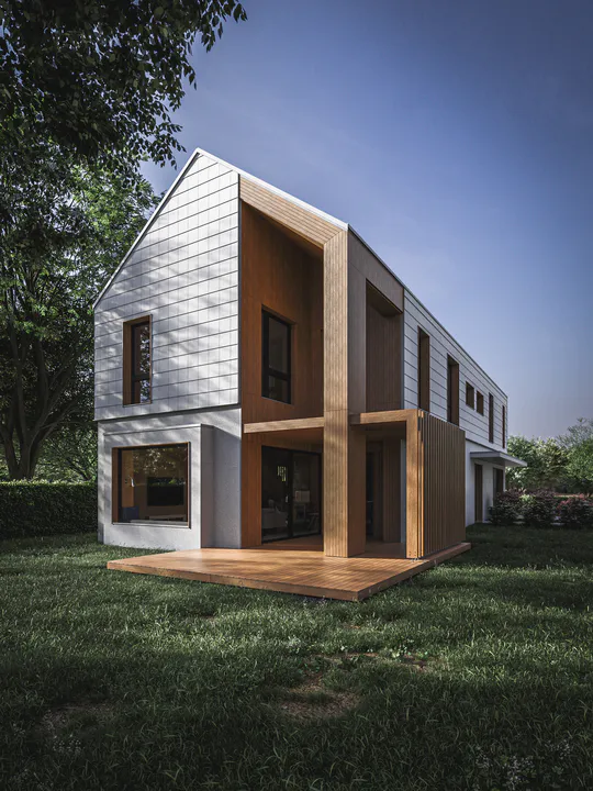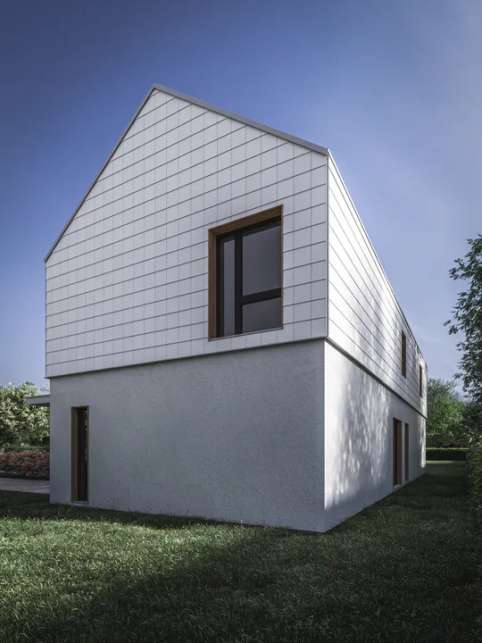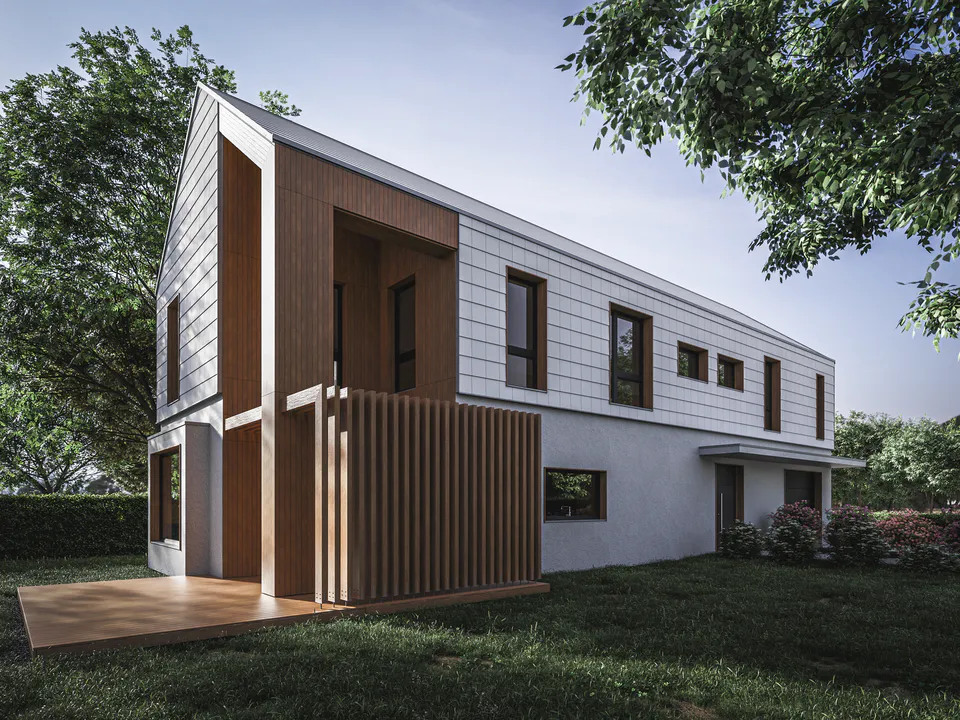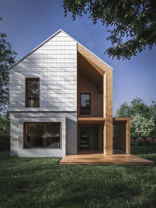 Фасады здания были разделены горизонтально, первый этаж был спроектирован с отделкой гладкой штукатуркой, а второй этаж был отделан фиброцементной плиткой. Привлекательным акцентом является деревянная конструкция ниши с ажурной террасной крышей.