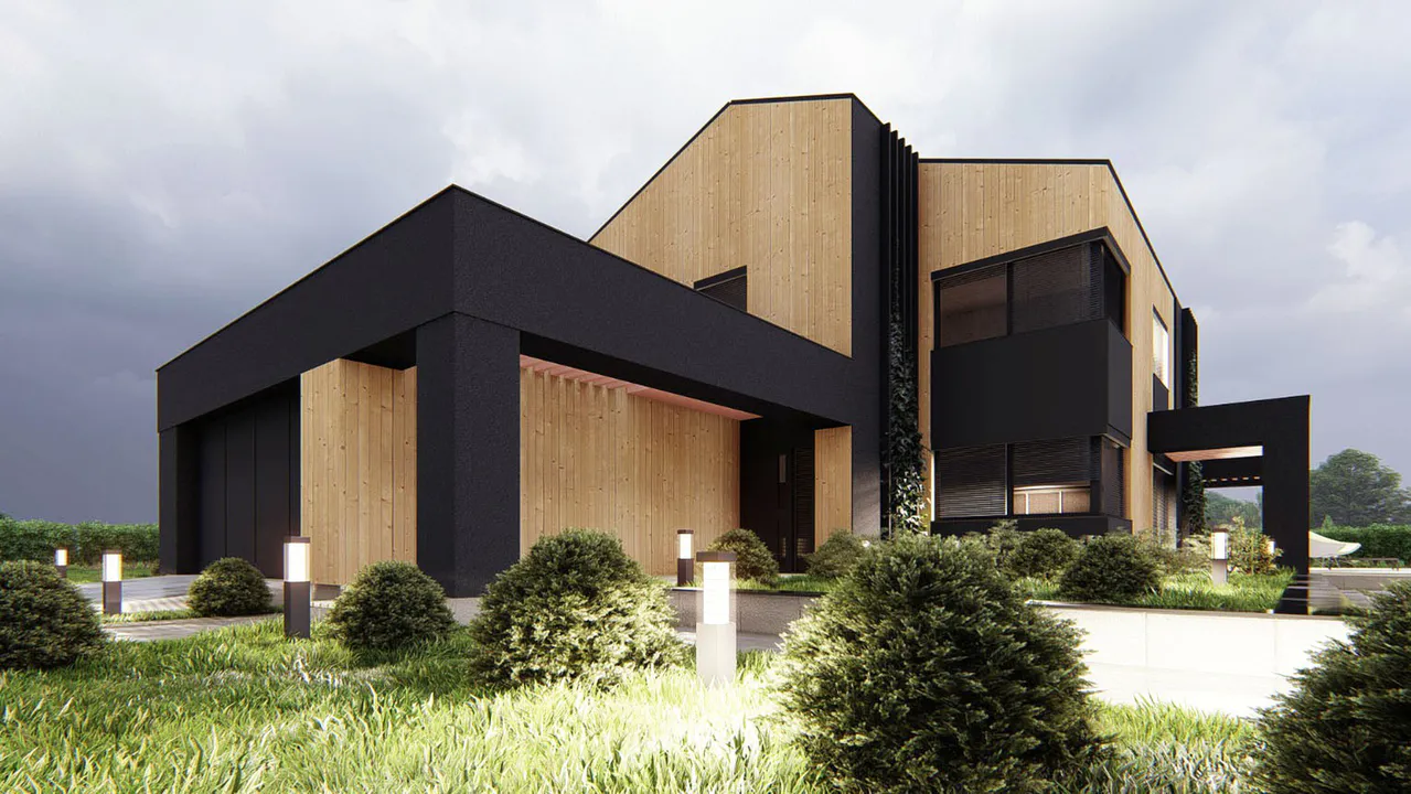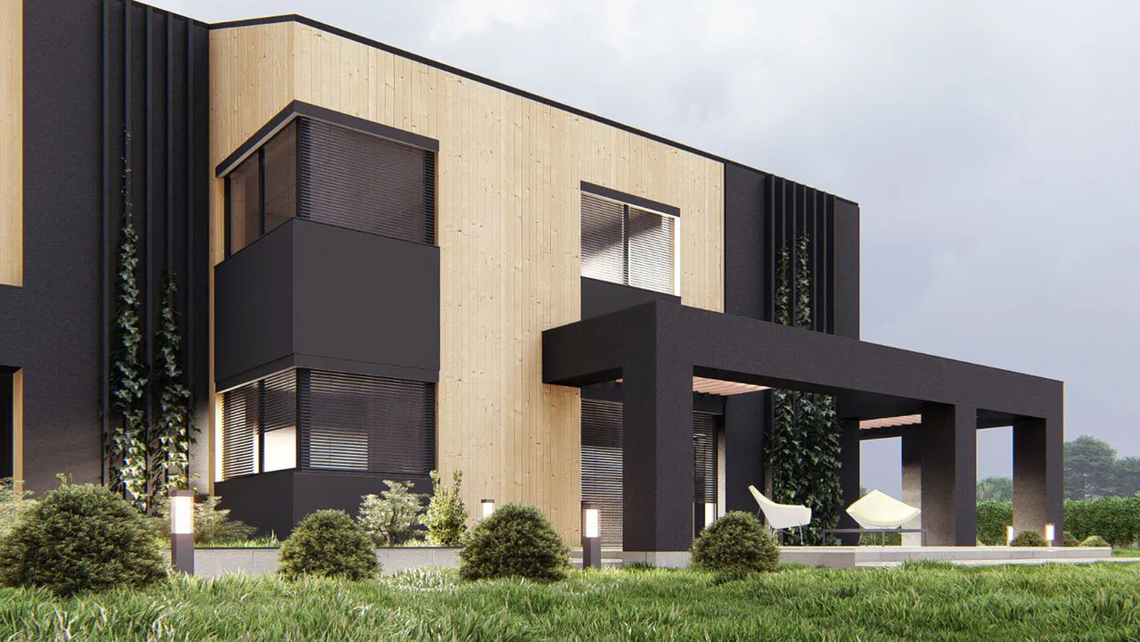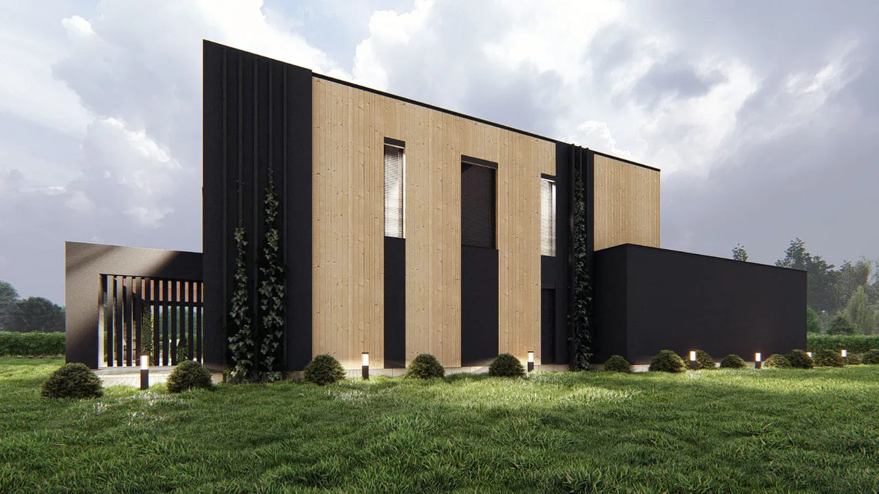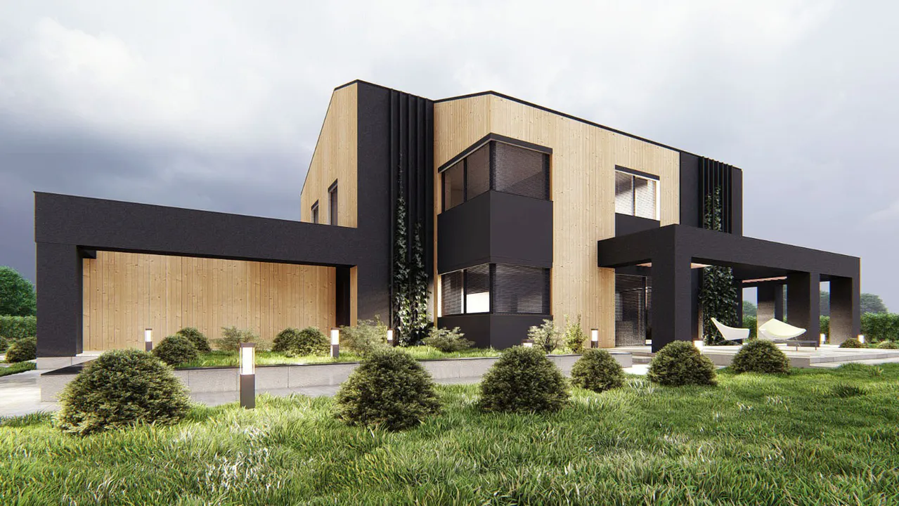 Проект выполнен в современном стиле с акцентом на минимализм и натуральные материалы. Фасад облицован деревянными панелями, что придает ему теплый и уютный вид. Чёрные акценты в архитектуре подчёркивают строгие линии и создают контраст.
