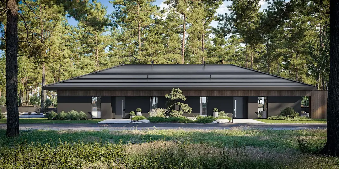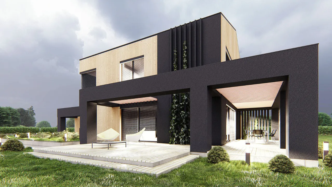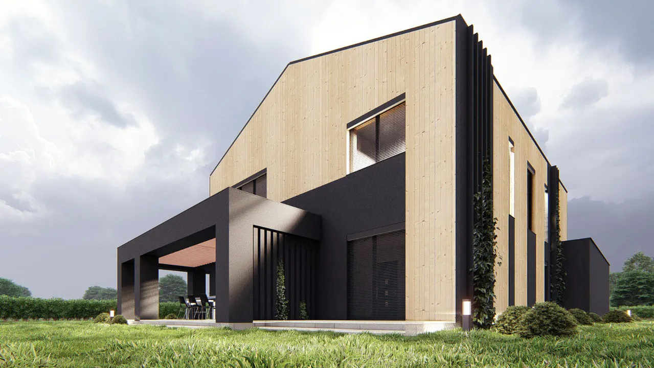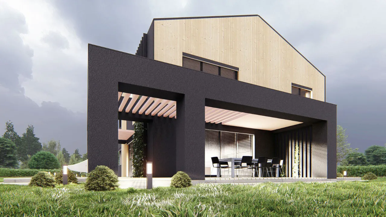 Проект выполнен в современном стиле с акцентом на минимализм и натуральные материалы. Фасад облицован деревянными панелями, что придает ему теплый и уютный вид. Чёрные акценты в архитектуре подчёркивают строгие линии и создают контраст.