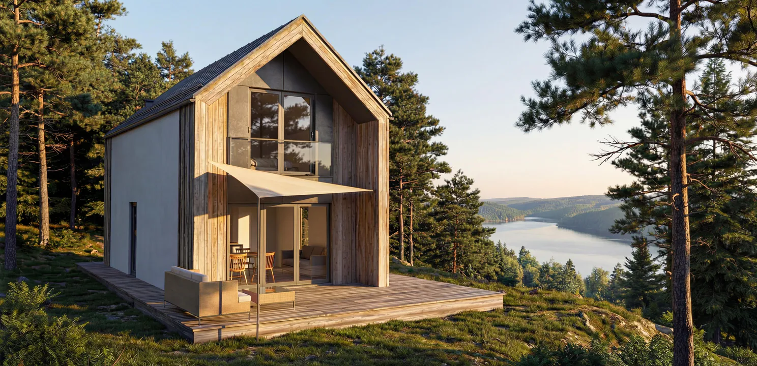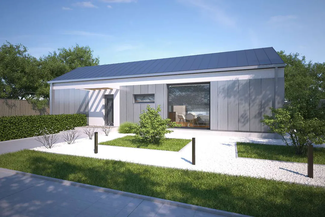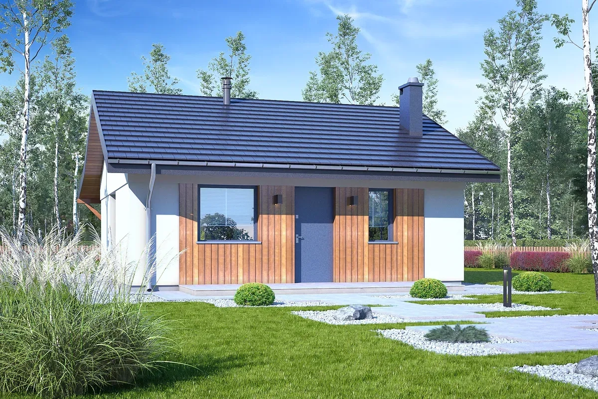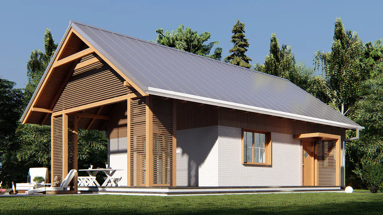 Проект небольшого одноэтажного дома без гаража с двускатной крышей и террасой.