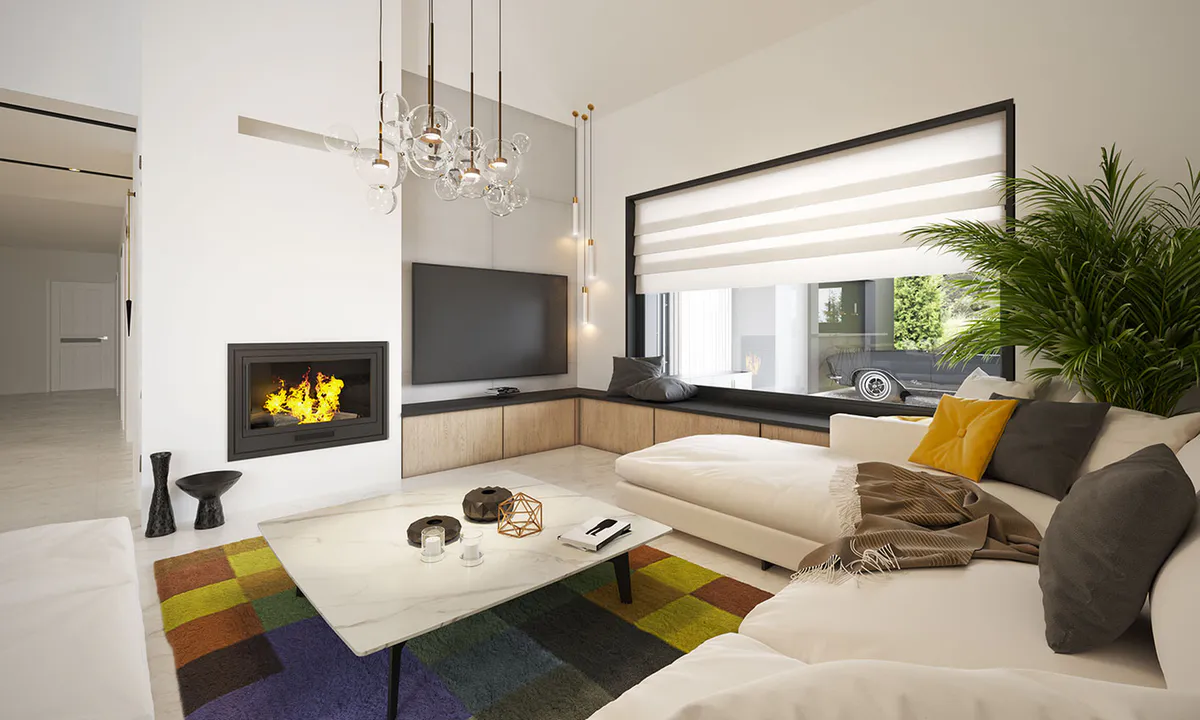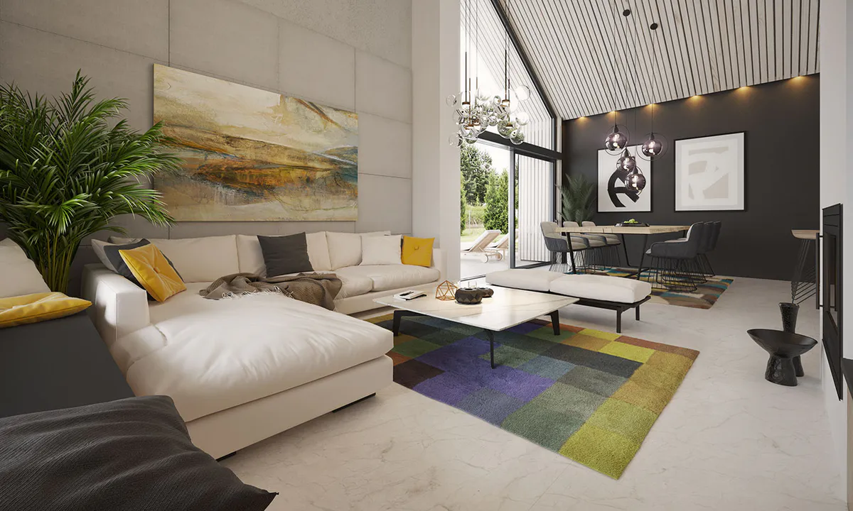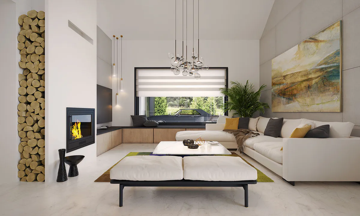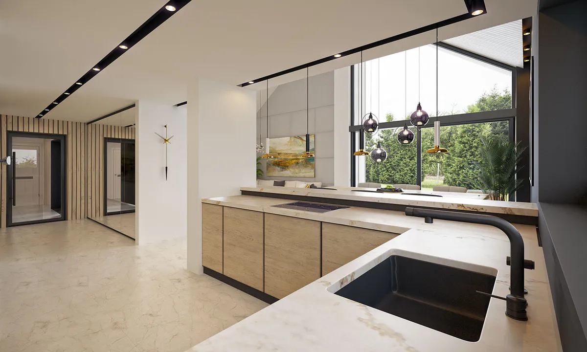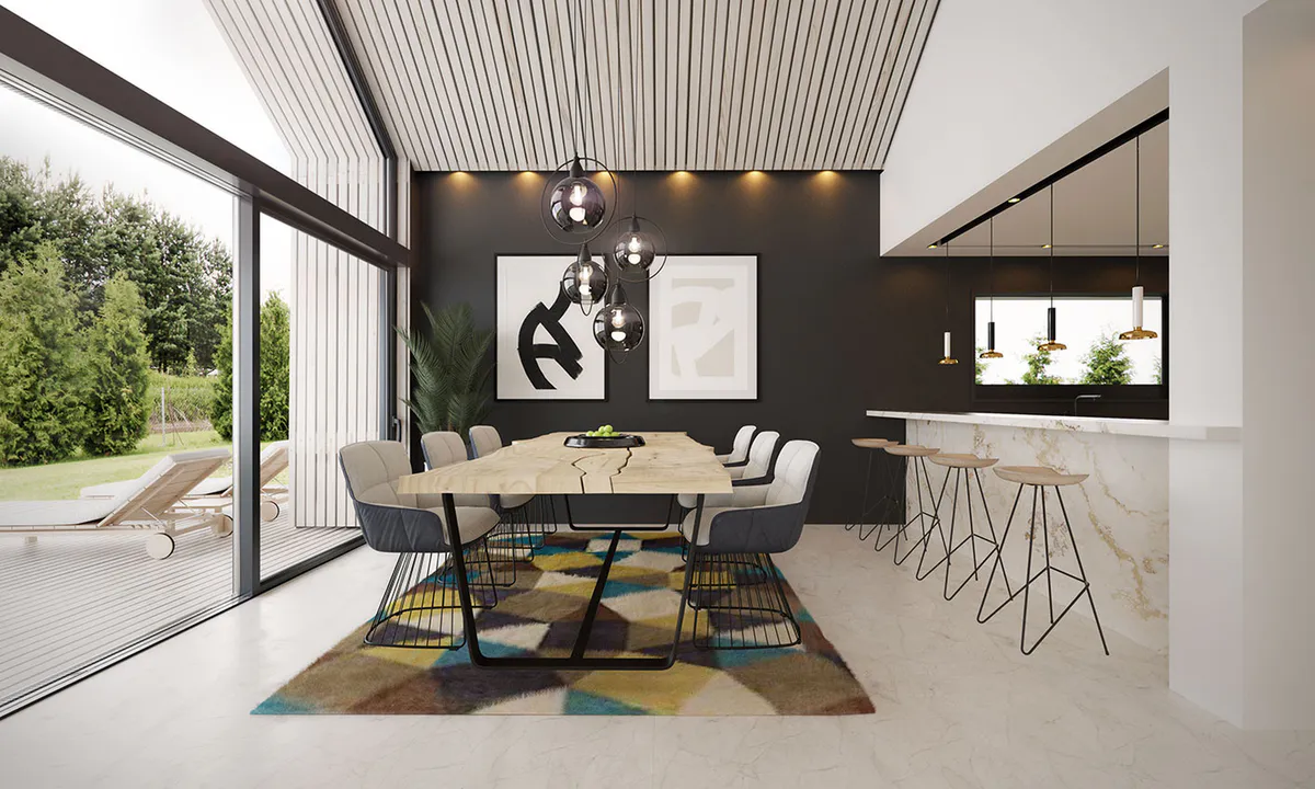 Стиль дополнительно подчеркивается огромным остеклением в жилой зоне, которое, наряду с отступающим входом, является главным акцентом дома.