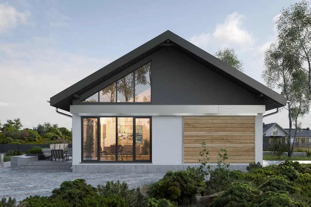 Простую форму дома подчеркивает двускатная крыша, разнообразные цвета и материалы фасада, а также современное остекление.