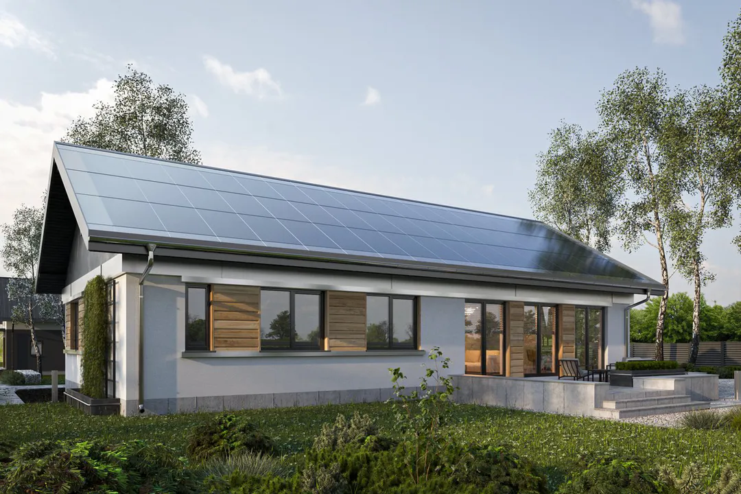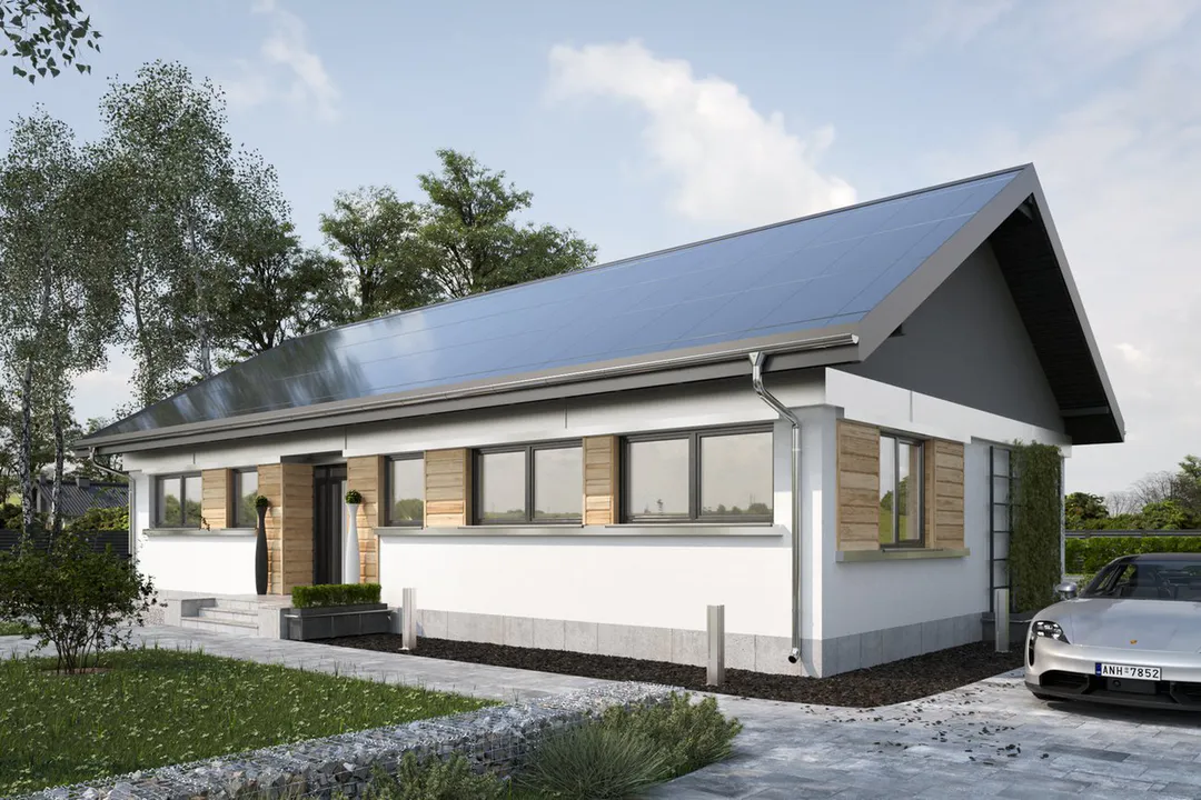 Оригинальность и простота концепции прослеживаются в фасадах, покрытых белой и серой штукатуркой с добавлением деревянных панелей. Современные окна подчеркиваются горизонтальными линиями подоконников и облицовки. Их разнообразит входная зона, а со стороны сада — треугольное окно в коньке крыши, которое глубоко освещает внутреннее пространство.