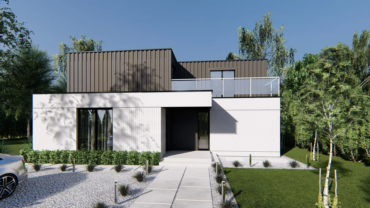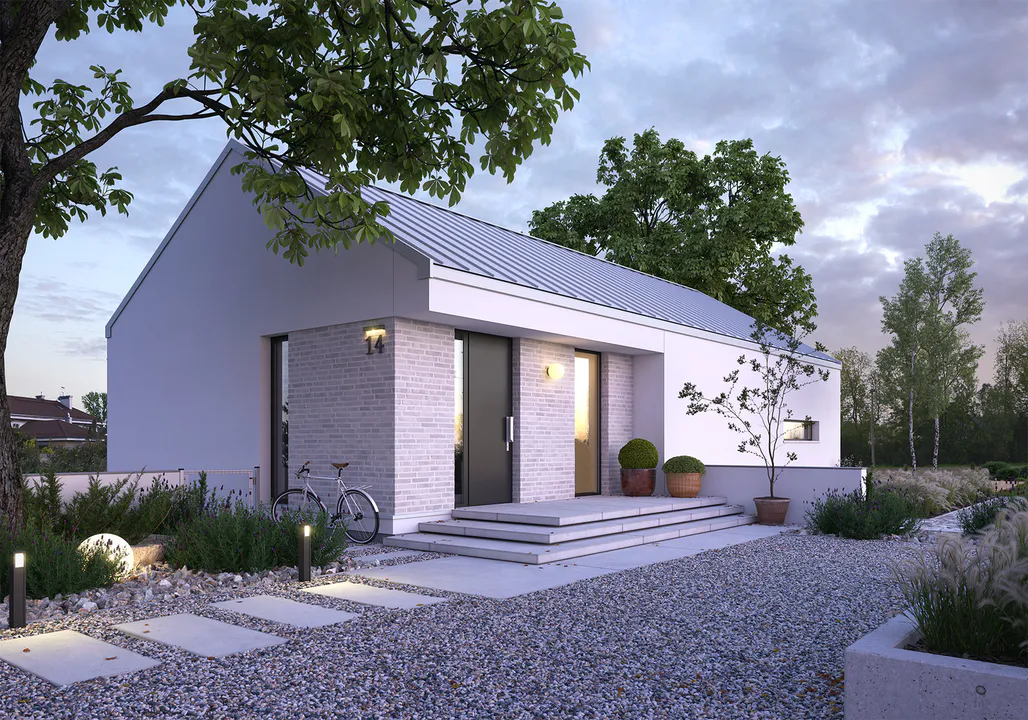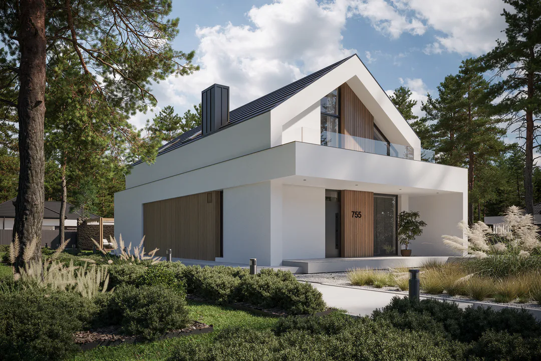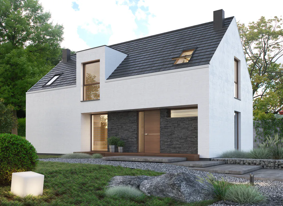 Дизайн дома характеризуется простотой и аккуратностью линий. Стены облицованы белой штукатуркой и светлой клинкерной плиткой, придающей зданию стильный и чистый вид.