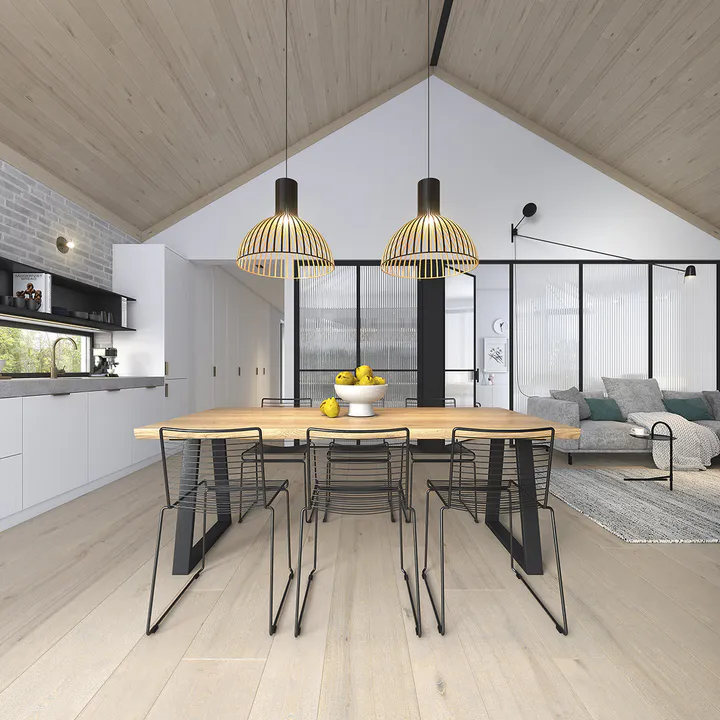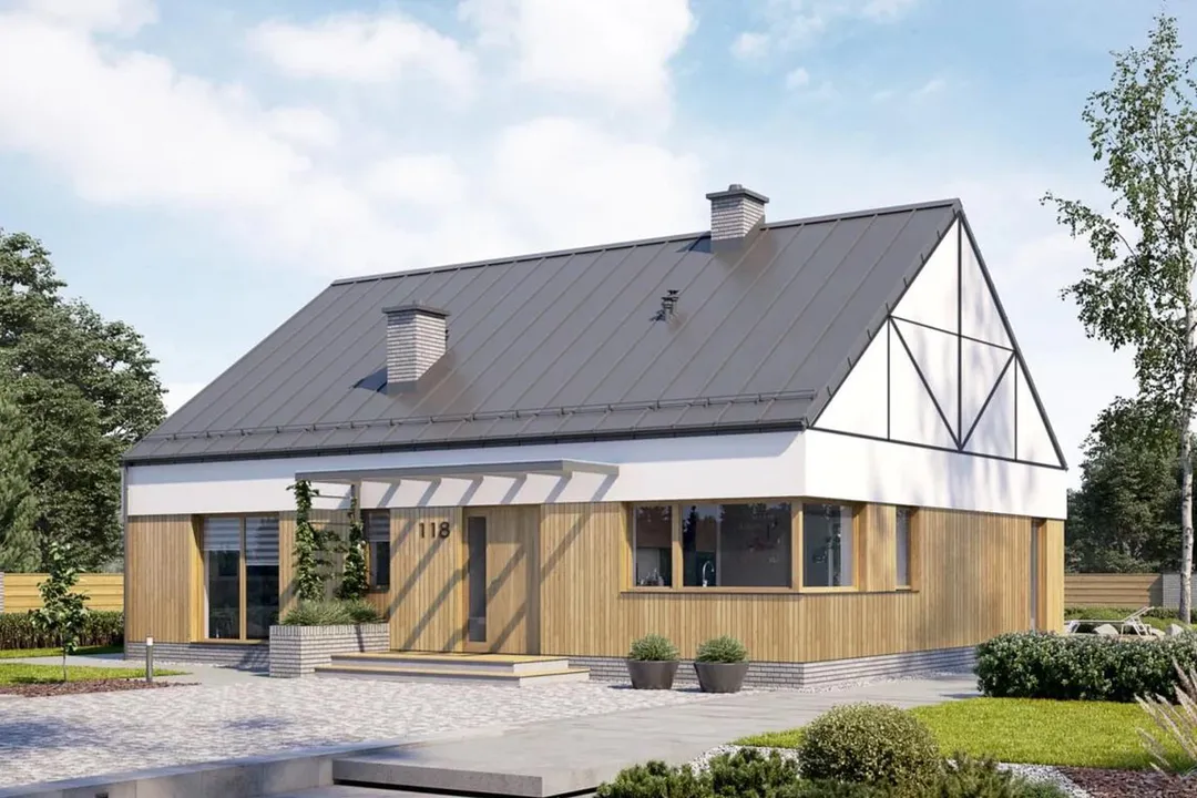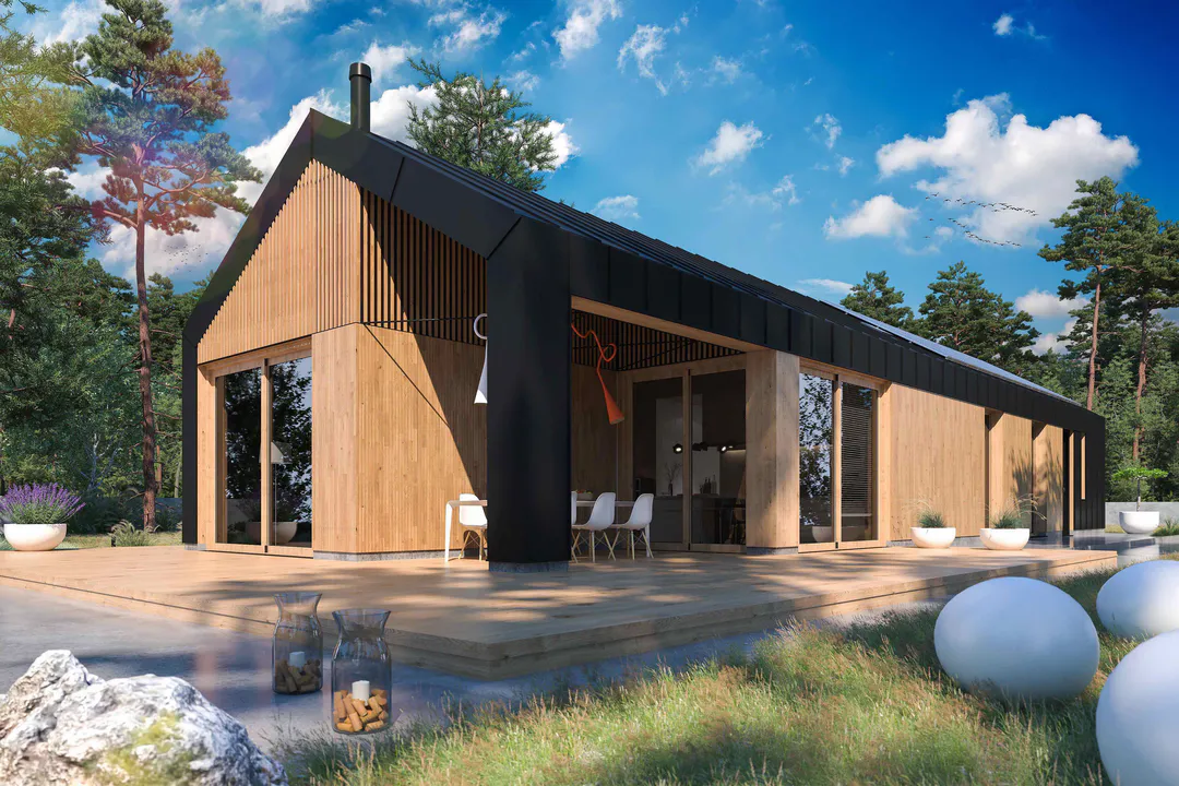Простая вытянутая форма с двускатной крышей и входом на боковом фасаде явно отсылает к скандинавскому стилю, но современные фасадные материалы и большие окна придают ему современный вид.