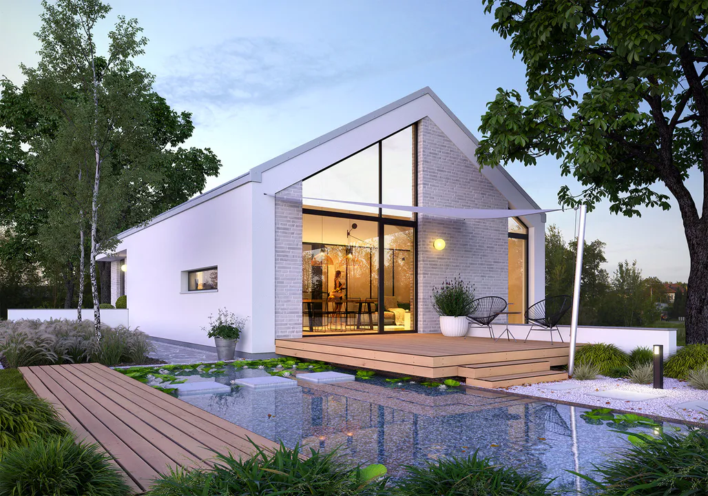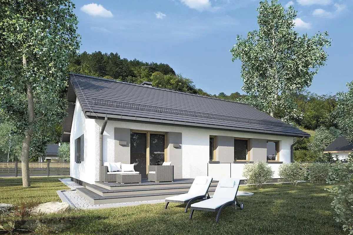 Проект небольшого одноэтажного дома с двускатной крышей и террасой.