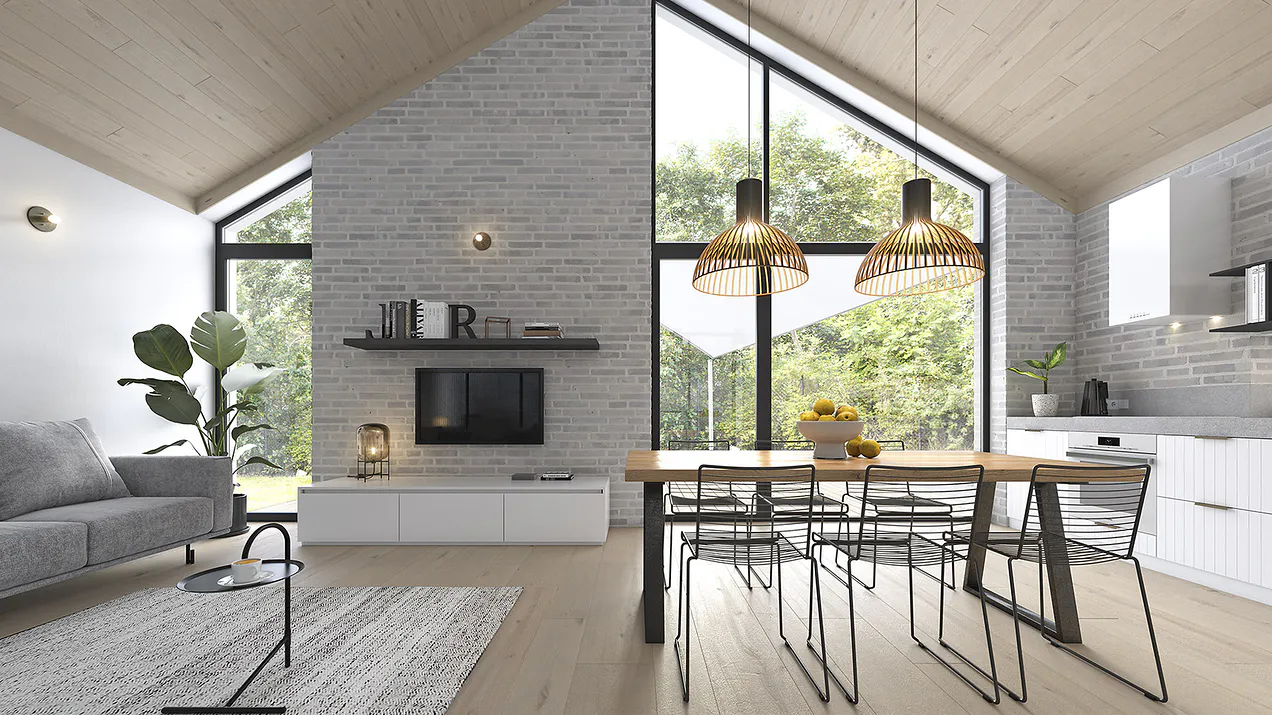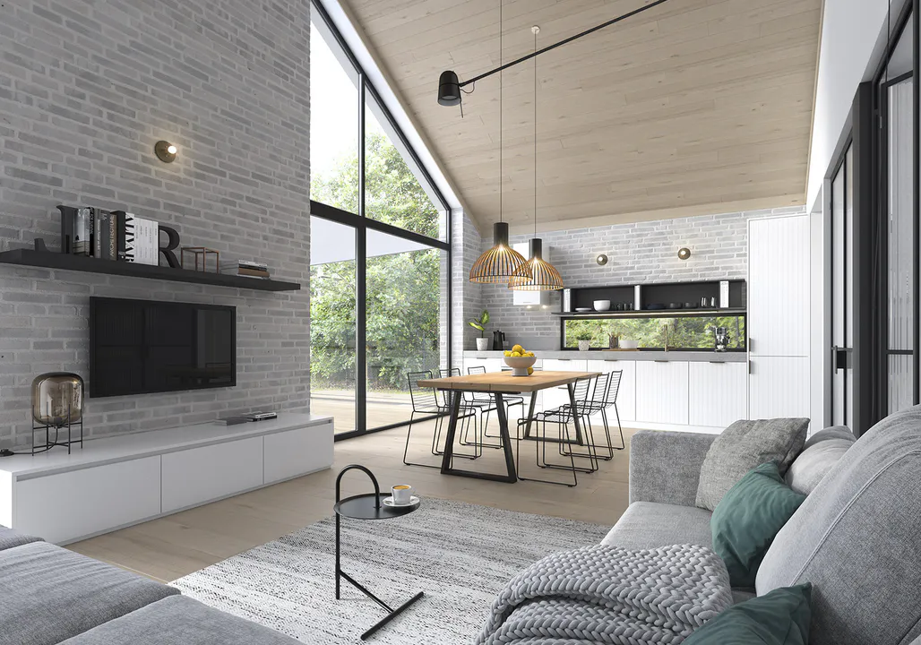 Фасад со стороны гостиной украшен большим остеклением, где от пола до потолка проникает естественное освещение, создавая уютную и гармоничную атмосферу.