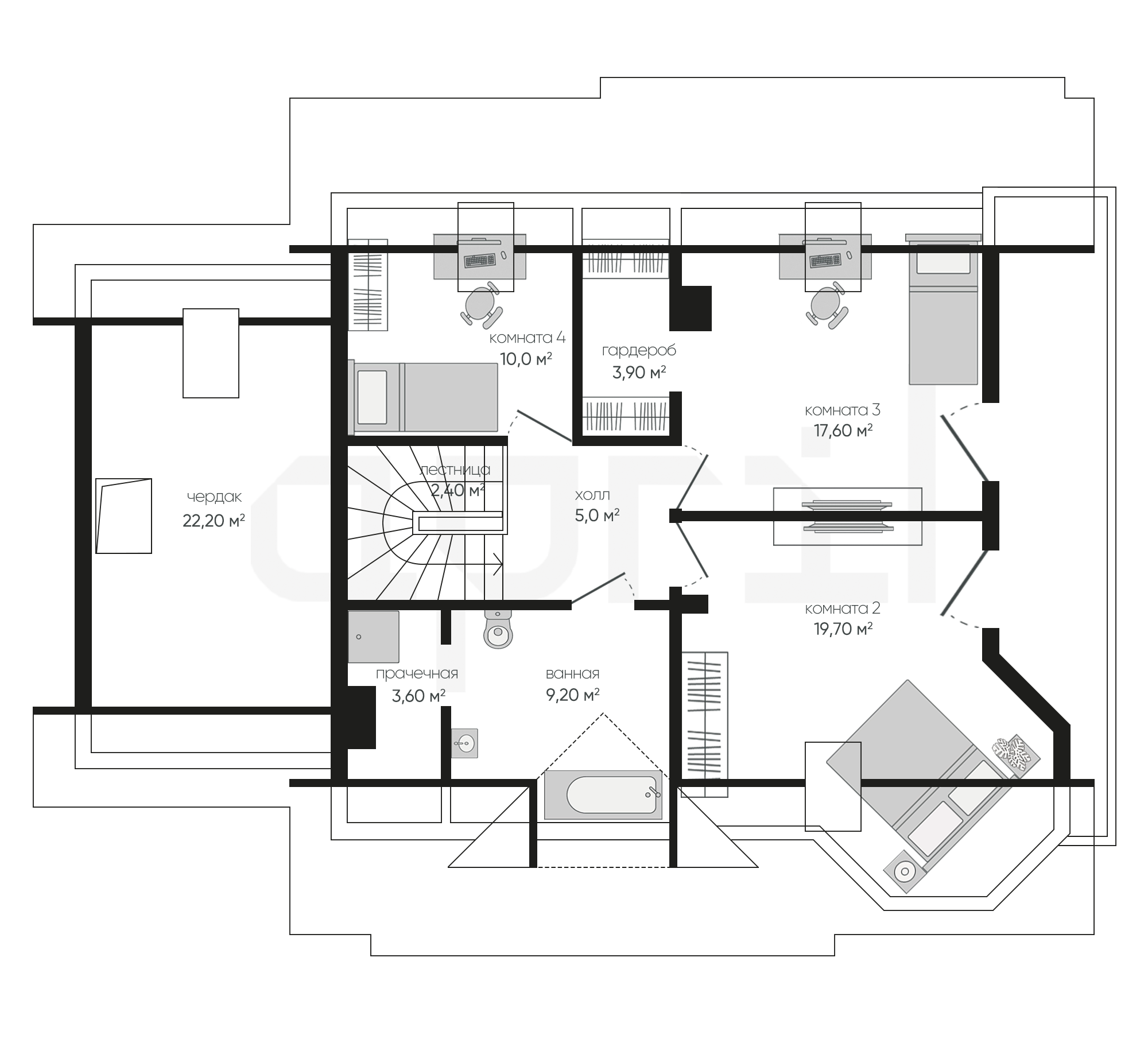 У дома двускатная крыша из темно-серой черепицы с мансардными окнами, что позволяет естественному свету проникать внутрь. Фасады окрашены в светло-серый цвет, создавая контраст с крышей.