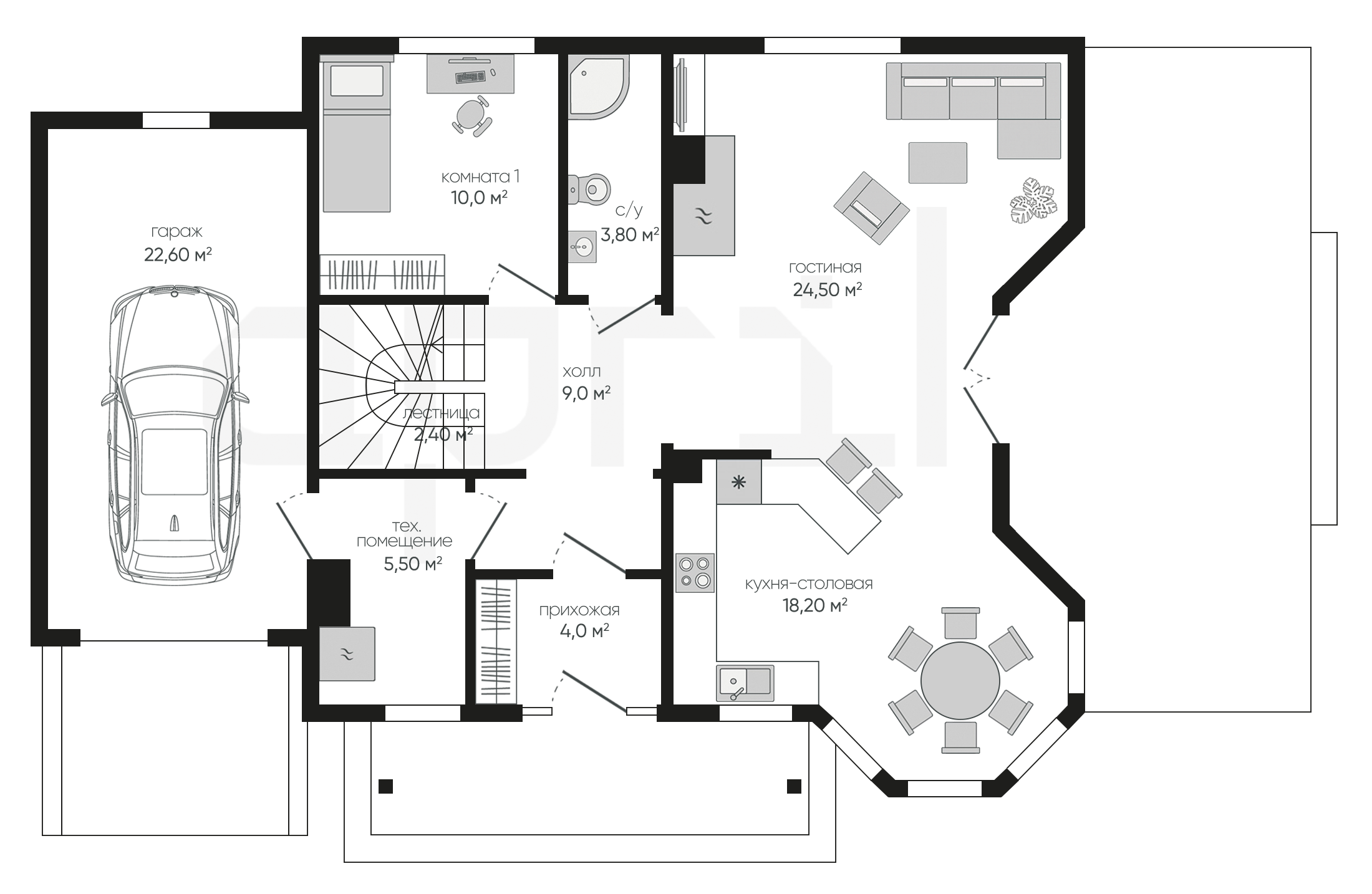 Проект современного дома с мансардным этажом, чердаком над гаражом и террасой.