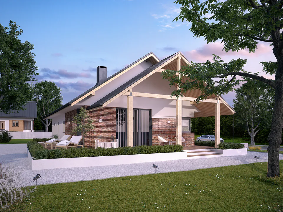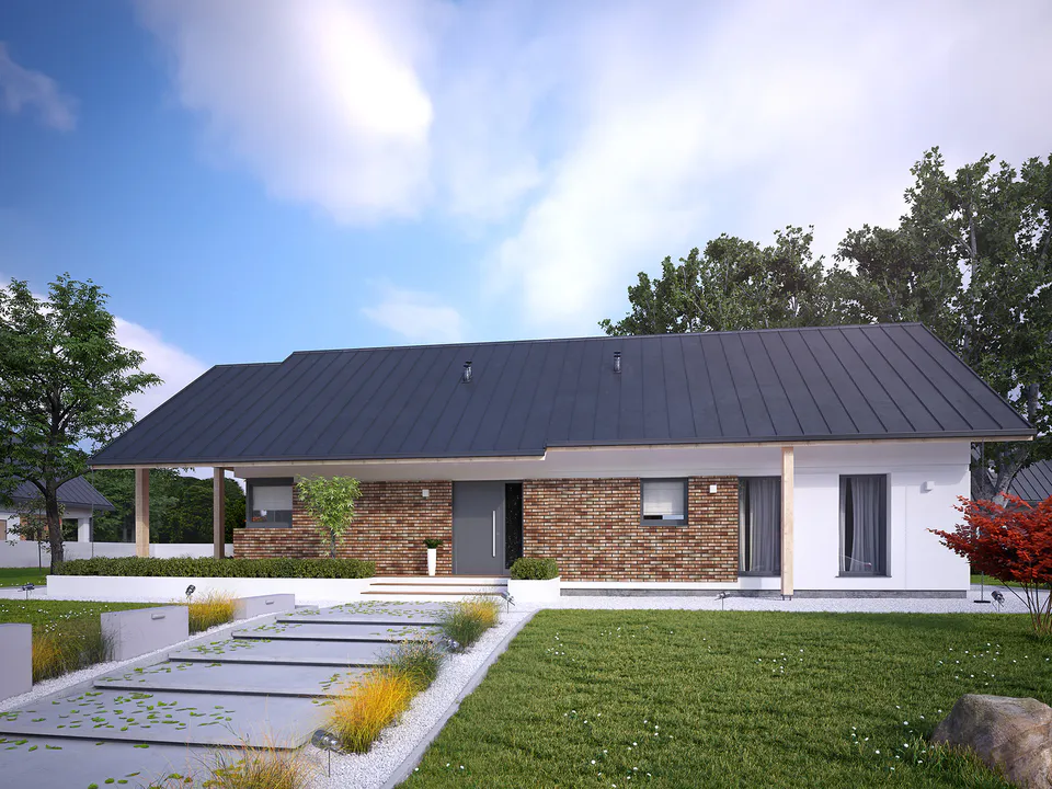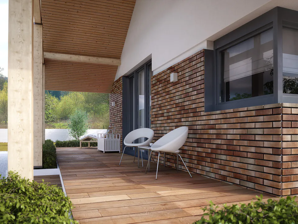 Фасад покрыт белой штукатуркой с фасадной плиткой под кирпич коричневых оттенков. Двускатная крыша покрыта фальцевым металлом графитового цвета, который соответствует цвету столярных изделий. Деревянные элементы конструкции и деревянная терраса подчеркивают современный характер дома.