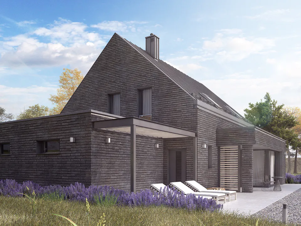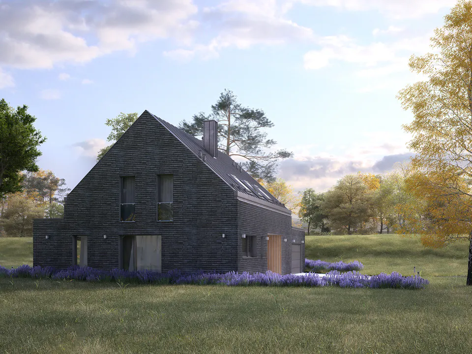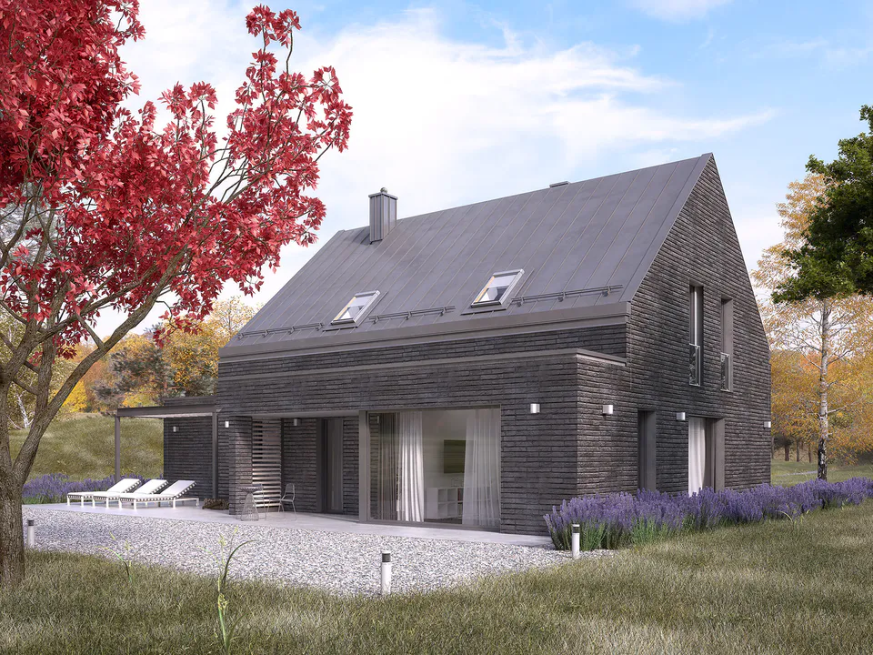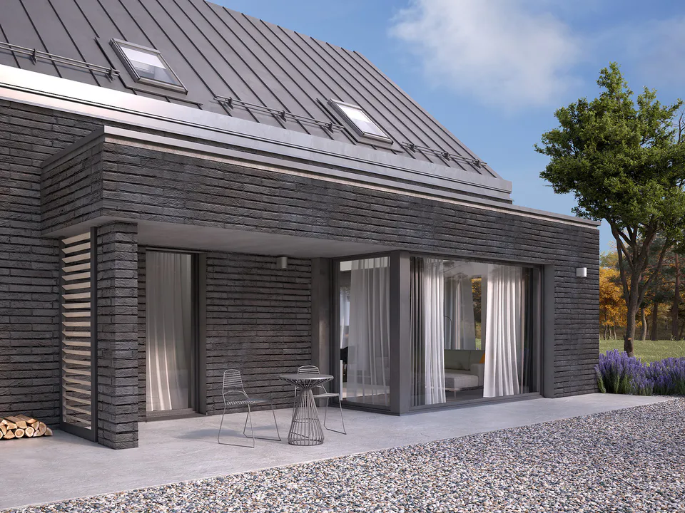 Дом выполнен из серого кирпича, что придаёт ему стильный и минималистичный вид. Крыша металлическая, с мансардными окнами для естественного освещения.