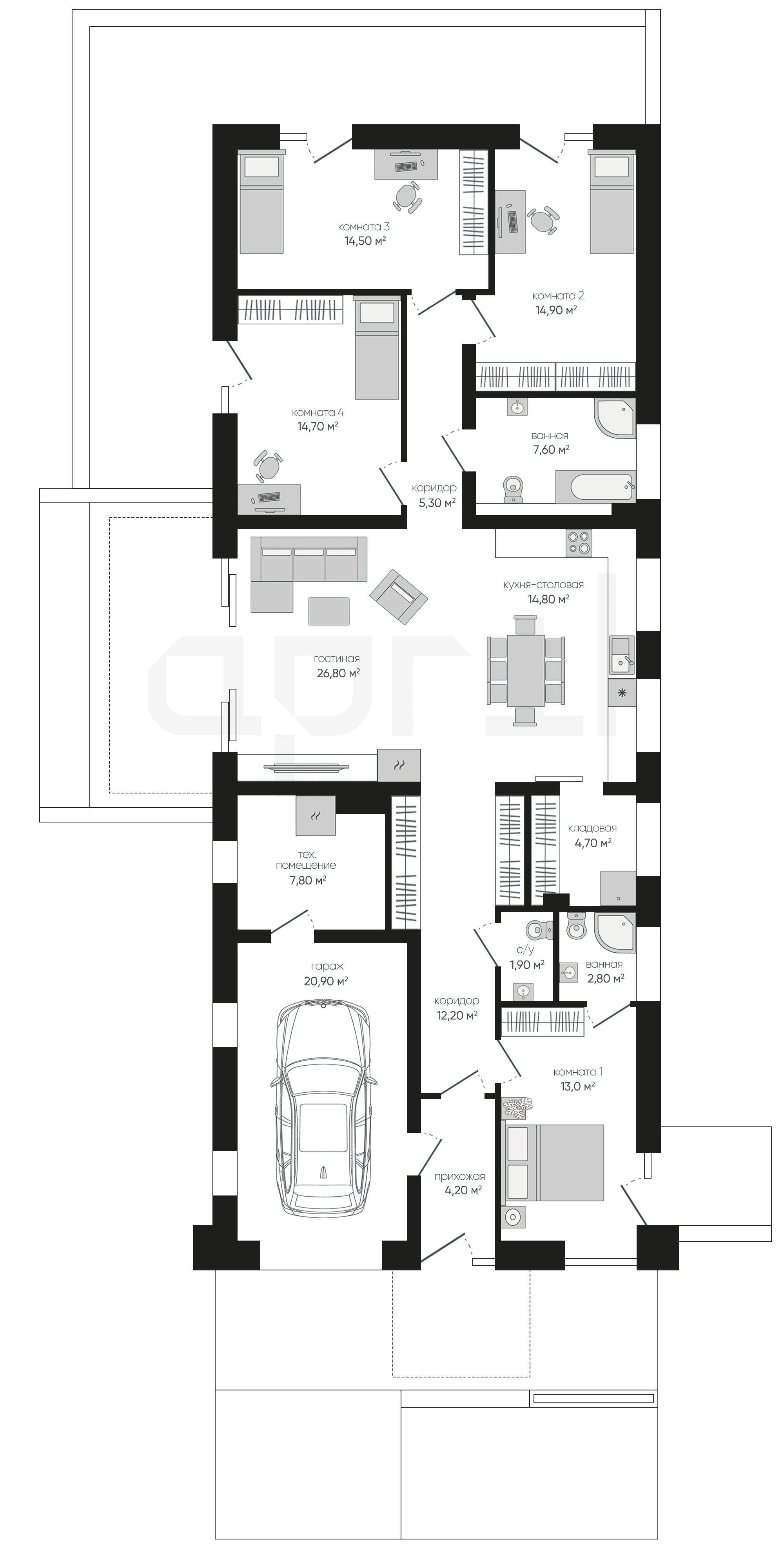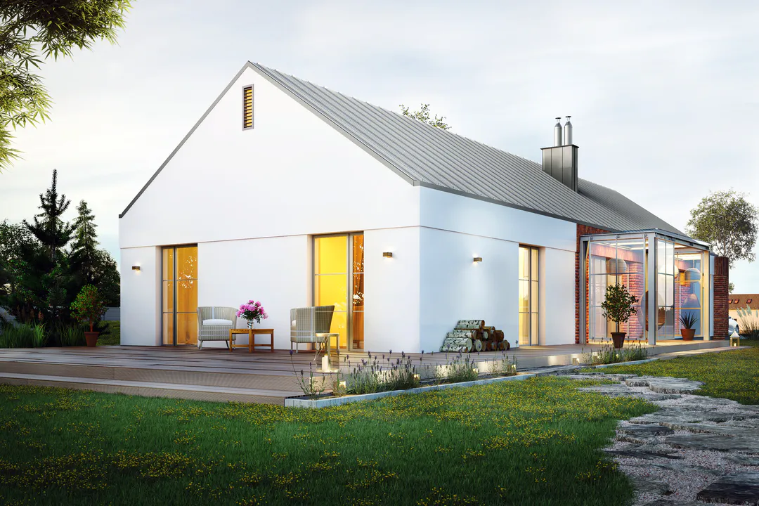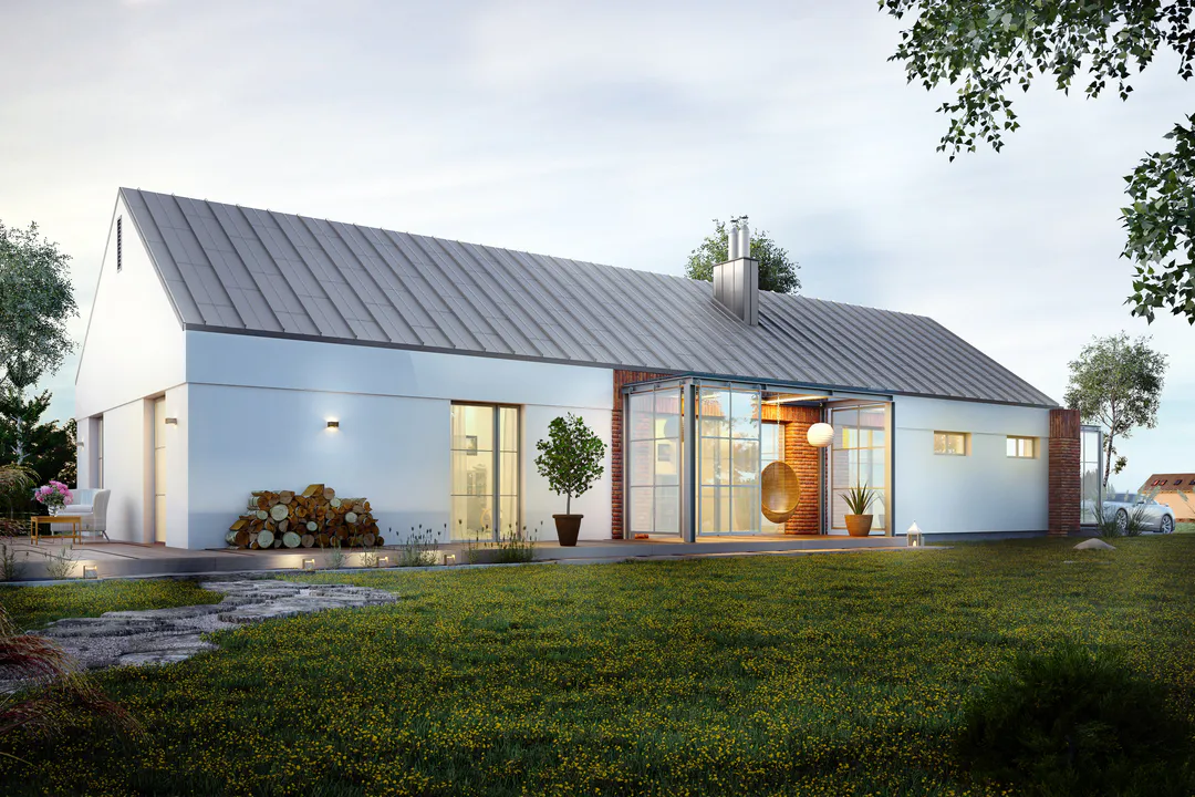 Проект одноэтажного дома с двускатной крышей, террасой и гаражом.
