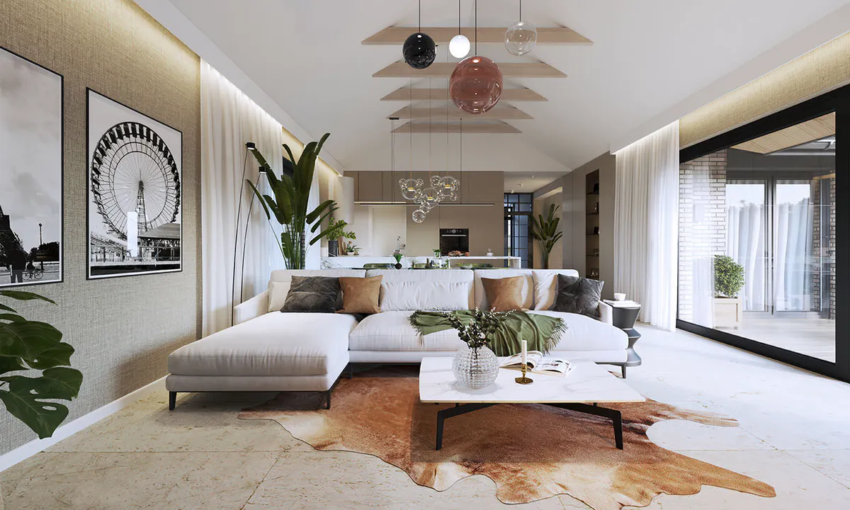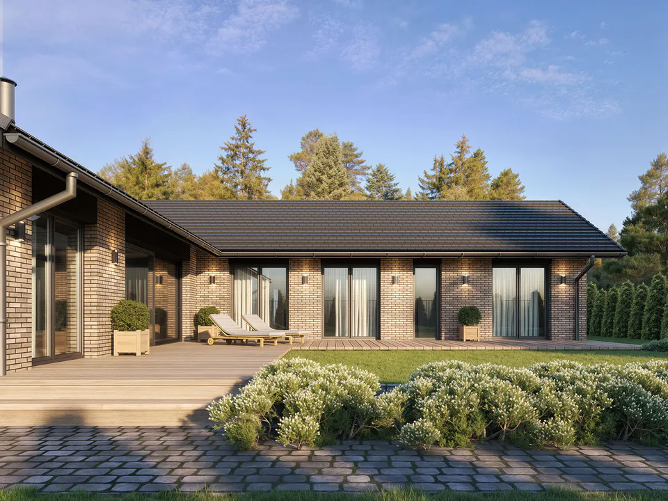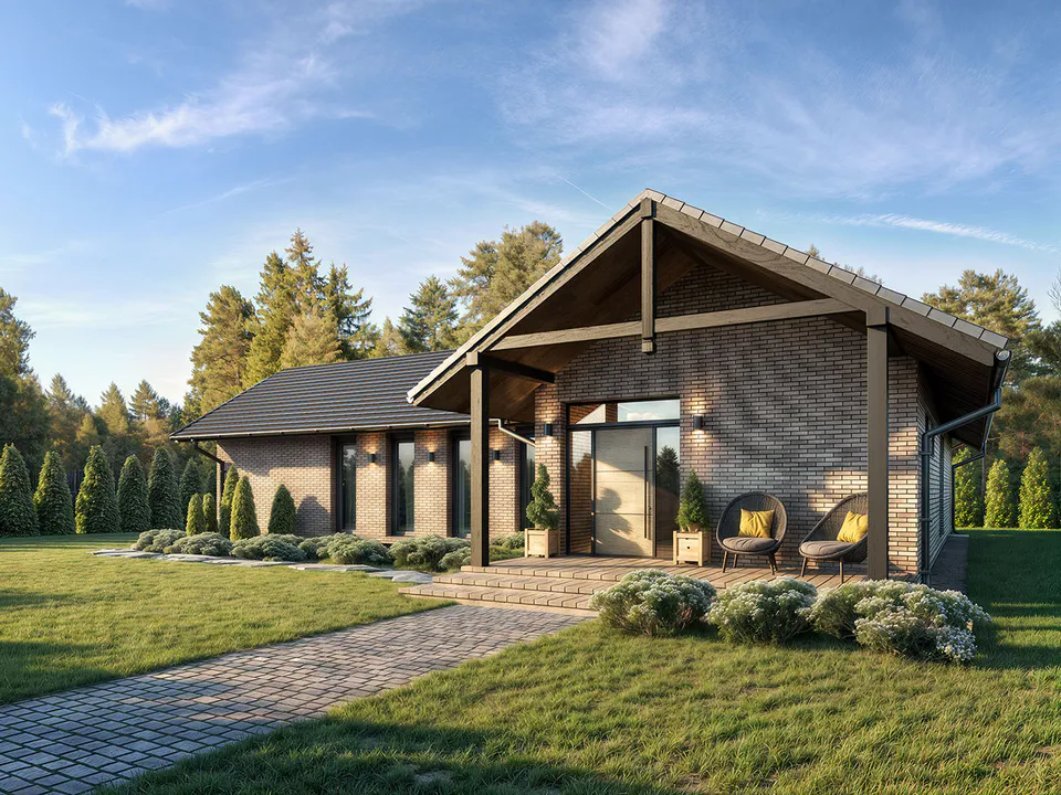 Проект современного одноэтажного дома с яркими архитектурными элементами.