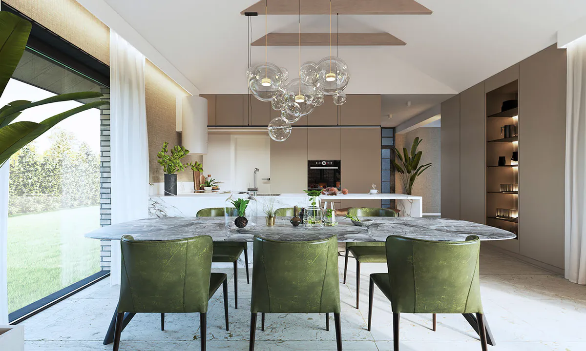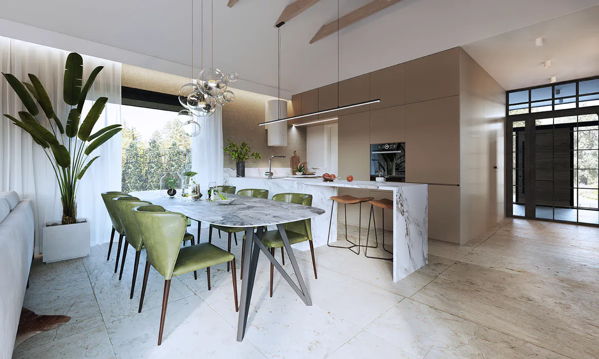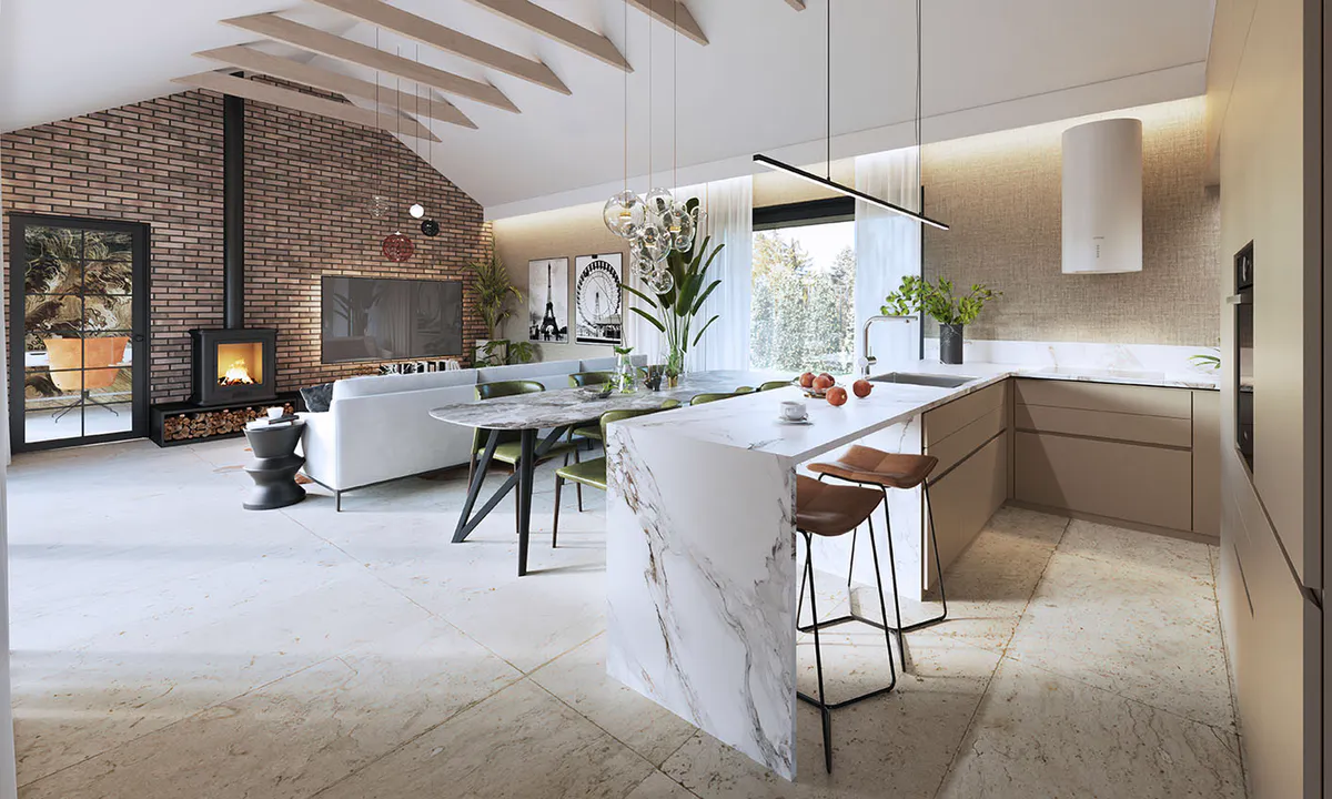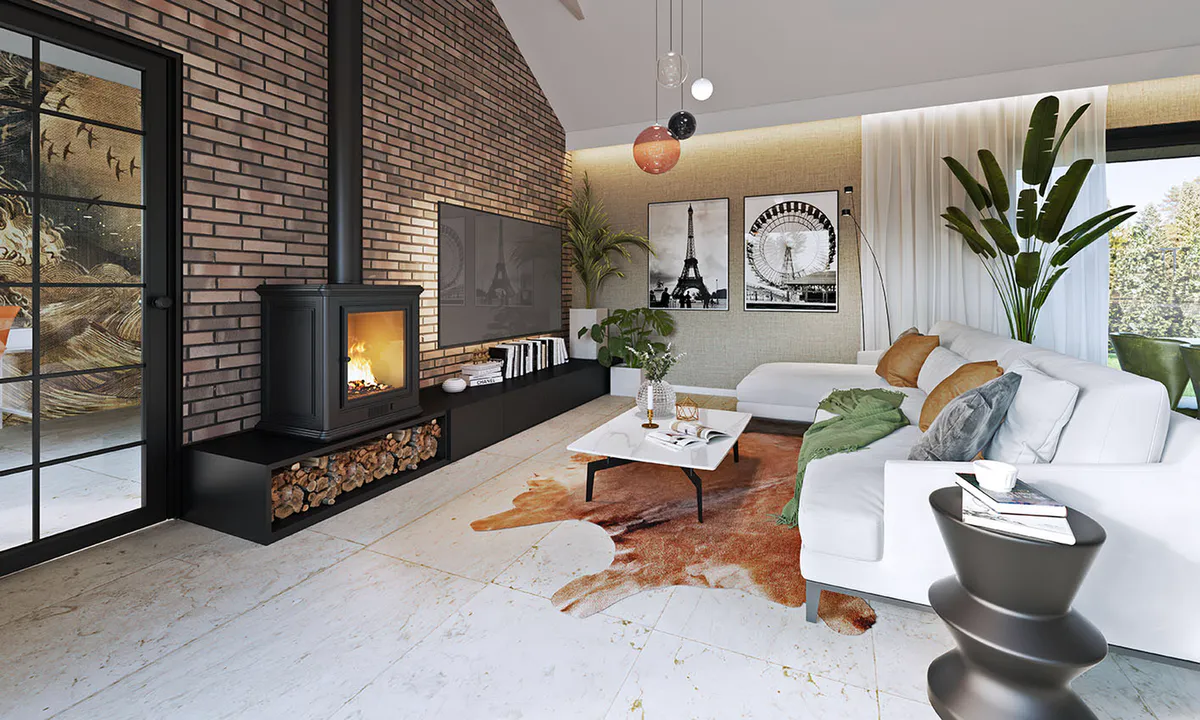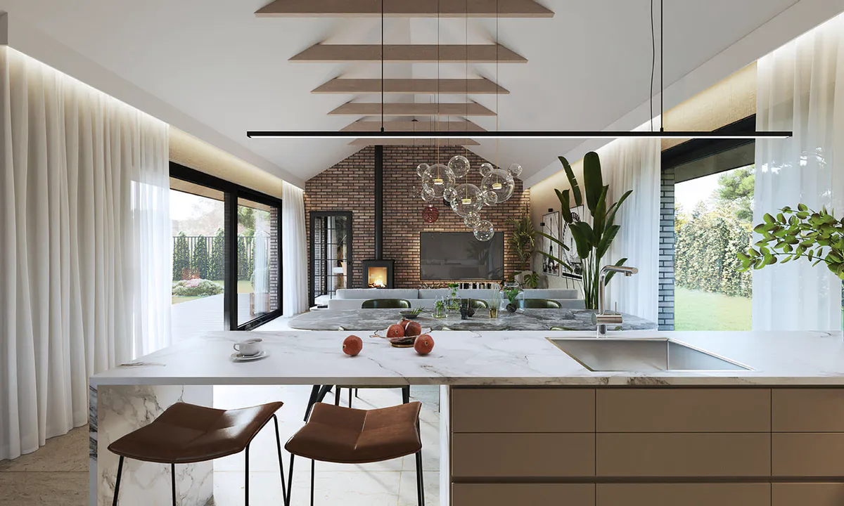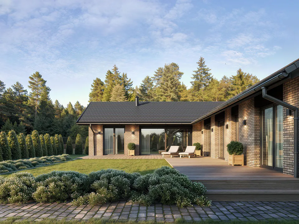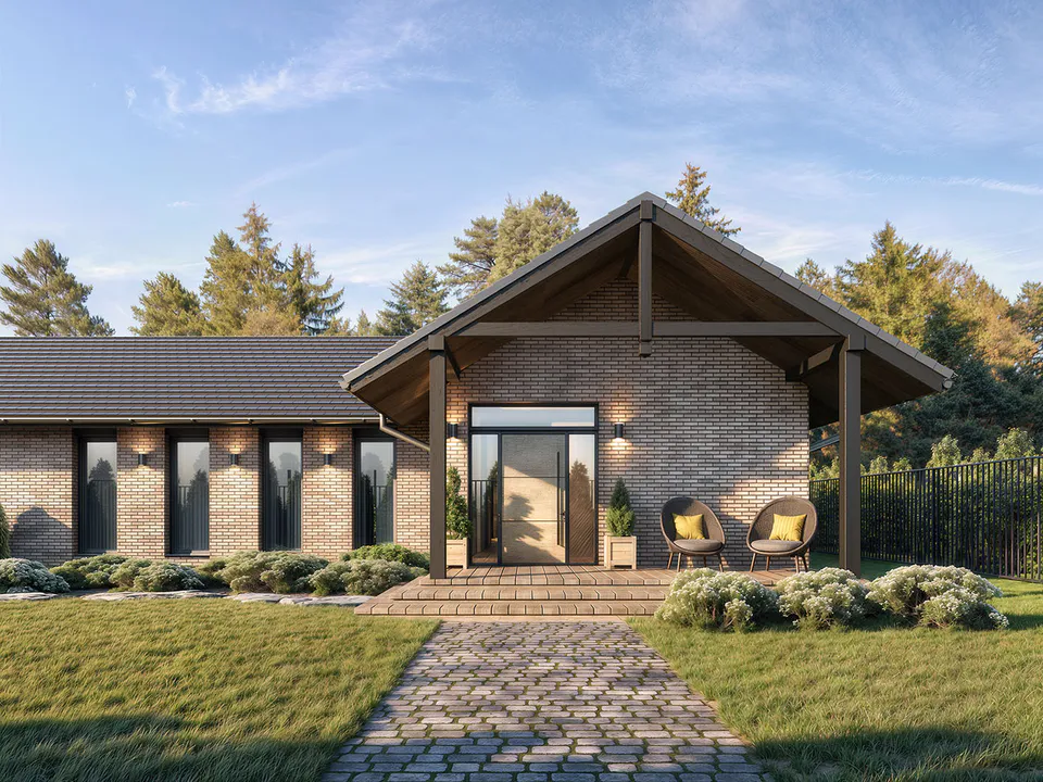 Внешние стены облицованы кирпичом, что придаёт зданию солидность и классический вид. Крыша покрыта тёмной черепицей, создавая контраст с светлым кирпичом. Фасад дома украшен высокими вертикальными окнами, обеспечивающими естественное освещение внутренних помещений.