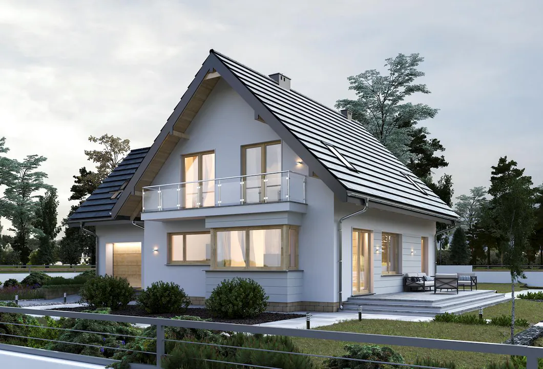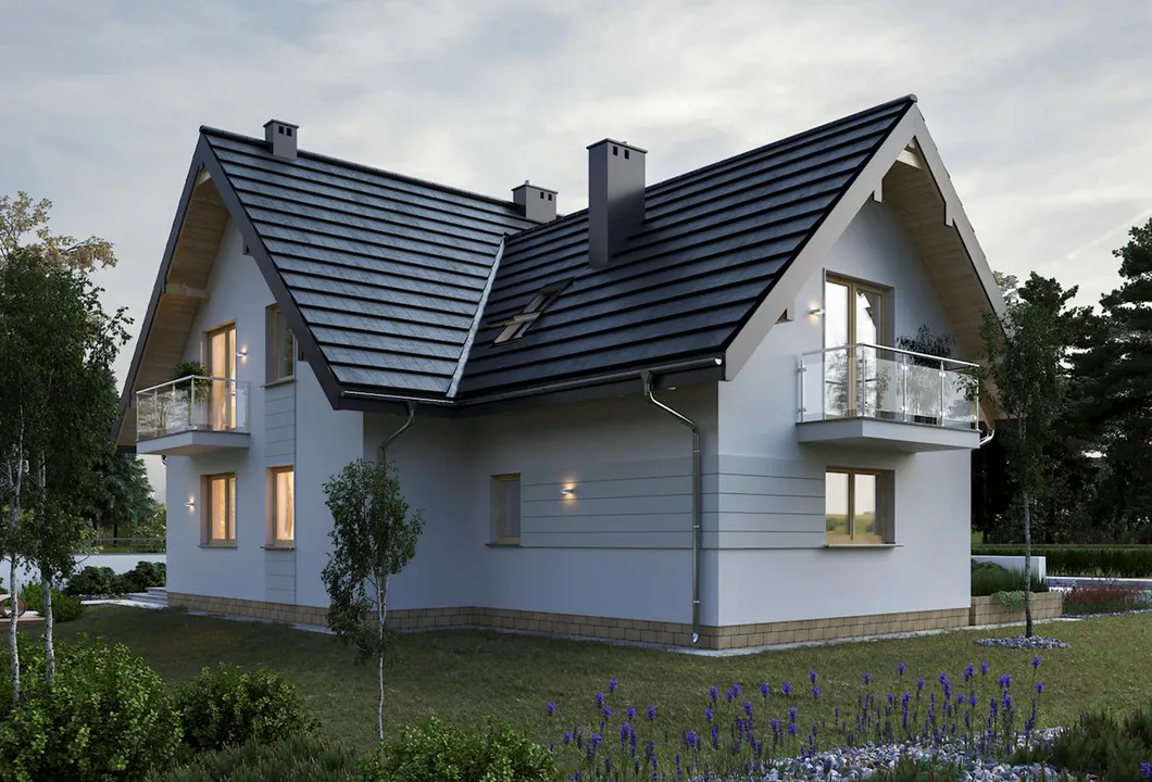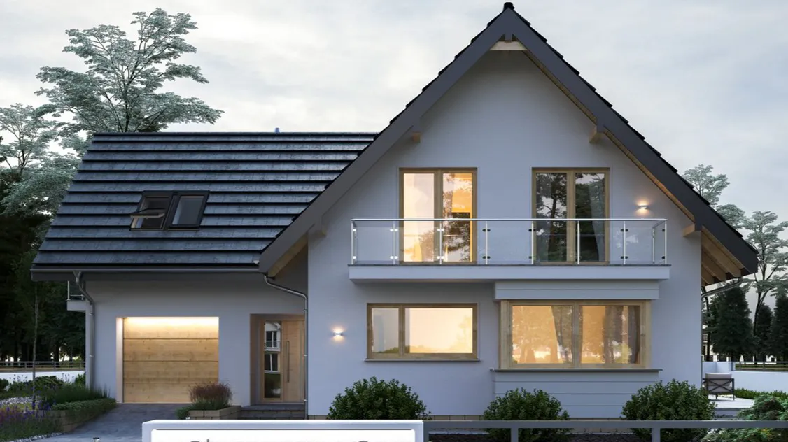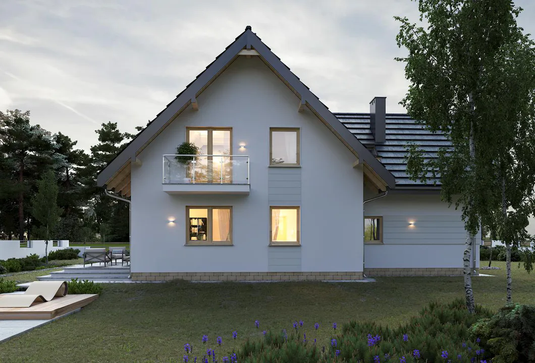 Дом, оформленный в классическом современном стиле, впечатляет привлекательными деталями, такими как эркер на переднем фасаде, красивыми ажурными балконами и изящными мансардными окнами.