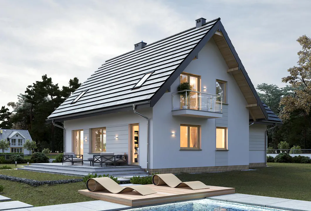 Дом отделан белой штукатуркой, которая отлично сочетается с бежевыми оттенками дерева и темной керамической черепицей.