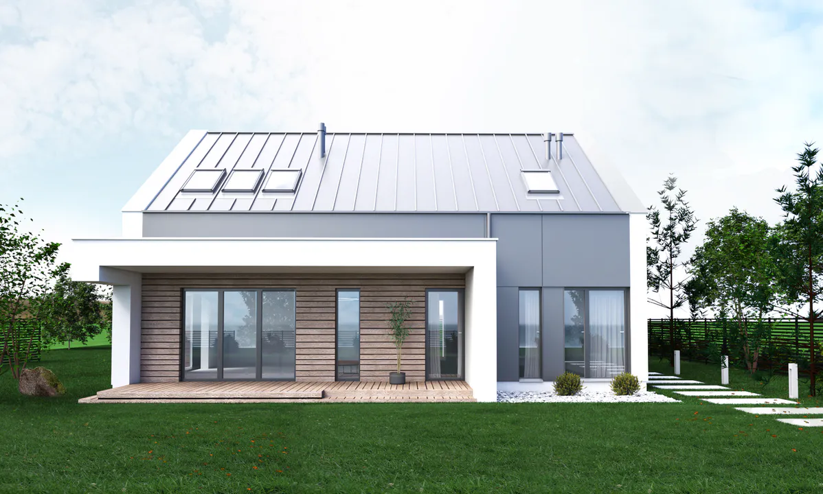 Фасад дома комбинирует белую и серую штукатурку с деревянными элементами, что придает тепло и современность общему виду. Впереди дома есть крытая терраса, оформленная деревом, создающая уютный вход.