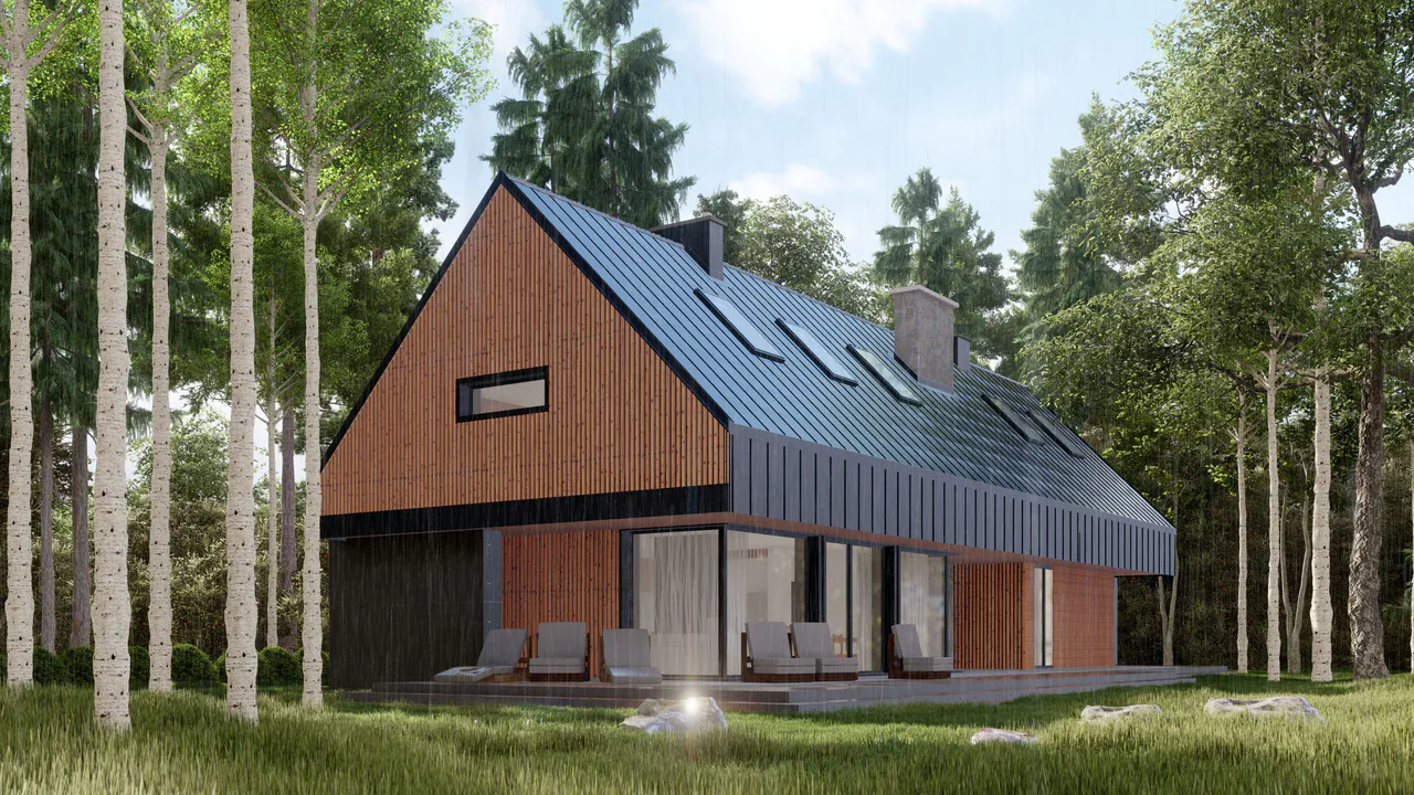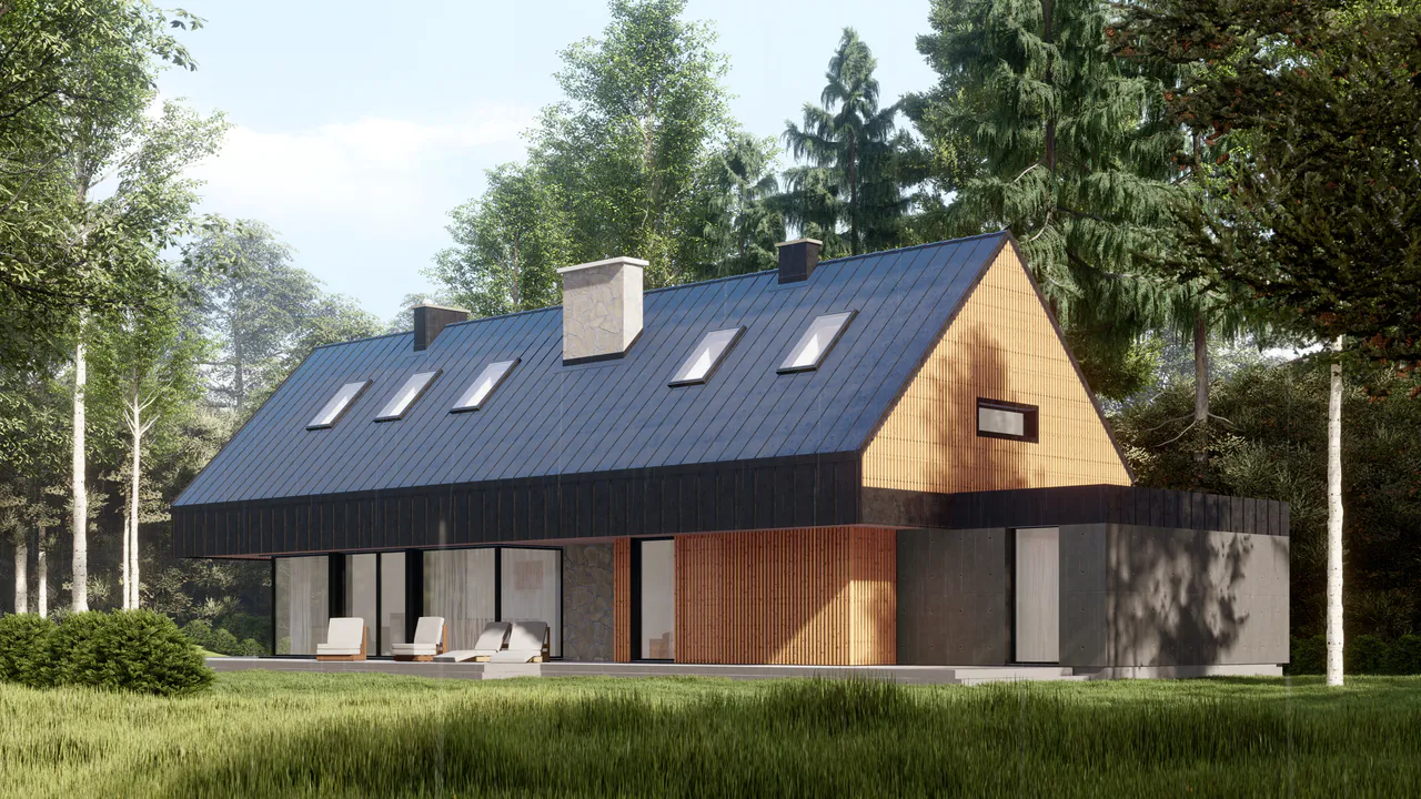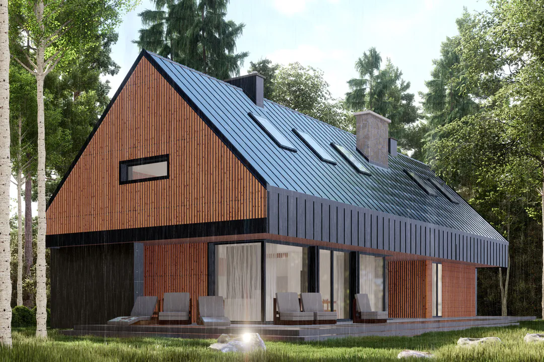Крыша представляет собой симметричную двускатную крышу, покрытую фальцевым листовым металлом. Фасады отделаны деревянной опалубкой и фальцевыми листами.