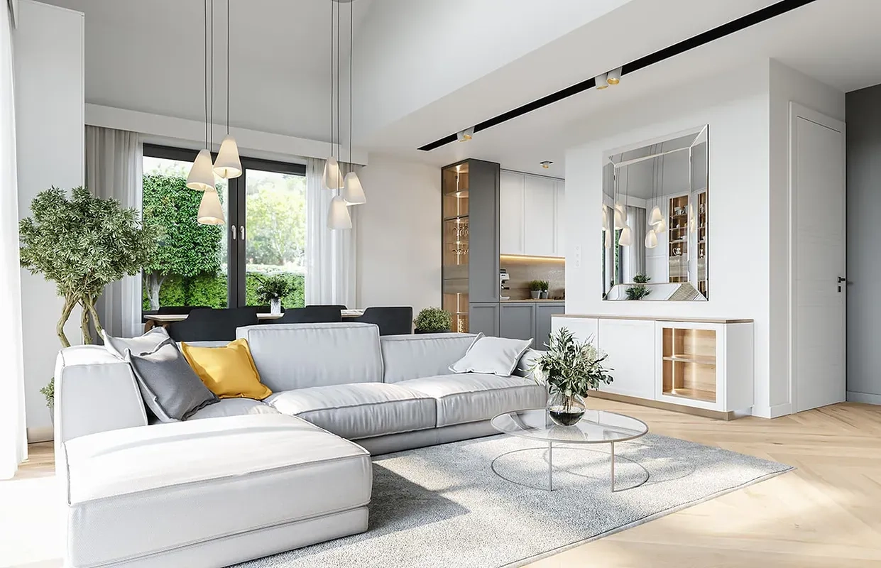 Непременно произведет впечатление представительный вход в дом, пустота над гостиной, и огромное остекление. Такой дом создает ощущение величия и простора, что делает его действительно впечатляющим.