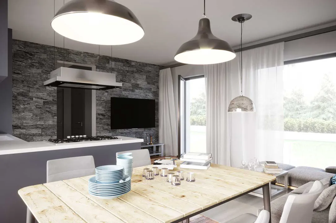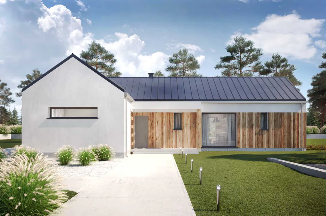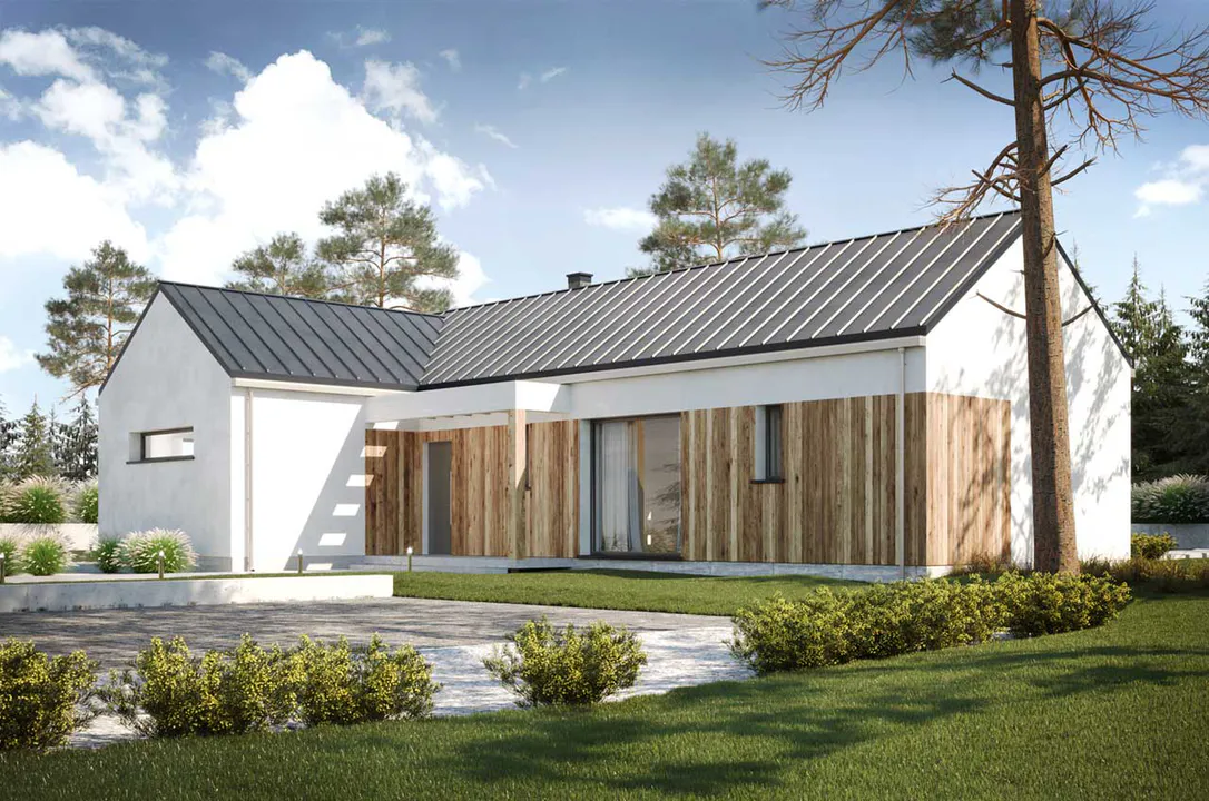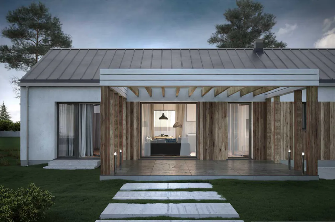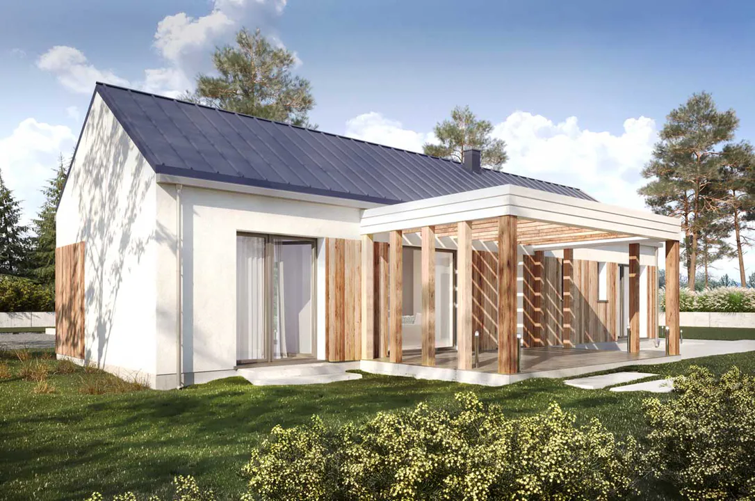 Проект небольшого одноэтажного дома в скандинавском стиле, с террасой крытой перголой.