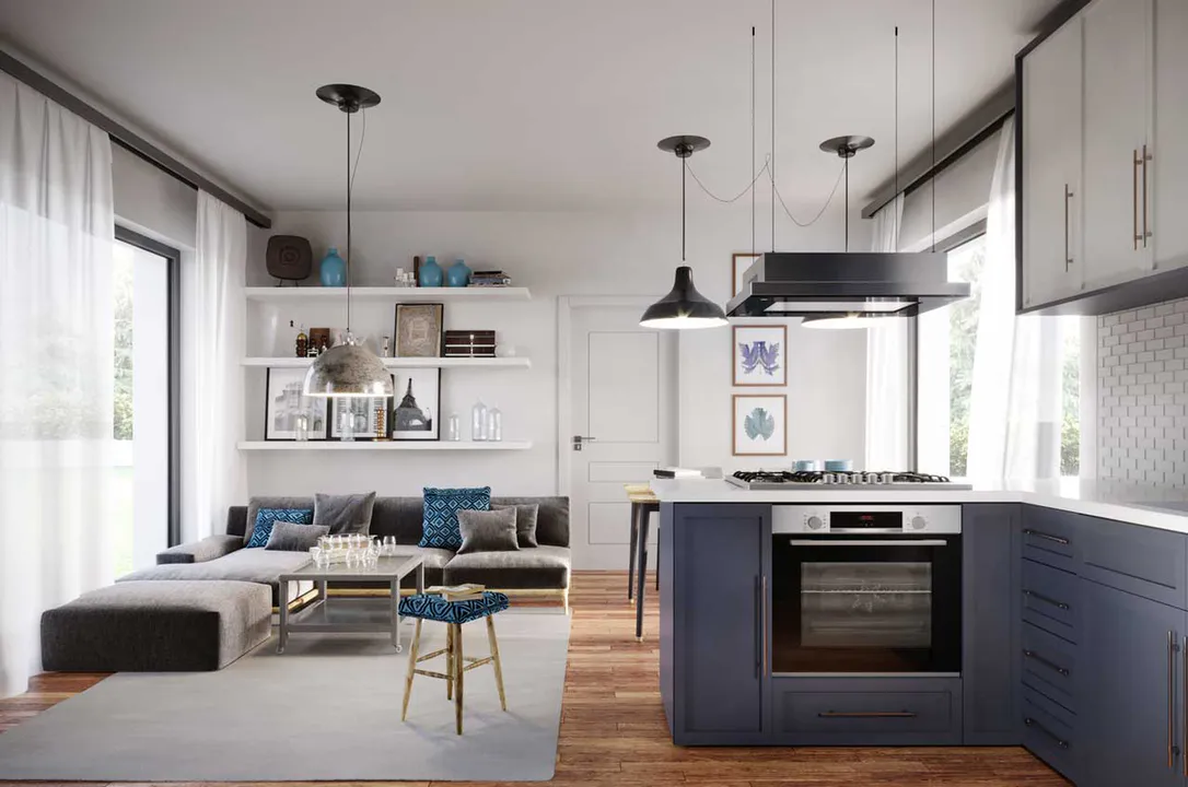Внутреннее пространство очень хорошо освещается большими окнами, что в сочетании с большой террасой создает ощущение простора, несмотря на небольшую площадь.