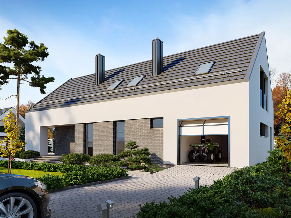 Современный, минималистичный характер здания достигнут благодаря фасаду, отделанному белой штукатуркой, которую разнообразила серая фасадная плитка. Двускатная крыша без карниза была покрыта металлочерепицей.