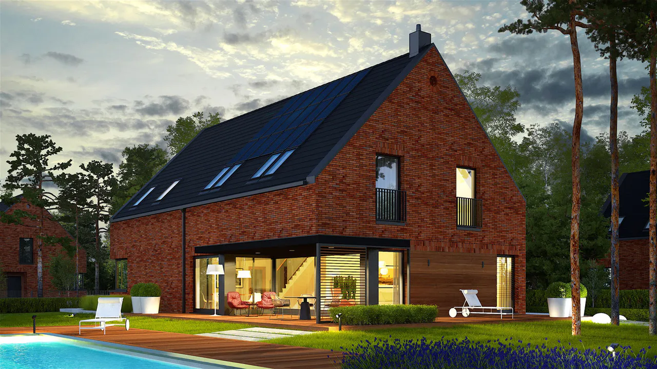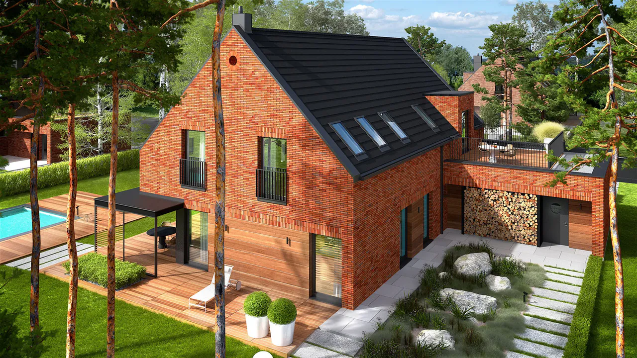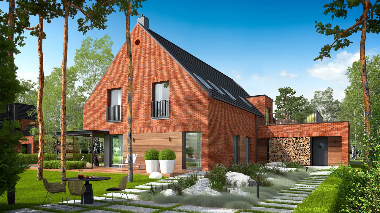 Фасад покрыт облицовочным клинкерным кирпичом, а входная зона и терраса выделены деревянными панелями.