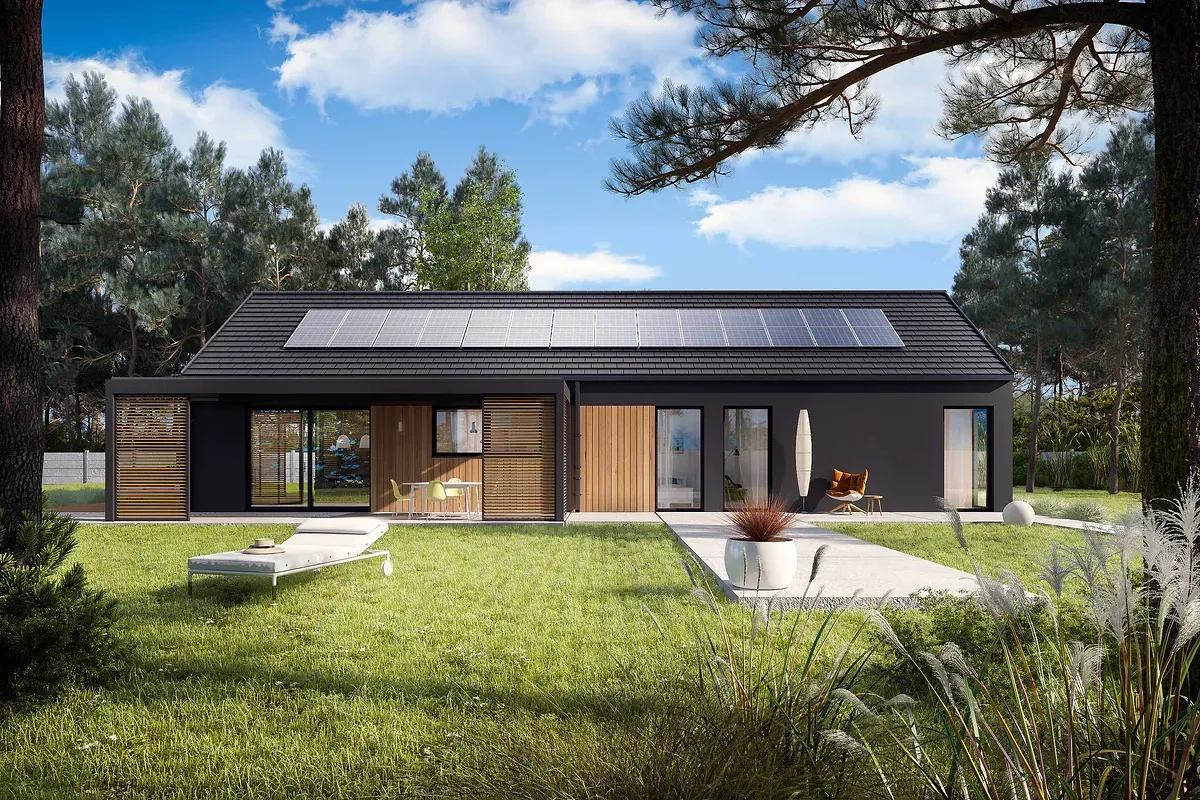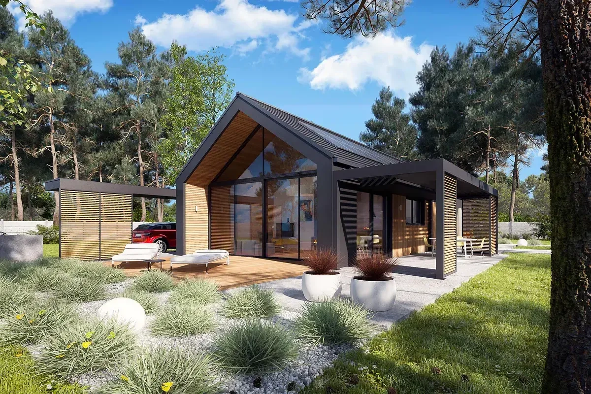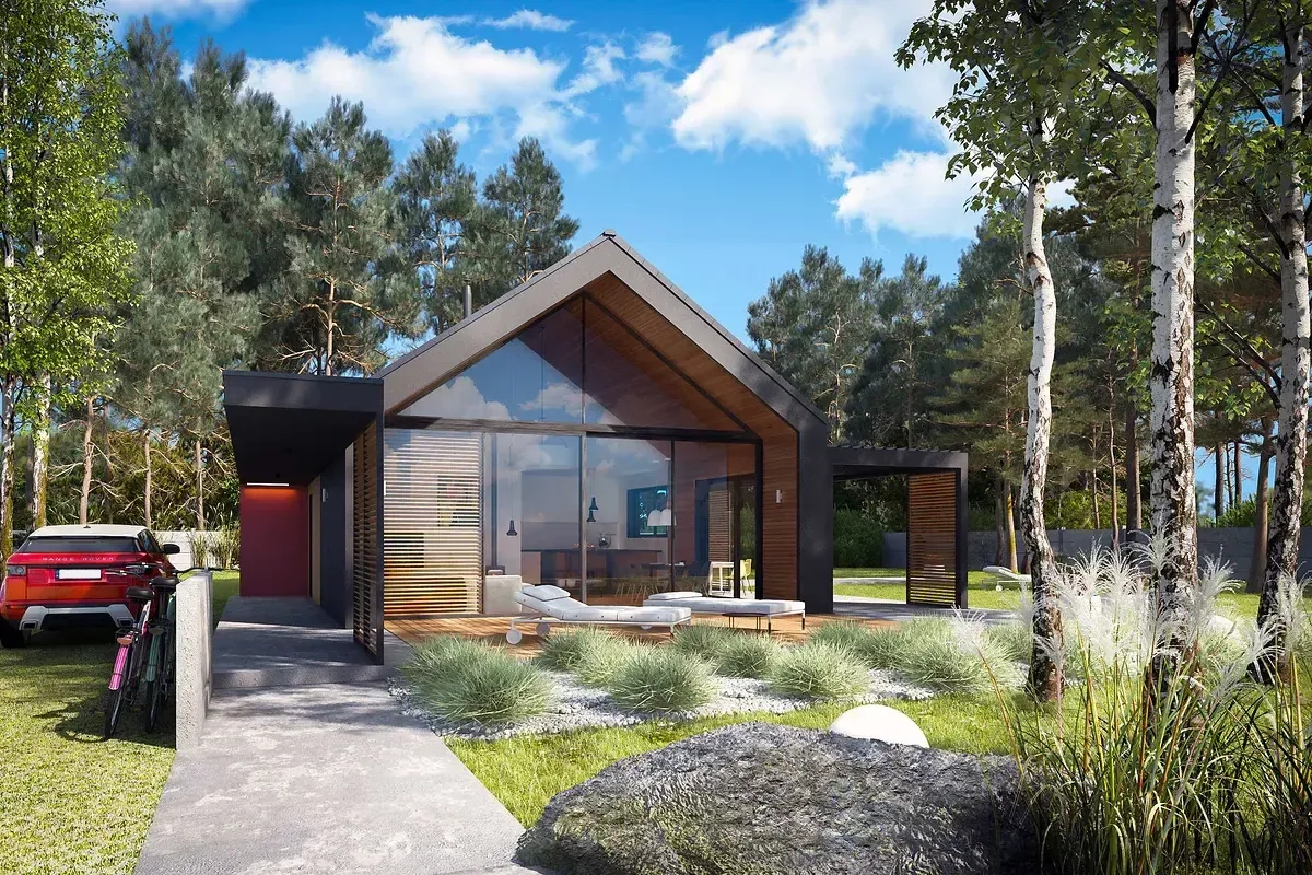 Проект одноэтажного дома с террасой, простой и быстрый в строительстве, подходит для узкого участка и рассчитан на 3-4 человек.