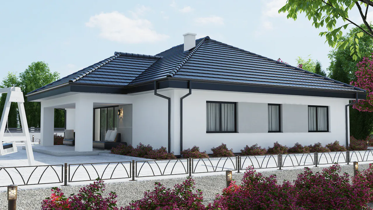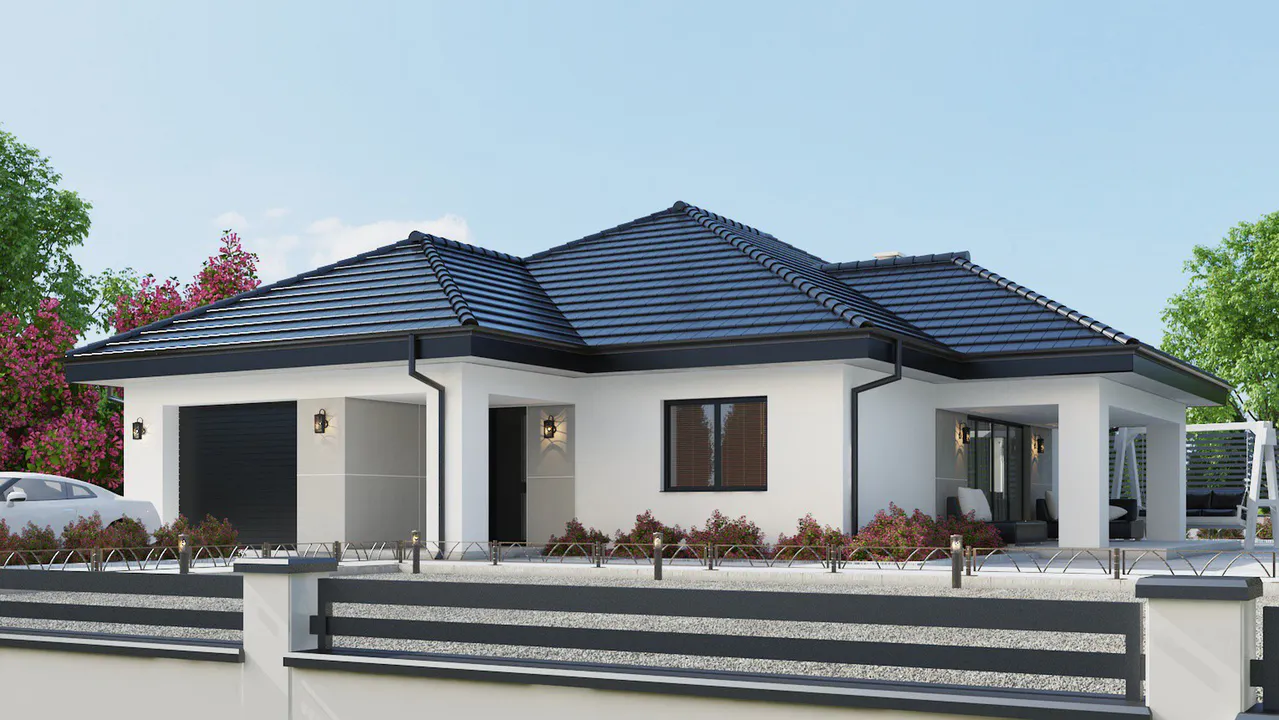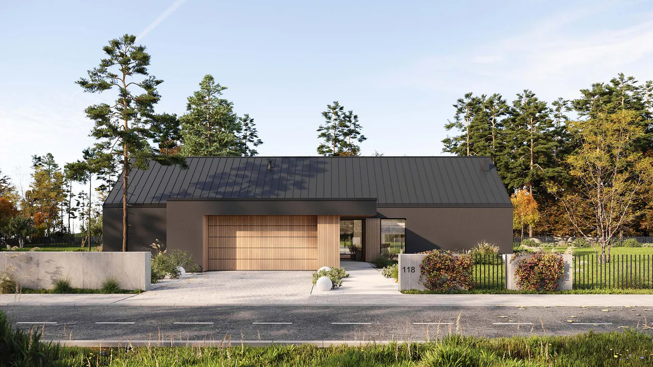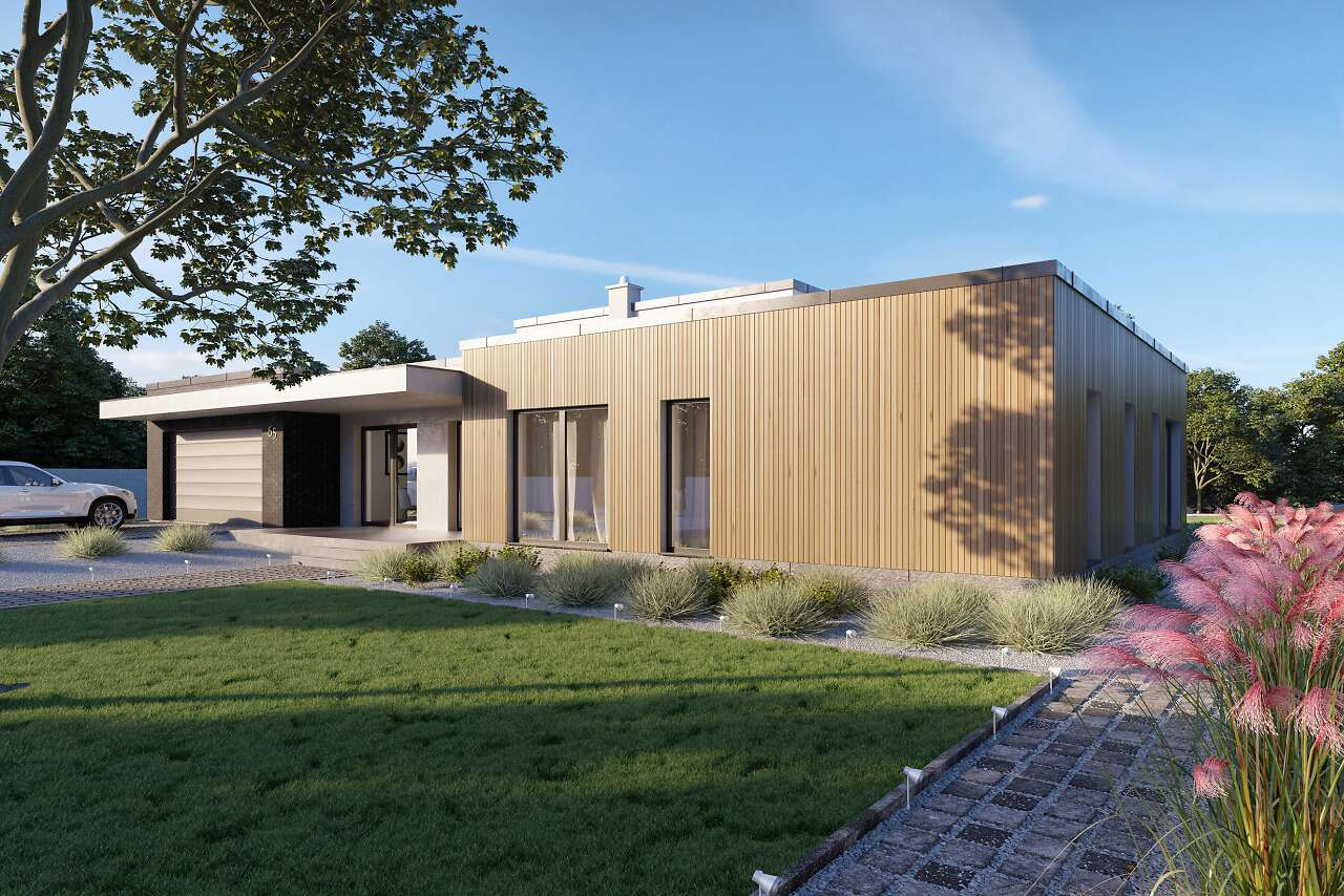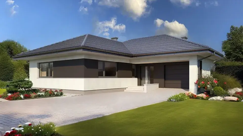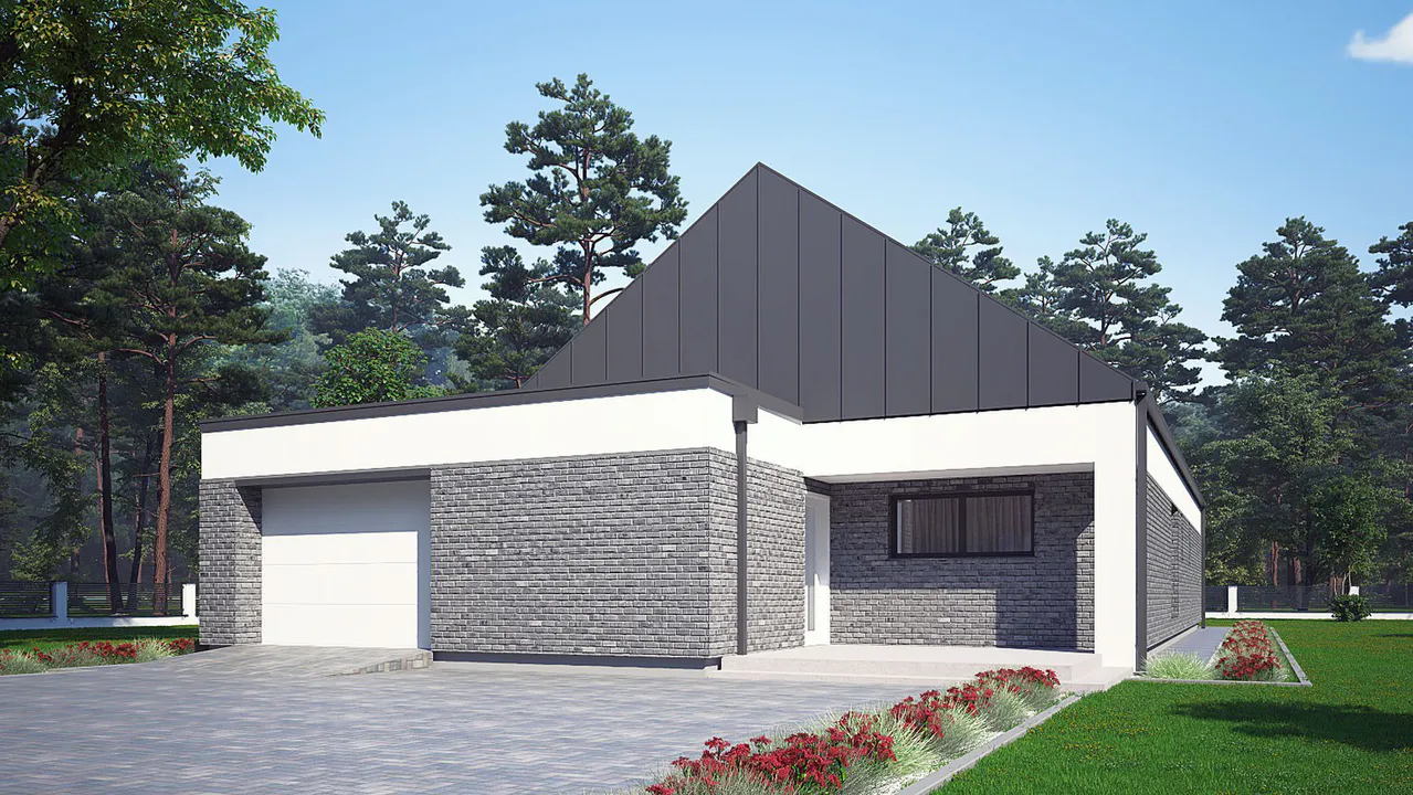 Проект современного одноэтажного дома с гаражом и террасой.