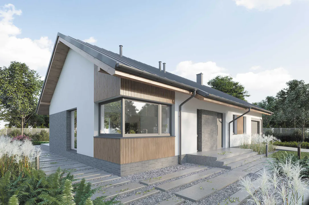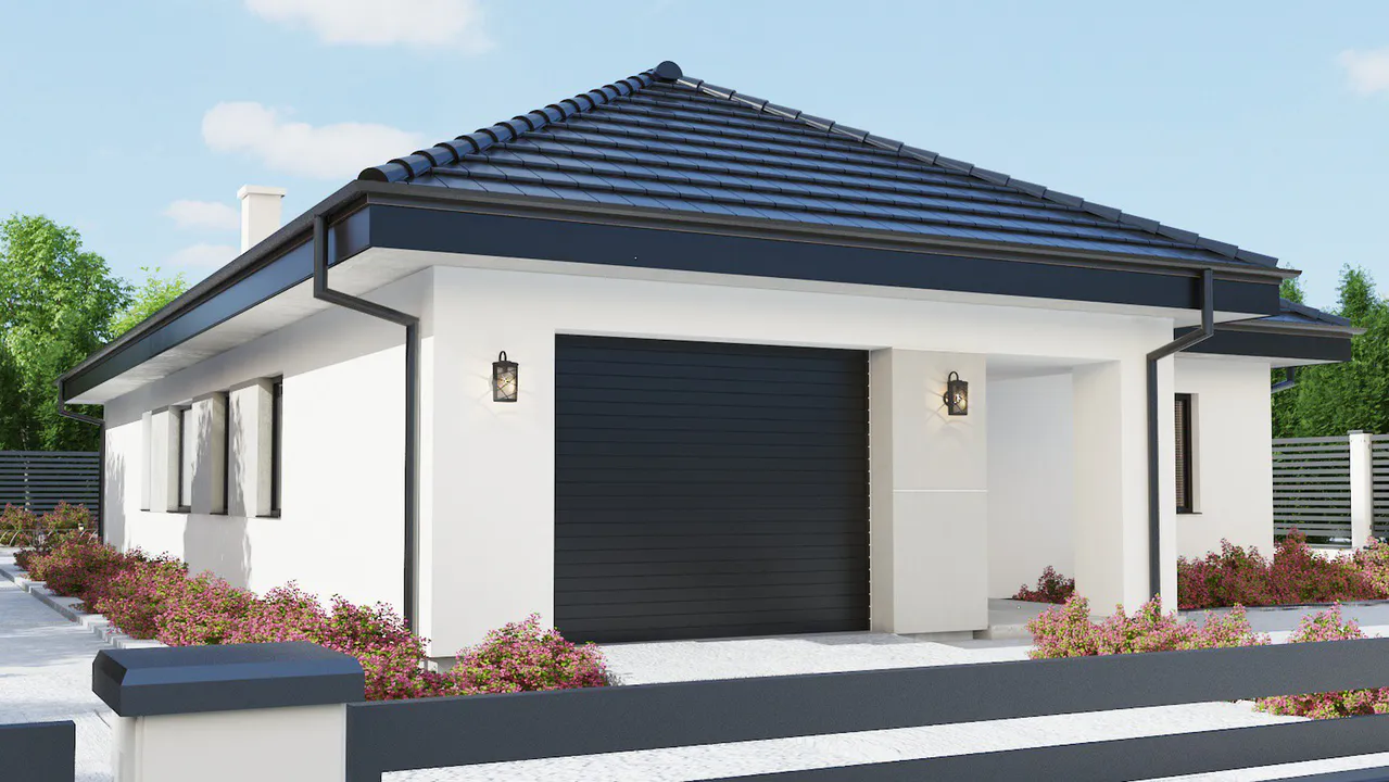 Элегантно отделанный фасад в светлых тонах прекрасно контрастирует с графитовыми оконными рамами, гаражными воротами и дверью, а также черепицей на крыше.