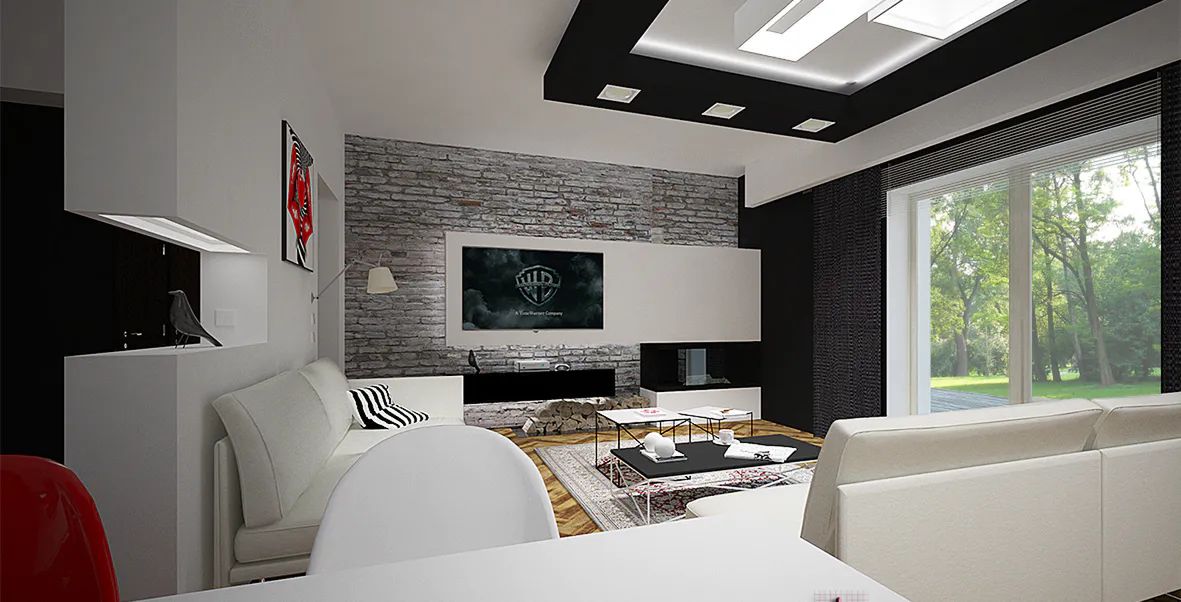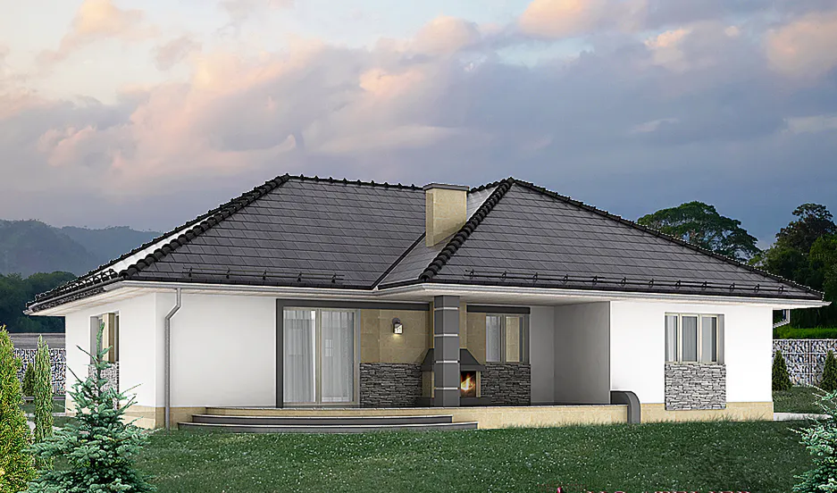 Крытая терраса, включенная в проект отлично дополняет гостиную. Она становится уютным местом для отдыха и общения, а уличный камин создает атмосферу уюта и тепла.