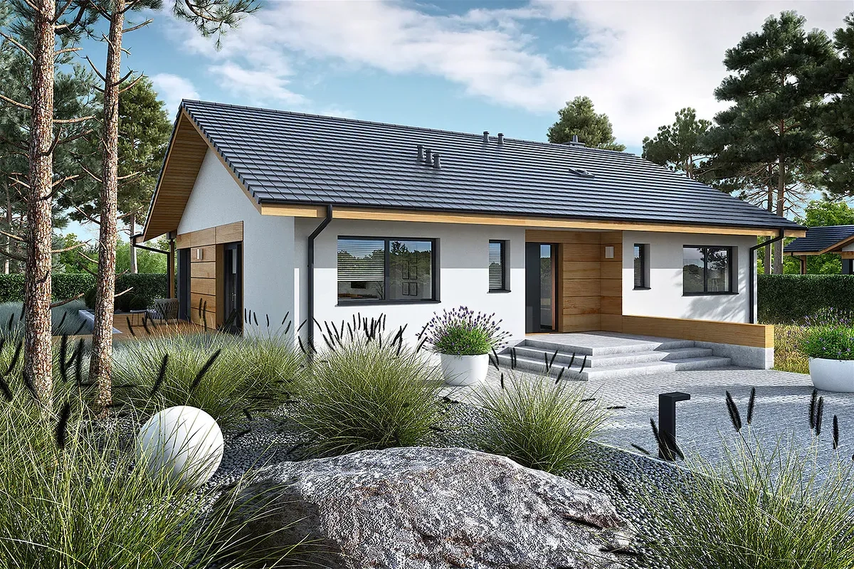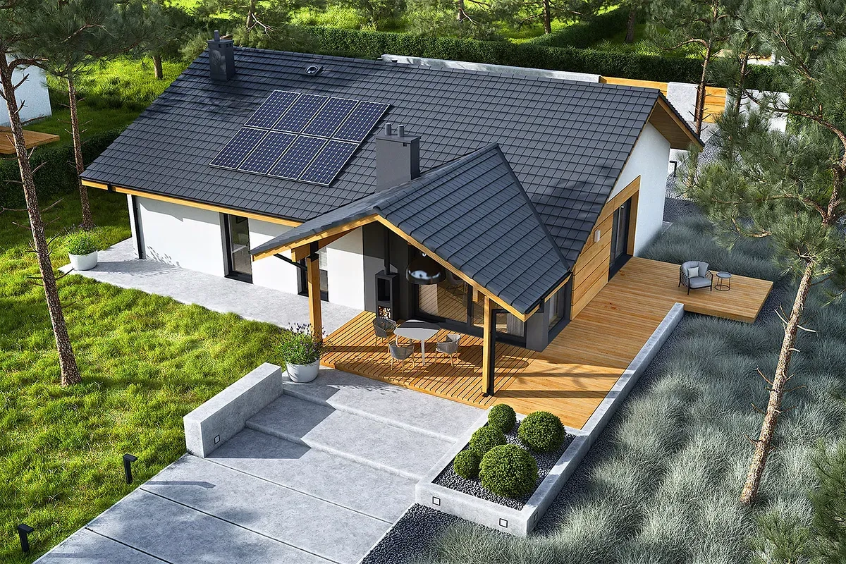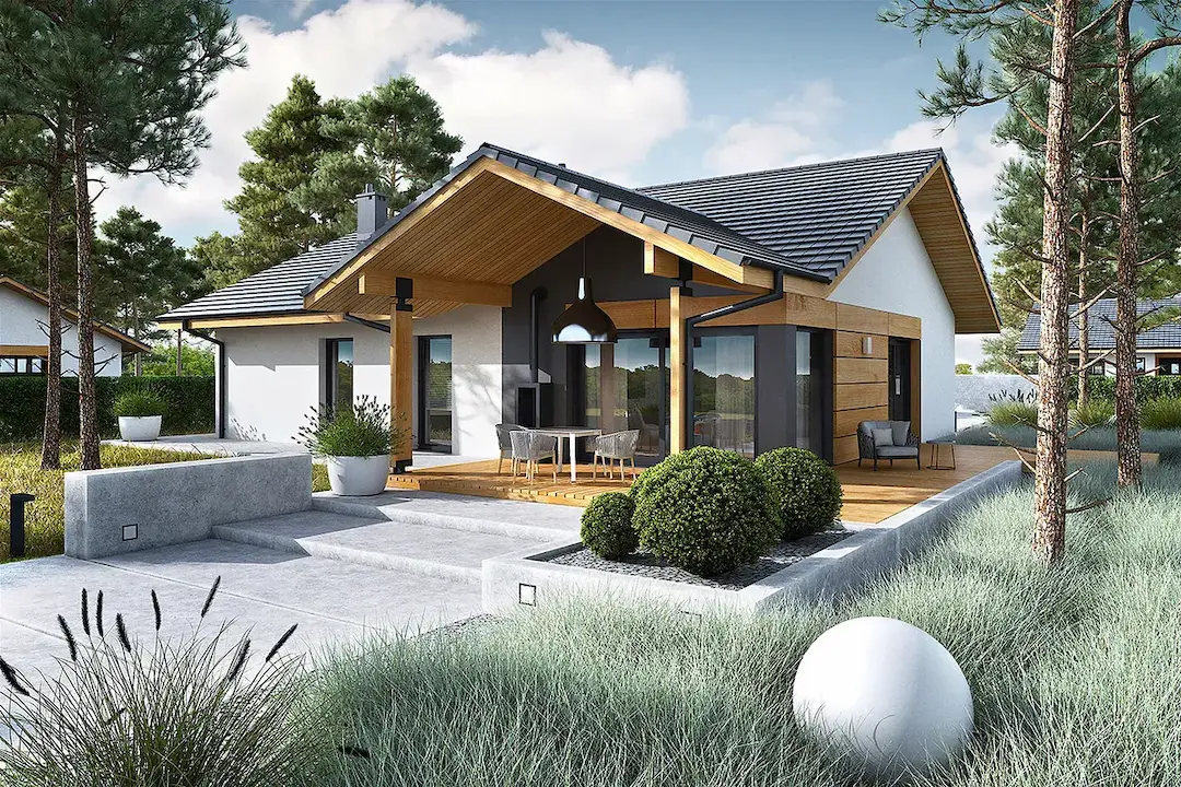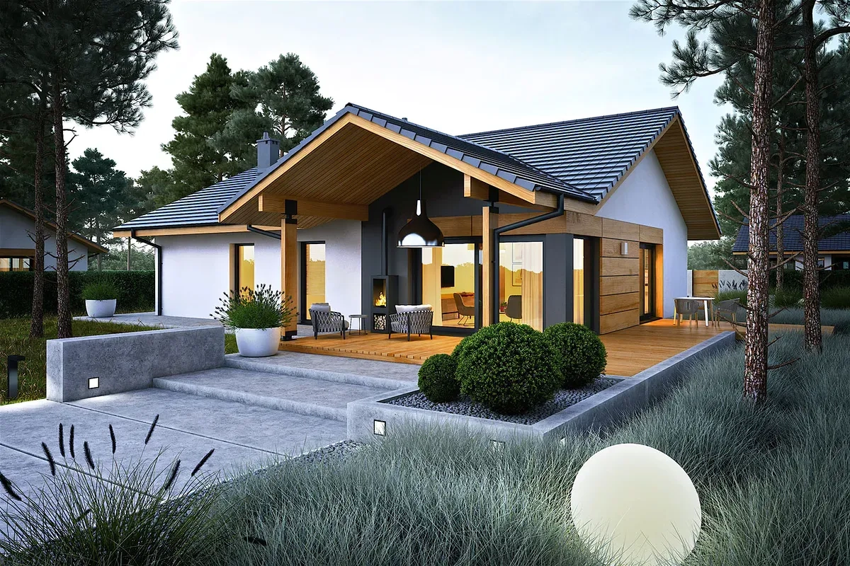 Современные материалы и стильный дизайн фасада придают дому современный и эстетичный вид. Крытая терраса с камином предоставит прекрасное место для отдыха и развлечений на свежем воздухе в любое время года.