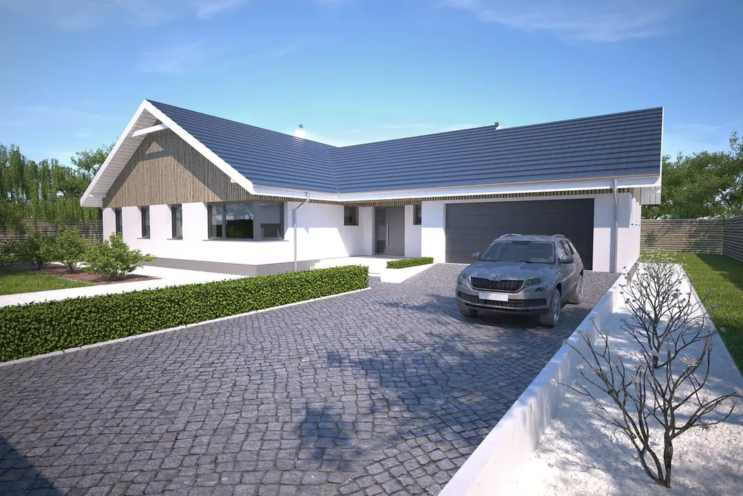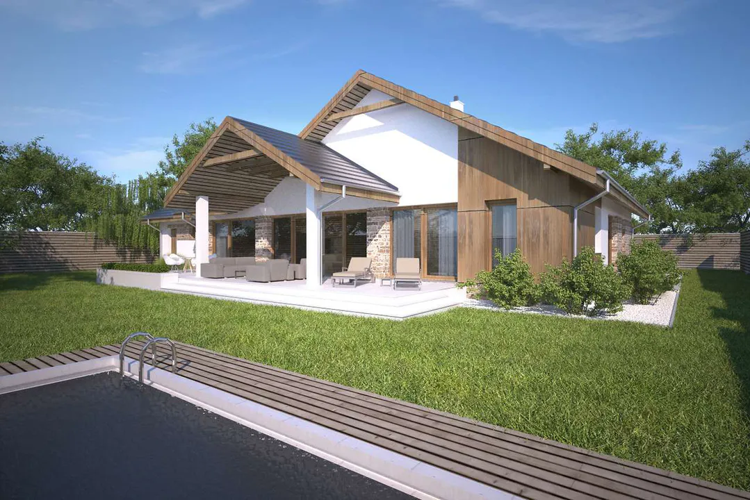 Фасад дома преимущественно белого цвета, покрытый штукатуркой, дополнен элементами из деревянных панелей.