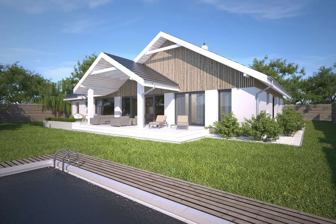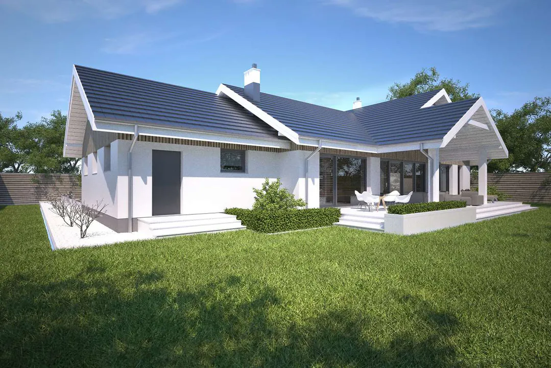 Терраса в задней части дома имеет двускатную крышу, которая защищает садовую мебель.