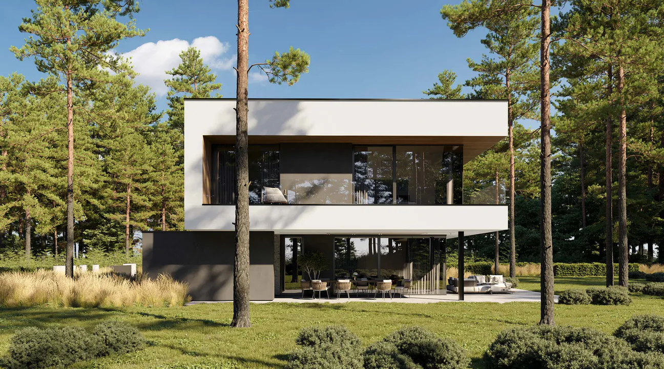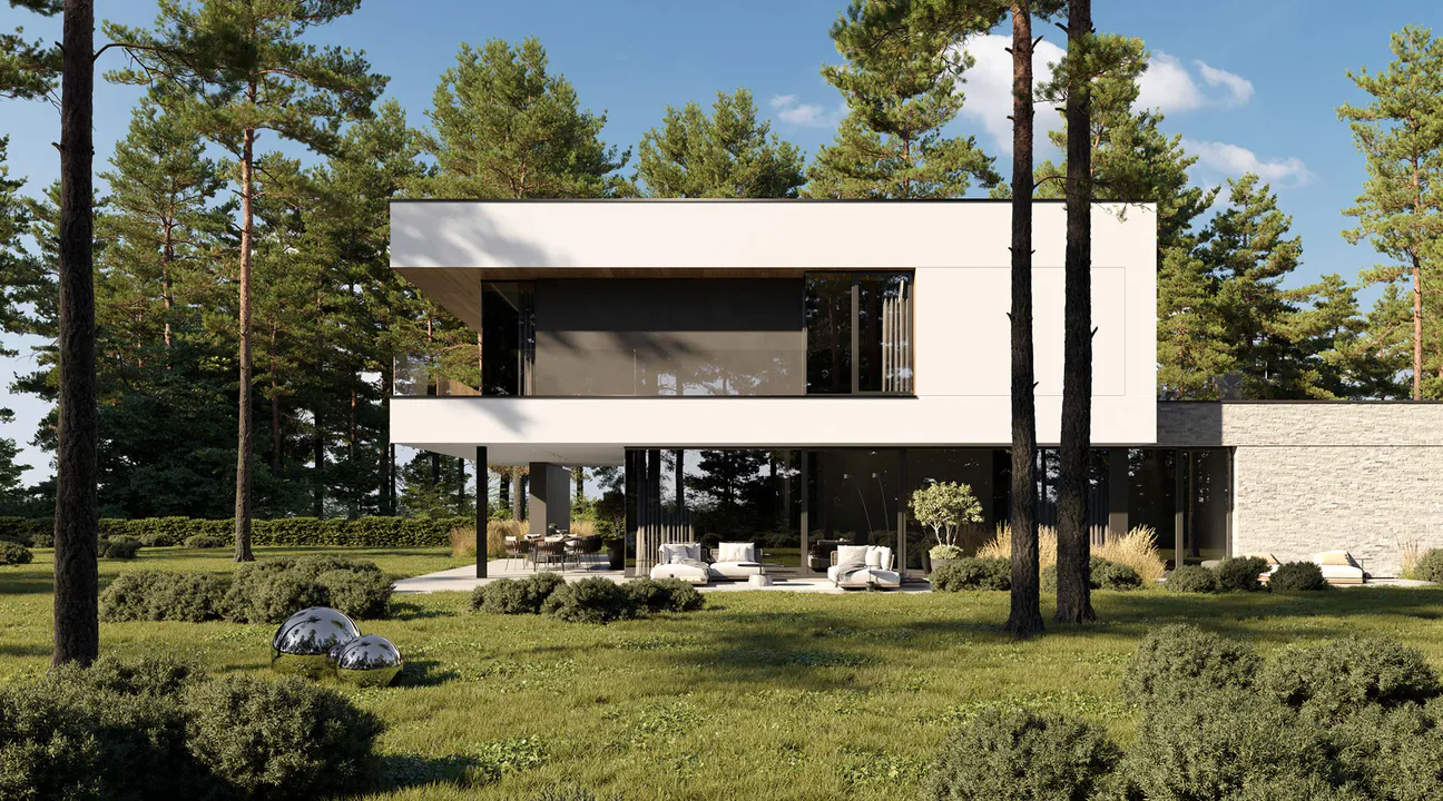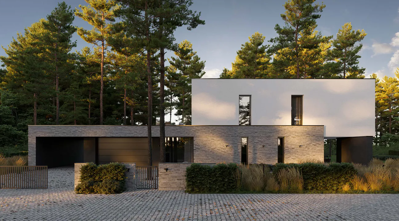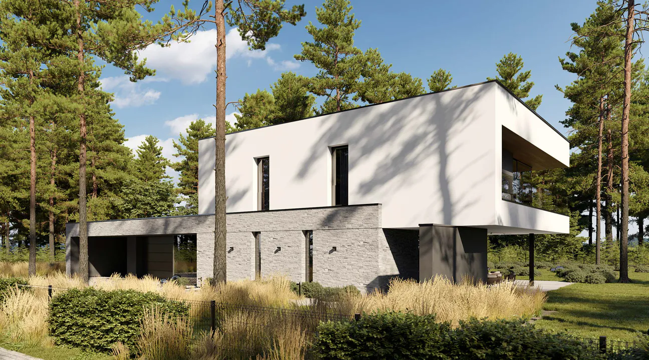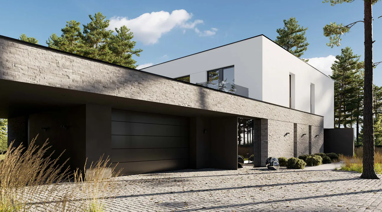 Светлый оттенок силиконовой штукатурки прекрасно вписывается в концепцию современного минимализма, а фасадный камень и фасадная доска добавляют текстурный интерес, создавая нежный контраст.
