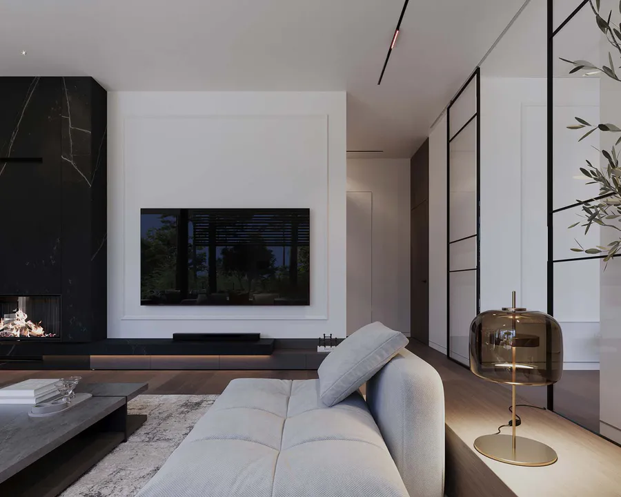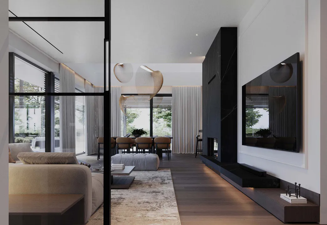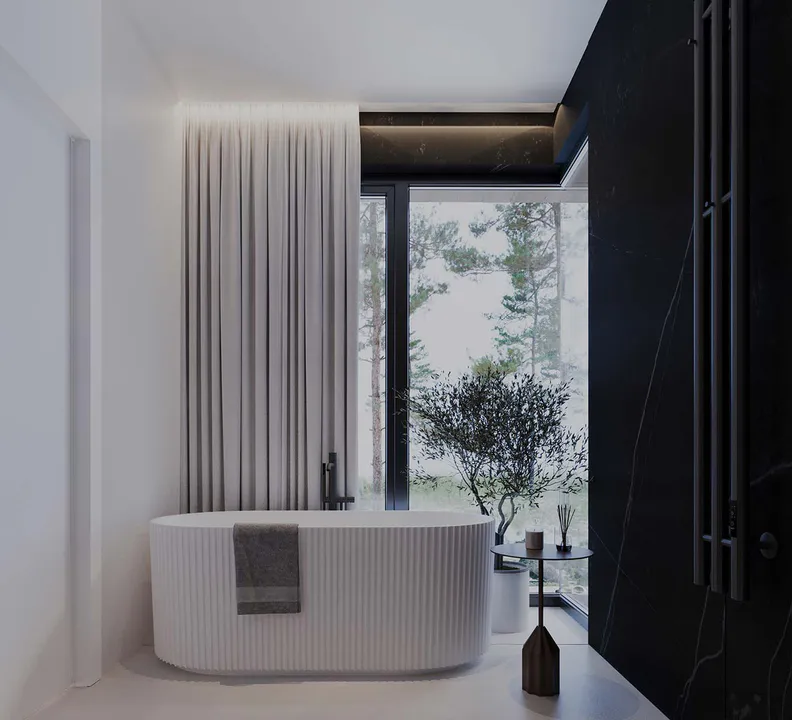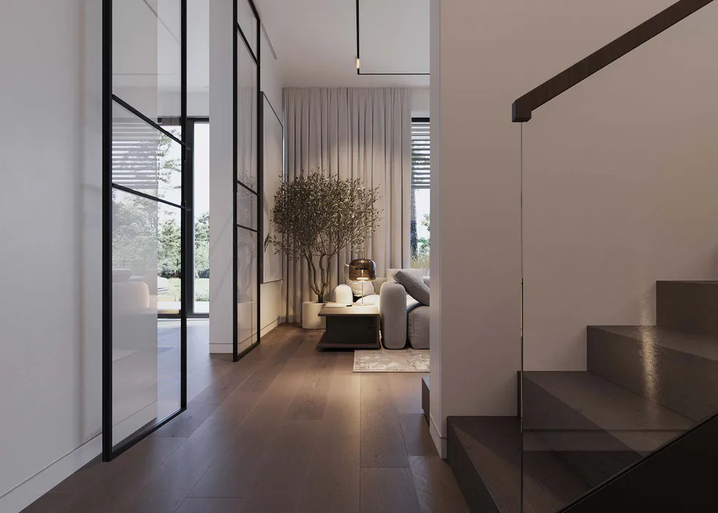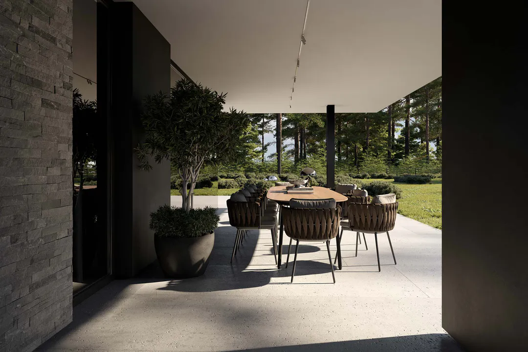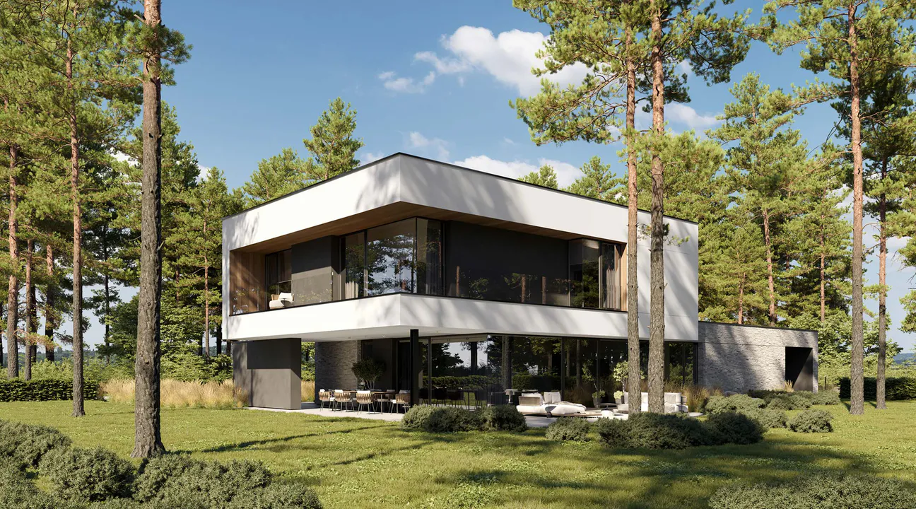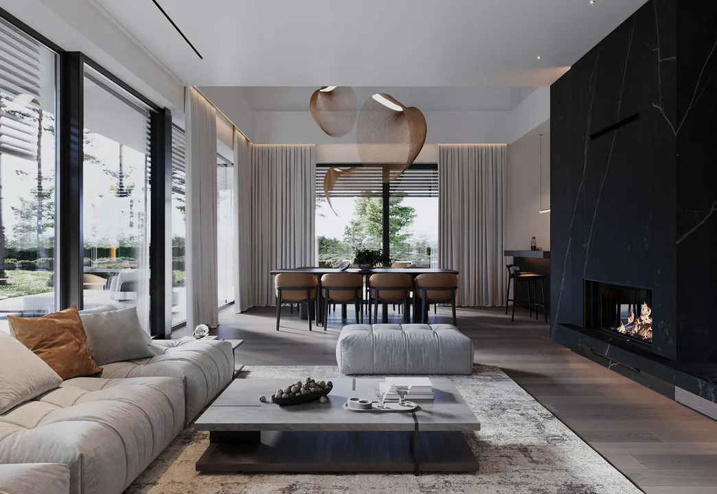 Светлый оттенок силиконовой штукатурки прекрасно вписывается в концепцию современного минимализма, а фасадный камень и фасадная доска добавляют текстурный интерес, создавая нежный контраст.