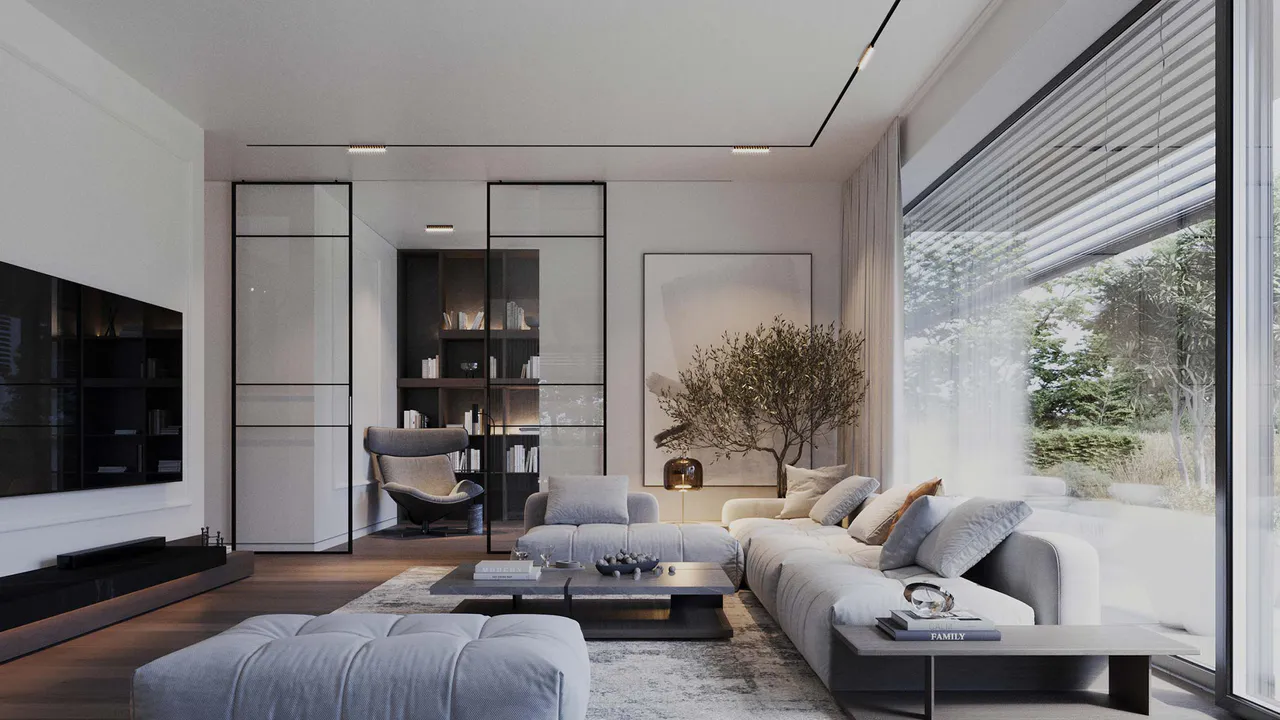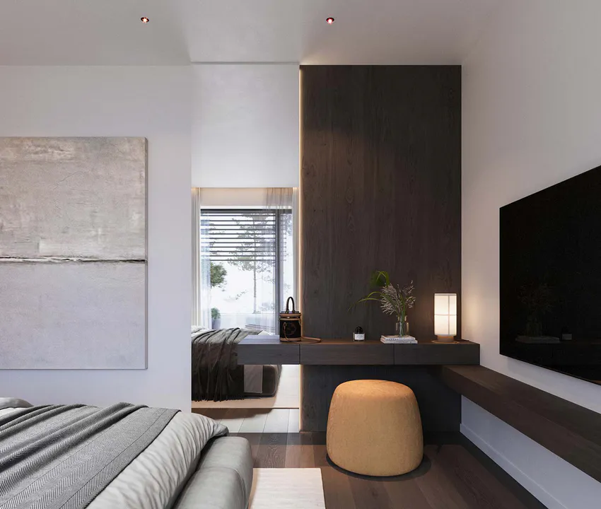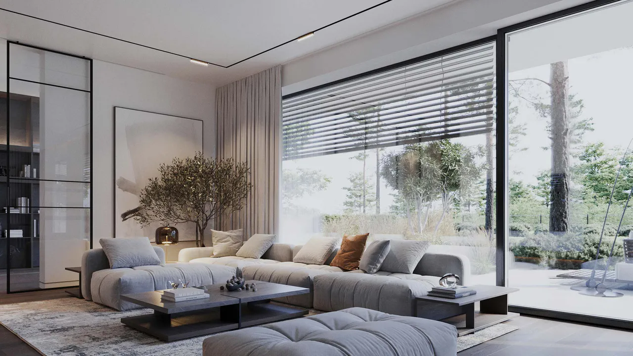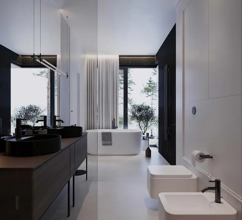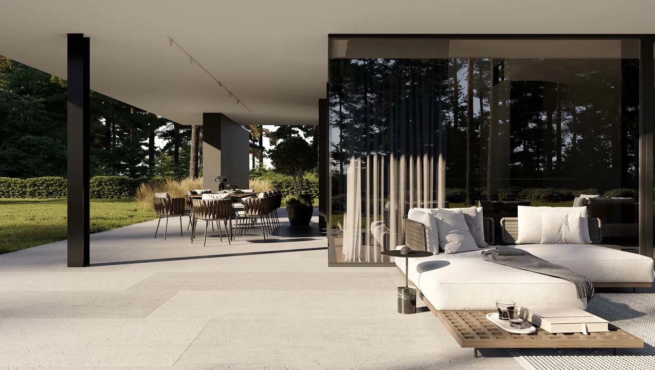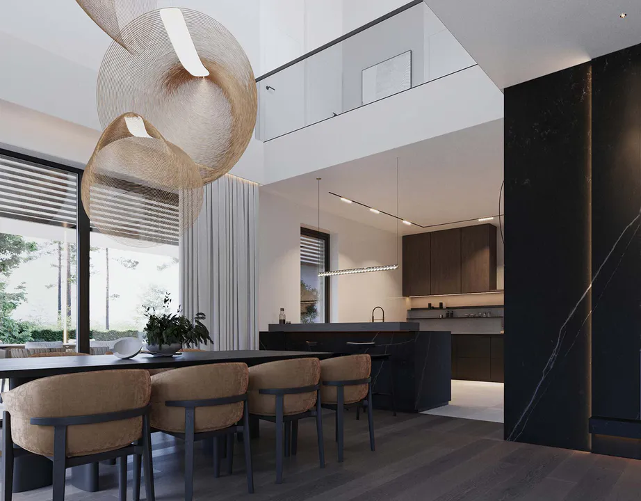 Светлый оттенок силиконовой штукатурки прекрасно вписывается в концепцию современного минимализма, а фасадный камень и фасадная доска добавляют текстурный интерес, создавая нежный контраст.